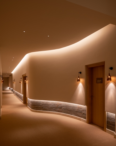 Extensive cove lighting is used to introduce an element of openness to the space bringing the feeling of a large cave, but in a more refined implementation.