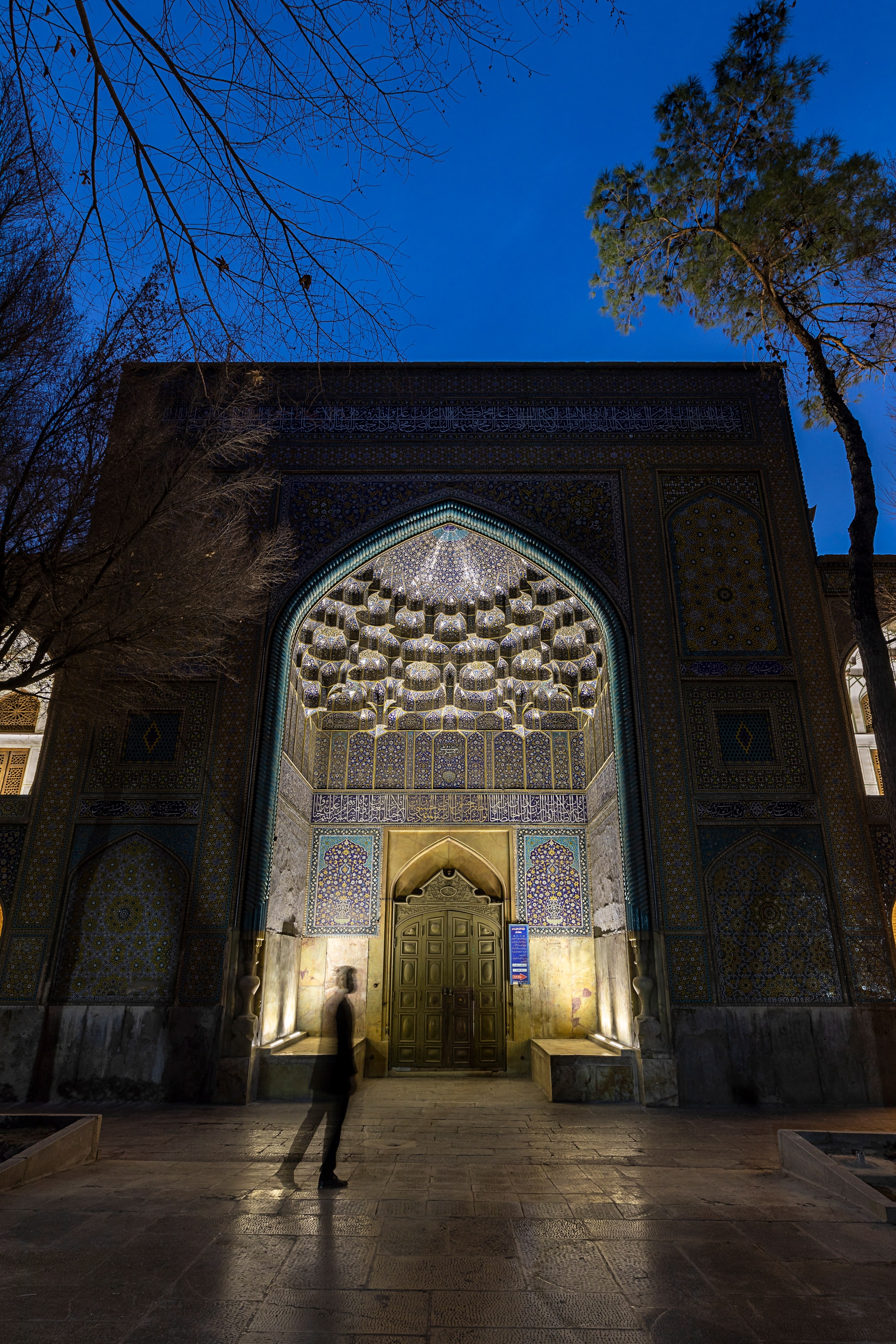 The unique charm of this school starts from its entrance. The entrance gate with its artistic and delicate tiling, the Nastaliq inscription on the blue tiles, and the marble platforms next to the entrance door convey the pleasant feeling of traditional architecture.