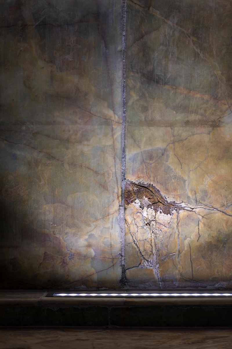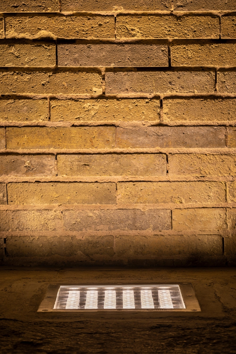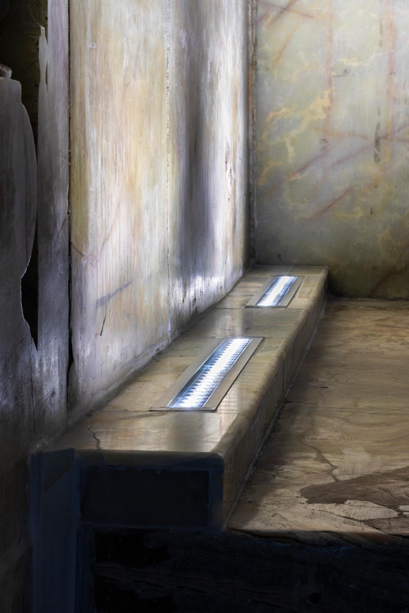 Given the depiction of the richly patterned Muqarnas, which has compounded the luxury and splendor of the entrance, the linear lights are placed in a marble box with a length of 340, a width of 18, and a height of 8 cm, according to the material of the entrance platform and in order not to damage the historic stones of the façade, the new material is connected to the existing body by foam insulation that is placed in the space between the two materials. Also, to achieve uniform illumination of the entrance and reduce glare, light sources with asymmetric light distribution with a deviation of 20 degrees from the horizon axis with a color temperature of 5000K.