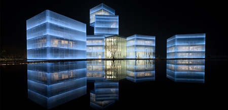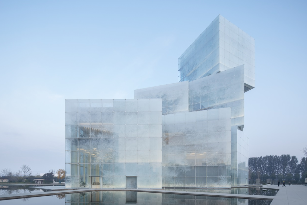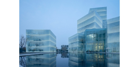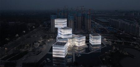 This is a contextual building designed by Zone of Utopia Qiang ZOU and Mathieu Forest architecte. 9 "ice cubes" are superposed and offset from each other , twisting and staggering, forming a complex and dynamic volume, expressing the theme of ice and snow leisure sports in the cultural tourism city.