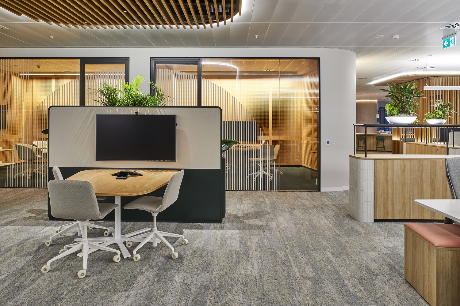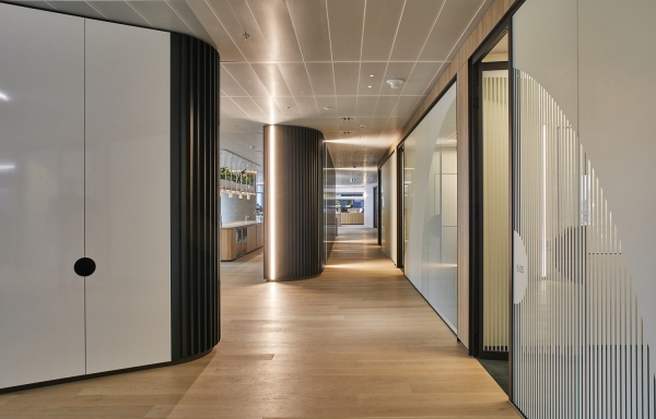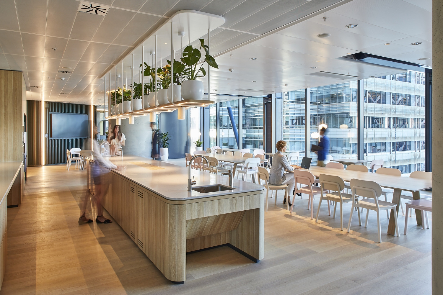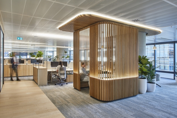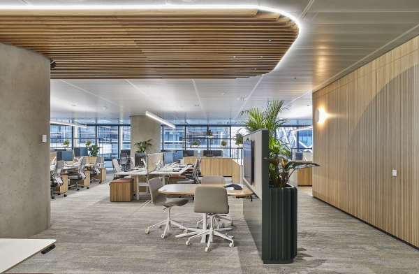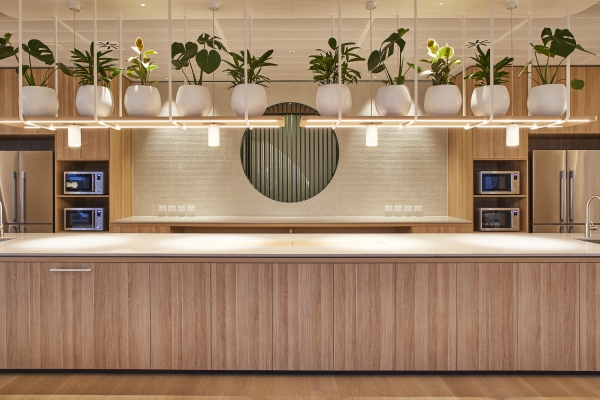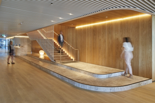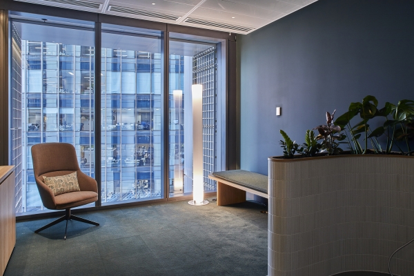 A diversity of luminaire types including feature lamps blends tangible light sources and concealed luminaires creating an ambient glow. Through thoughtful decisions around light levels and lighting colour temperatures, the design provides for intuitive wayfinding and visual delineation of activity areas. A natural logic is created for occupants from calm focus areas and tranquil contemplation zones to activated areas for collaboration.