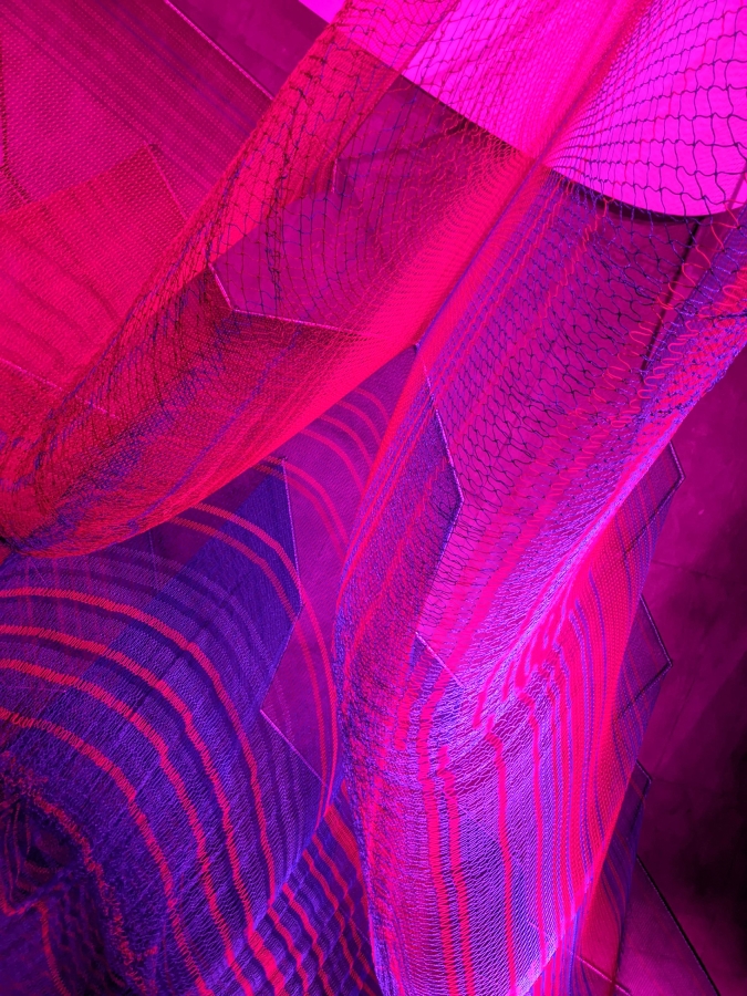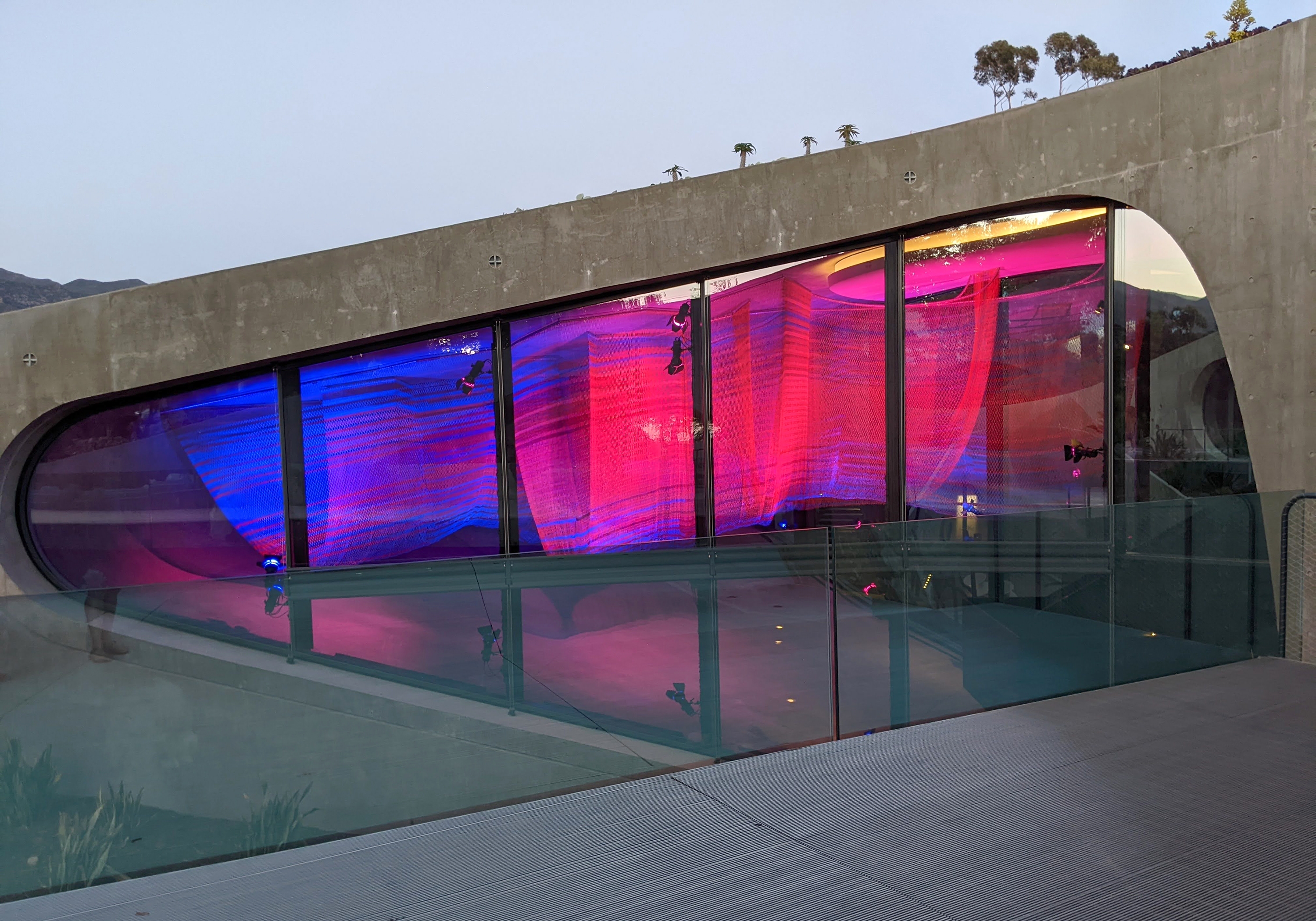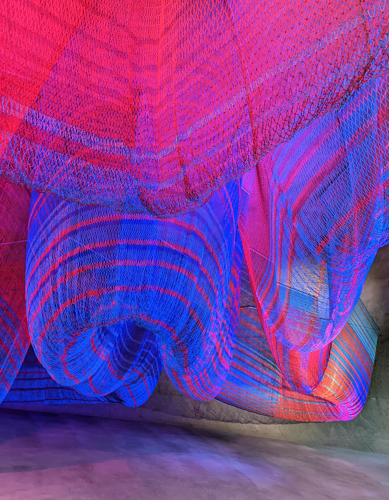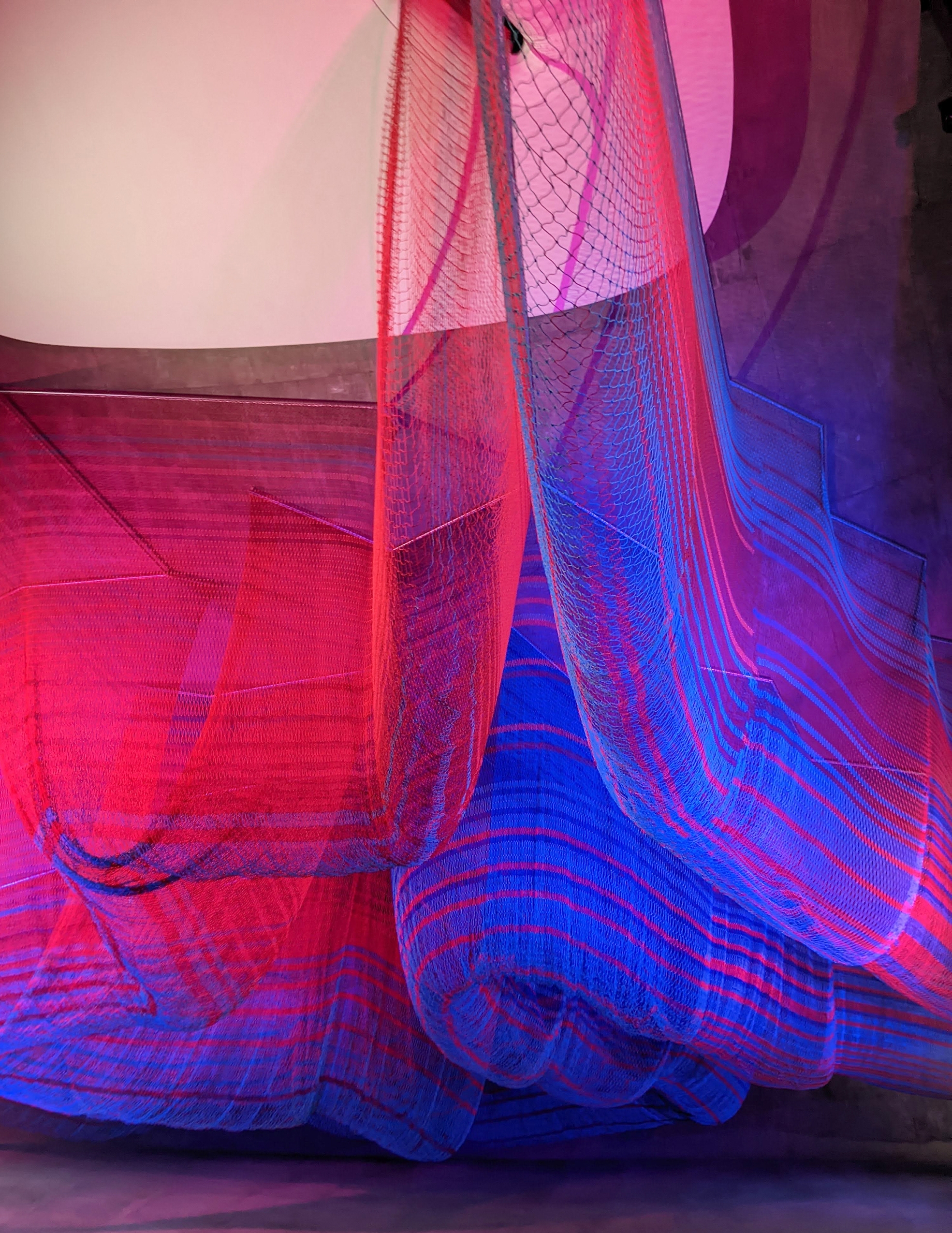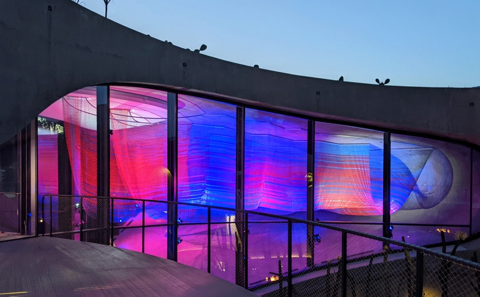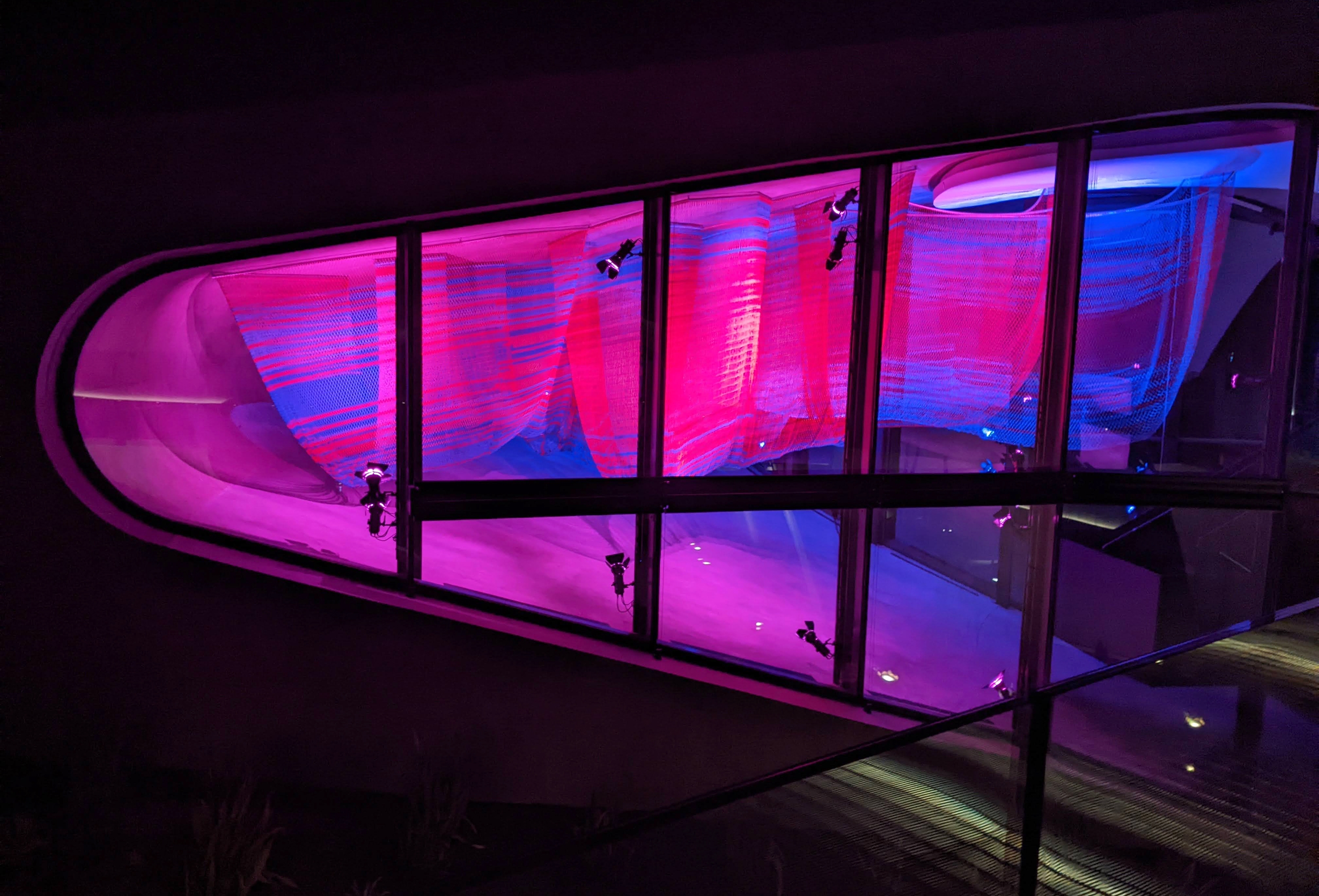 Entry DescriptionDesigned for the Gallery space of the Hill House, Enfold is a suspended net sculpture, filling the volume bounded by glass curtain walls and a curving plane that is both ceiling and floor. The piece is visible from many vantage points, from above and below, interior and exterior, and the stair that sweeps through it. Quiet and beautiful in daylight, Enfold anchors the night-time experience of the house, continually transforming with dynamic lighting.