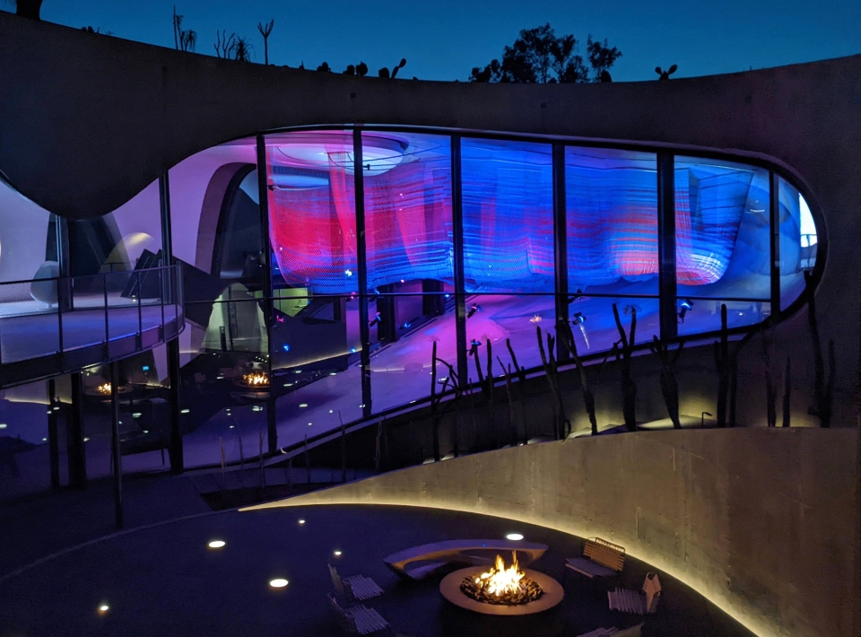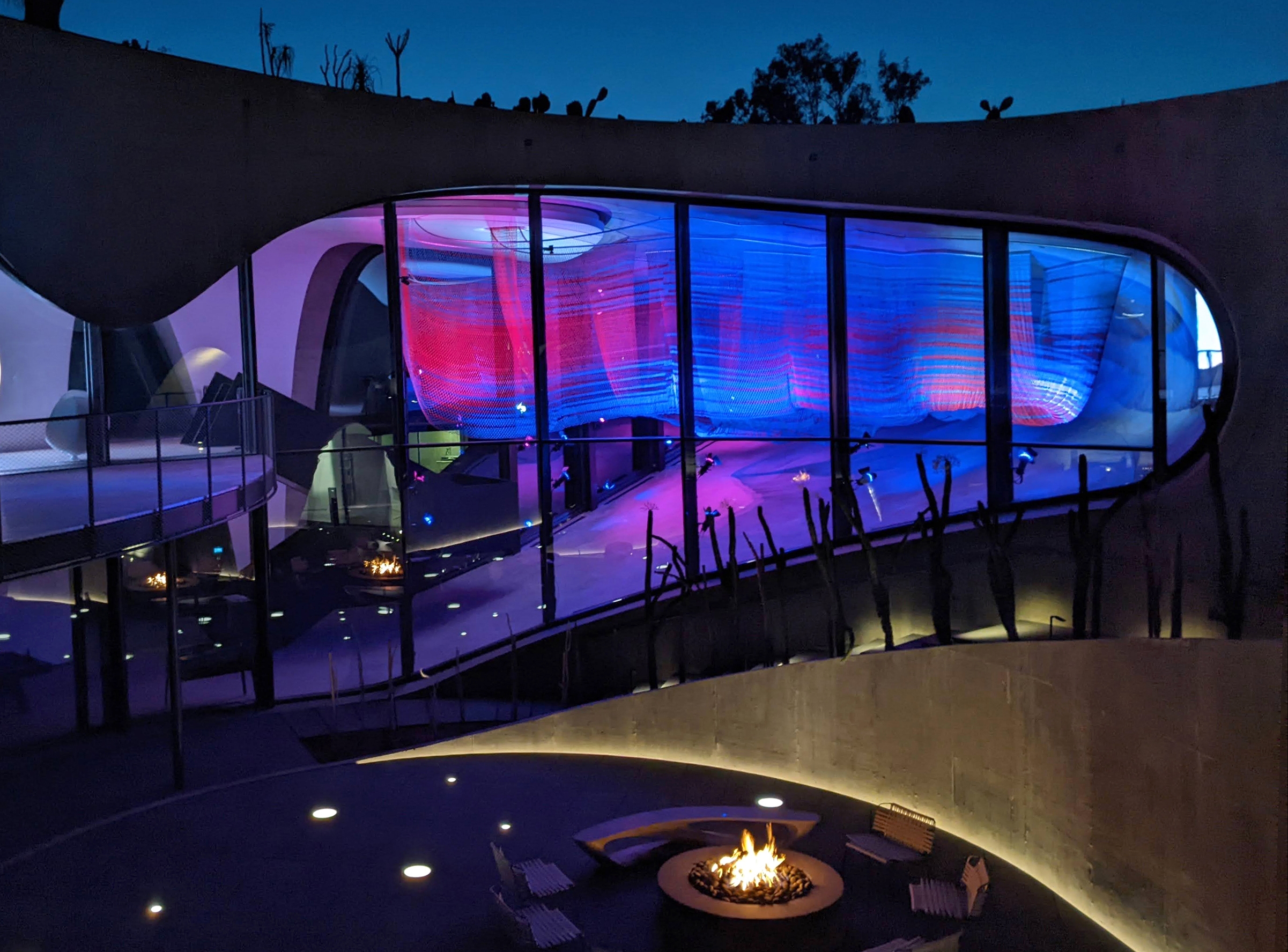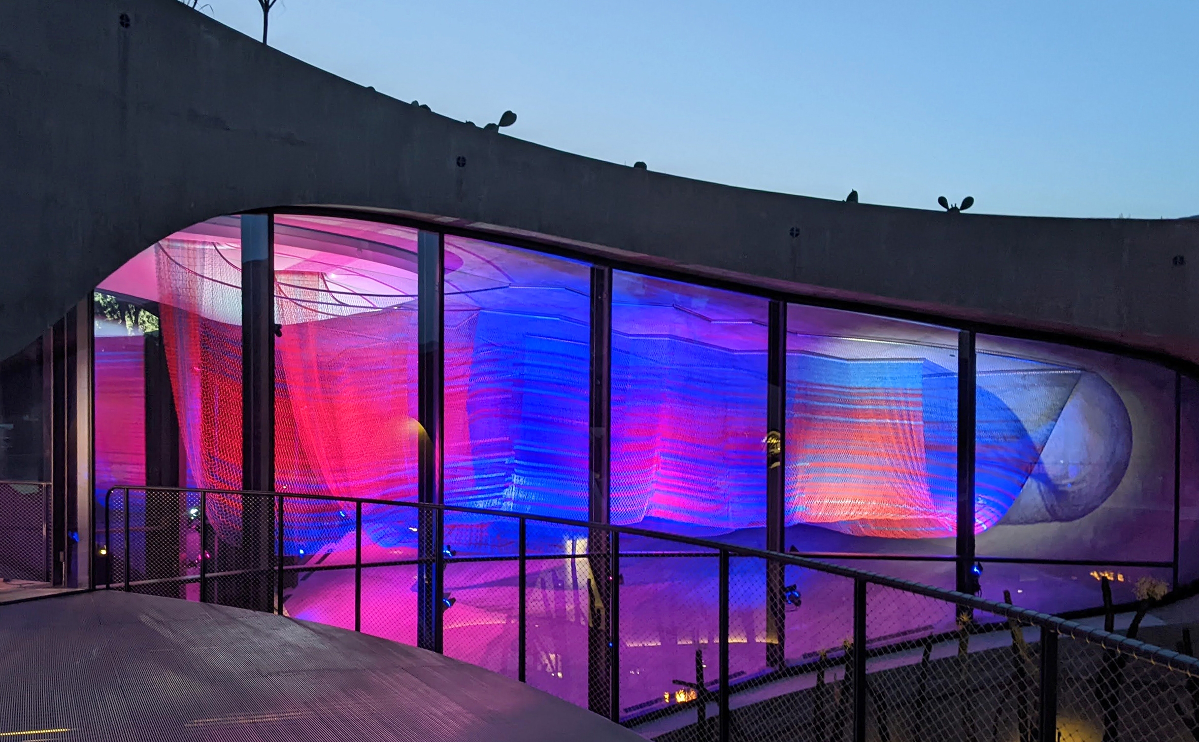 The fixtures are positioned and aimed to illuminate the entire piece, but without glare from the interior or from the adjacent exterior entry bridge or courtyard. Barn doors allow the fixtures to illuminate the bottom of the sculpture while avoiding distracting hot spots on the floor. The illumination of each fixture is programmed to come on, ramp up or dim down while also changing color in a choreographed dance with shifting shadows.