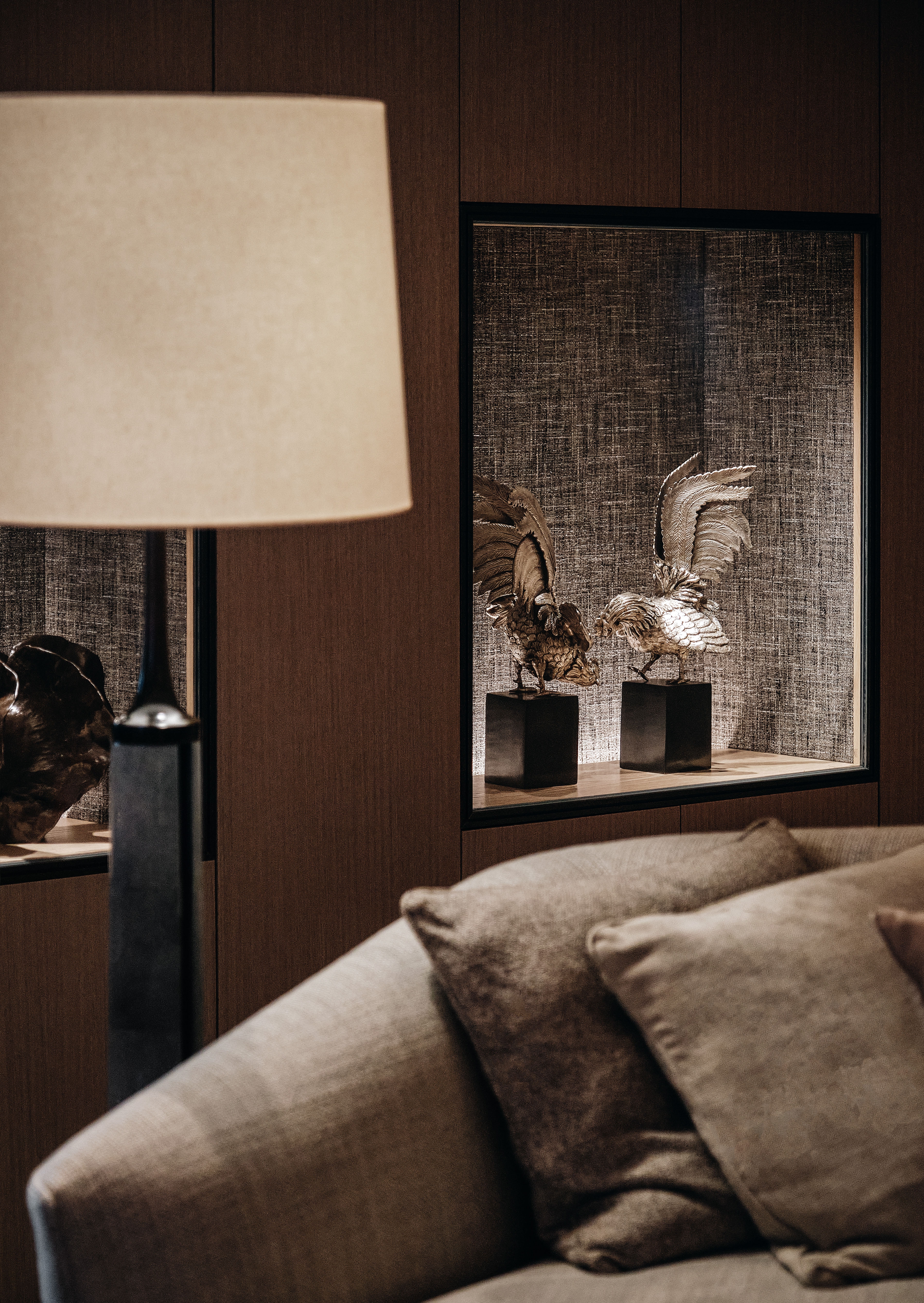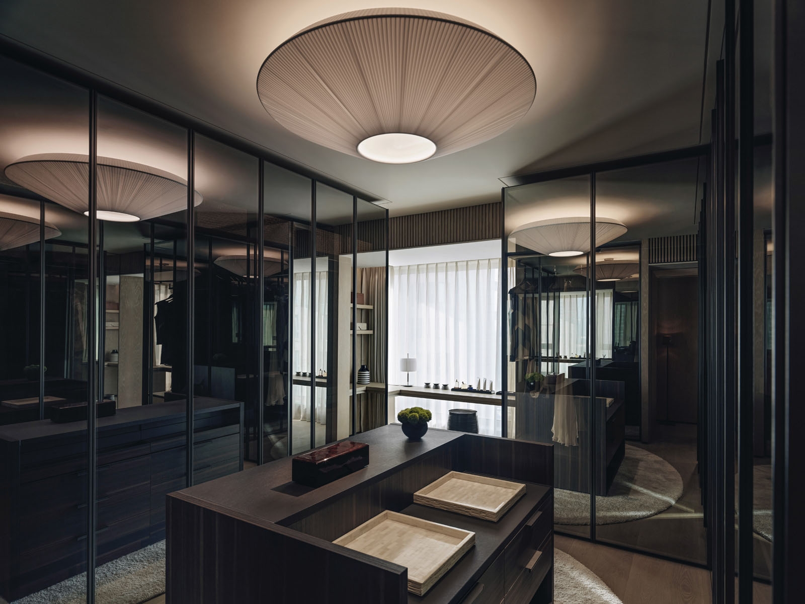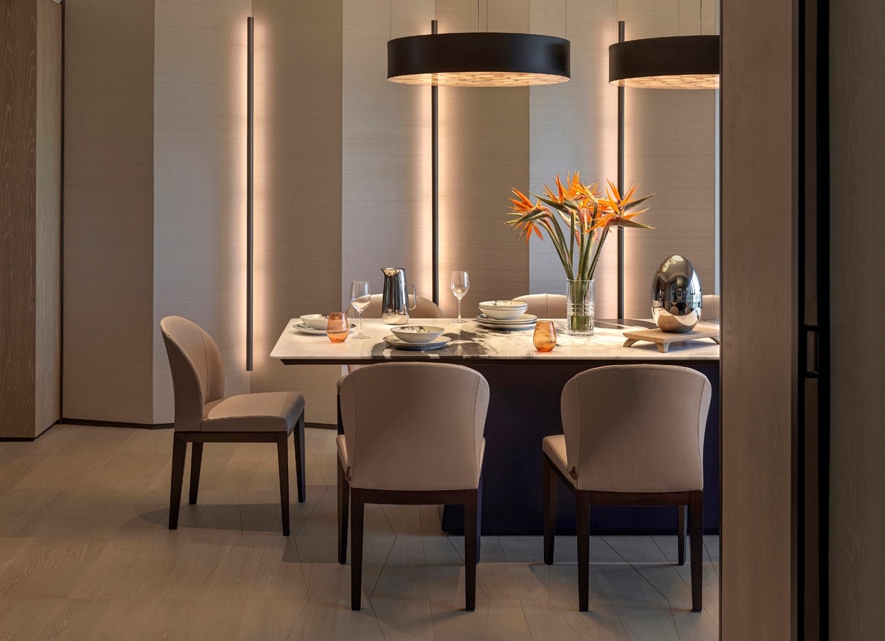 Entry DescriptionLighting design is to search for simple elegance and emphasis on the design content, quality, and sense of space. Lighting mood is set to be soft, warm, calm, relaxing, welcoming, and the lighting levels are in balance with luxury hotel experience. Instead of using fancy and loud lighting elements, we use a “simple but tightly integrated” lighting strategy that makes the overall design elements in harmony with the space. We want to make the space as natural as possible, not over-designed. Lighting for the artworks is carefully planned, not to challenge the interior element. Millworks lighting is tightly integrated with a composition of front-lit or back-lit. The decorative lights are carefully selected to create surprises in the space meanwhile match the design theme. In the wardrobe, the mirror image of the pendant naturally extends the space, creating a simple surprise. The project use low-frequency LED lights and control technology utilized at an intuitive level with scenes set in a smooth transition. Human-centric lighting approach is considered to ensure the occupant's wellbeing. At night, the color temperature is dimmed to a very warm, creating a cozy and relaxing atmosphere.