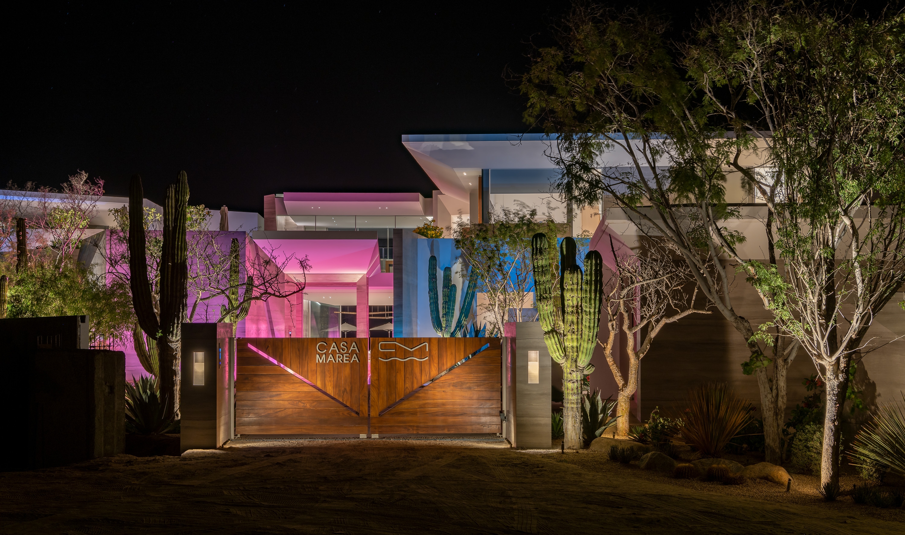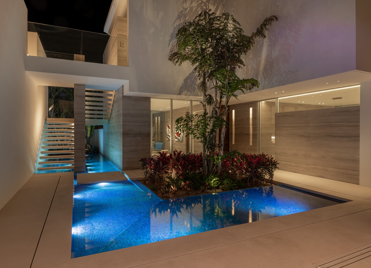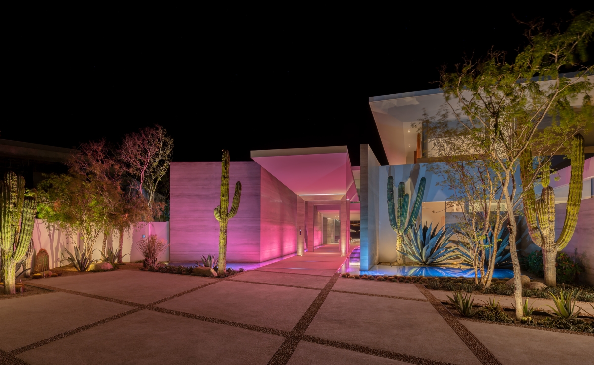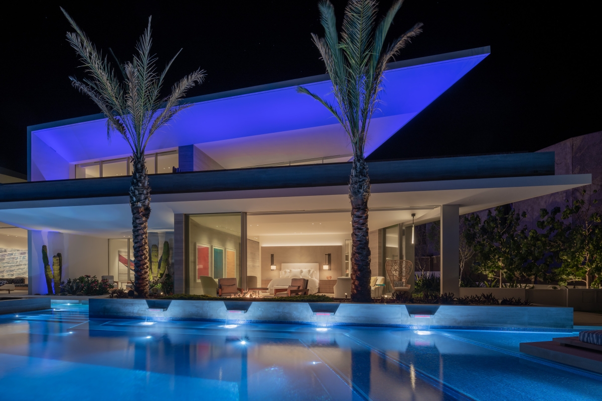 Custom solutions abound – from the home’s theater to submersed path lighting. Equal attention was paid to the exterior, where a lighting plan was devised for each plant in the landscape to show it to its best advantage. Close coordination was required throughout between the U.S.-based lighting designer and the on-site teams in Mexico.