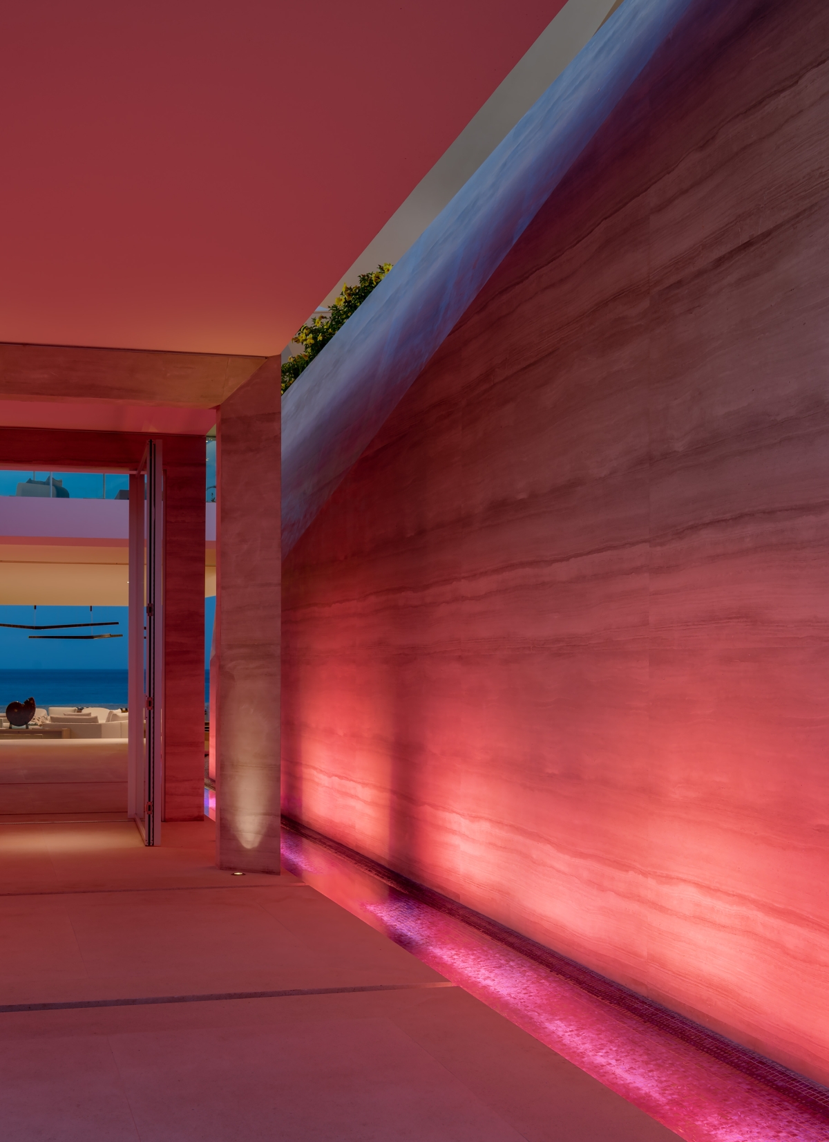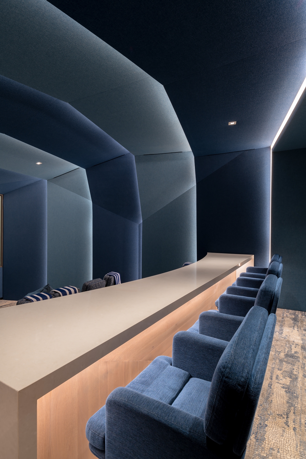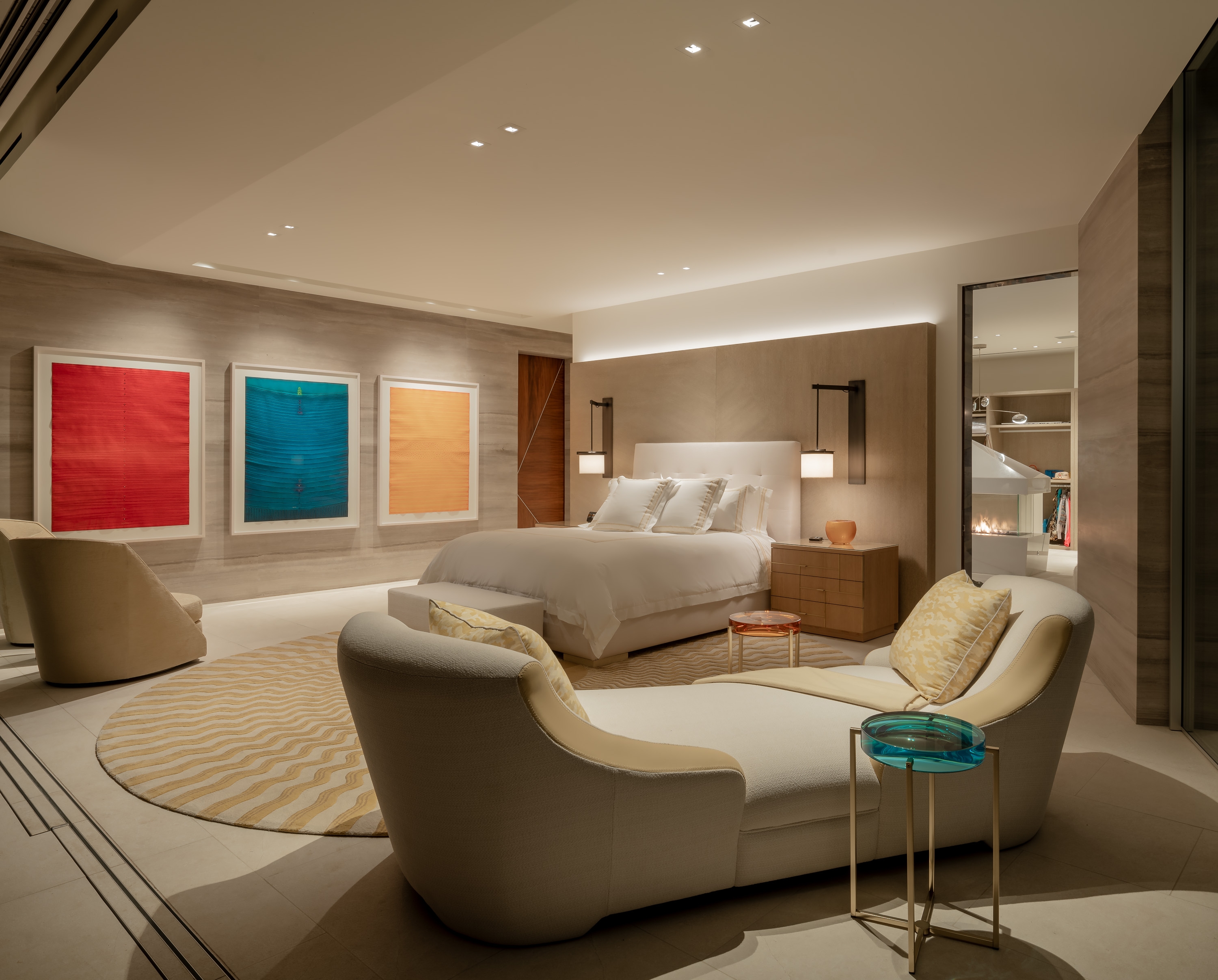 Ambient lighting set into architectural elements creates a restorative experience in suites for the 1st and 2nd generations. For the younger generation, a color-changing slot fixture evocative of an ocean wave adds a bit of whimsy.