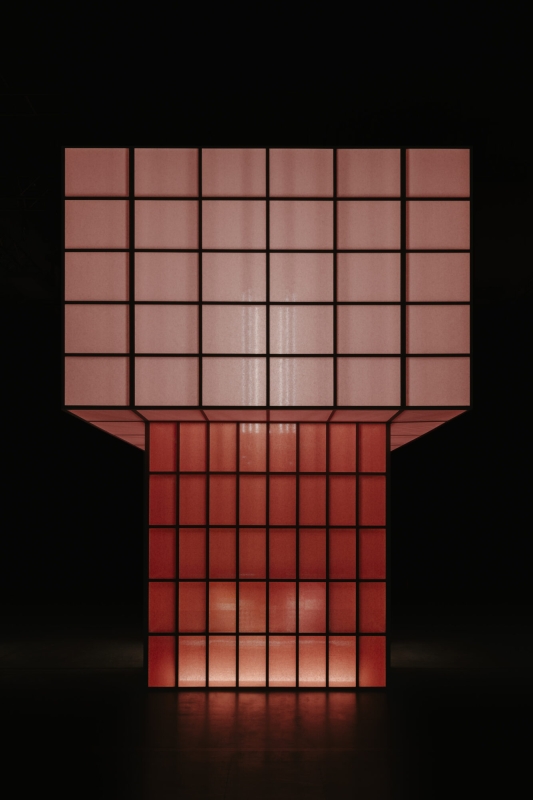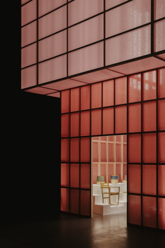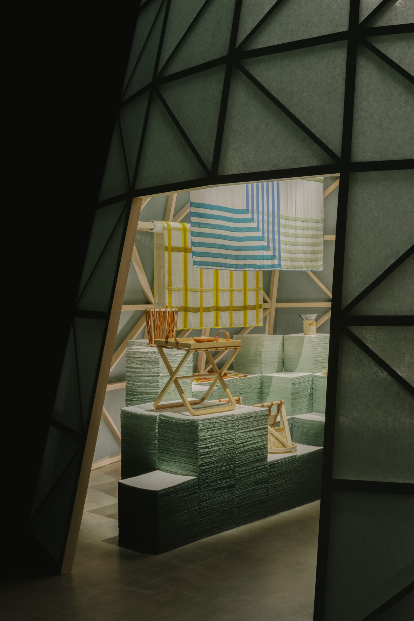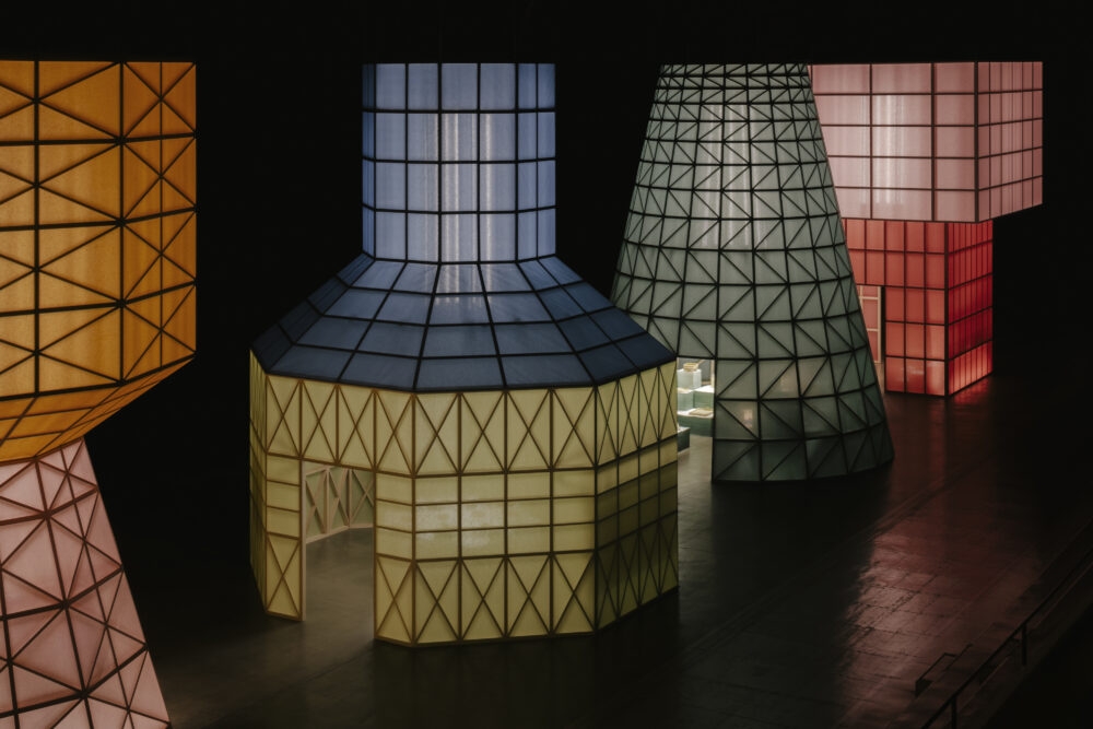 Hermès collection temporary exhibition during Milan Design Week (8-12 June 2022). The exhibition consists of 4-5 vertical architectural volumes lit from within and covered by transparent paper.