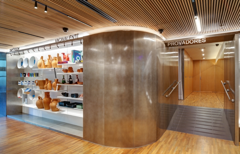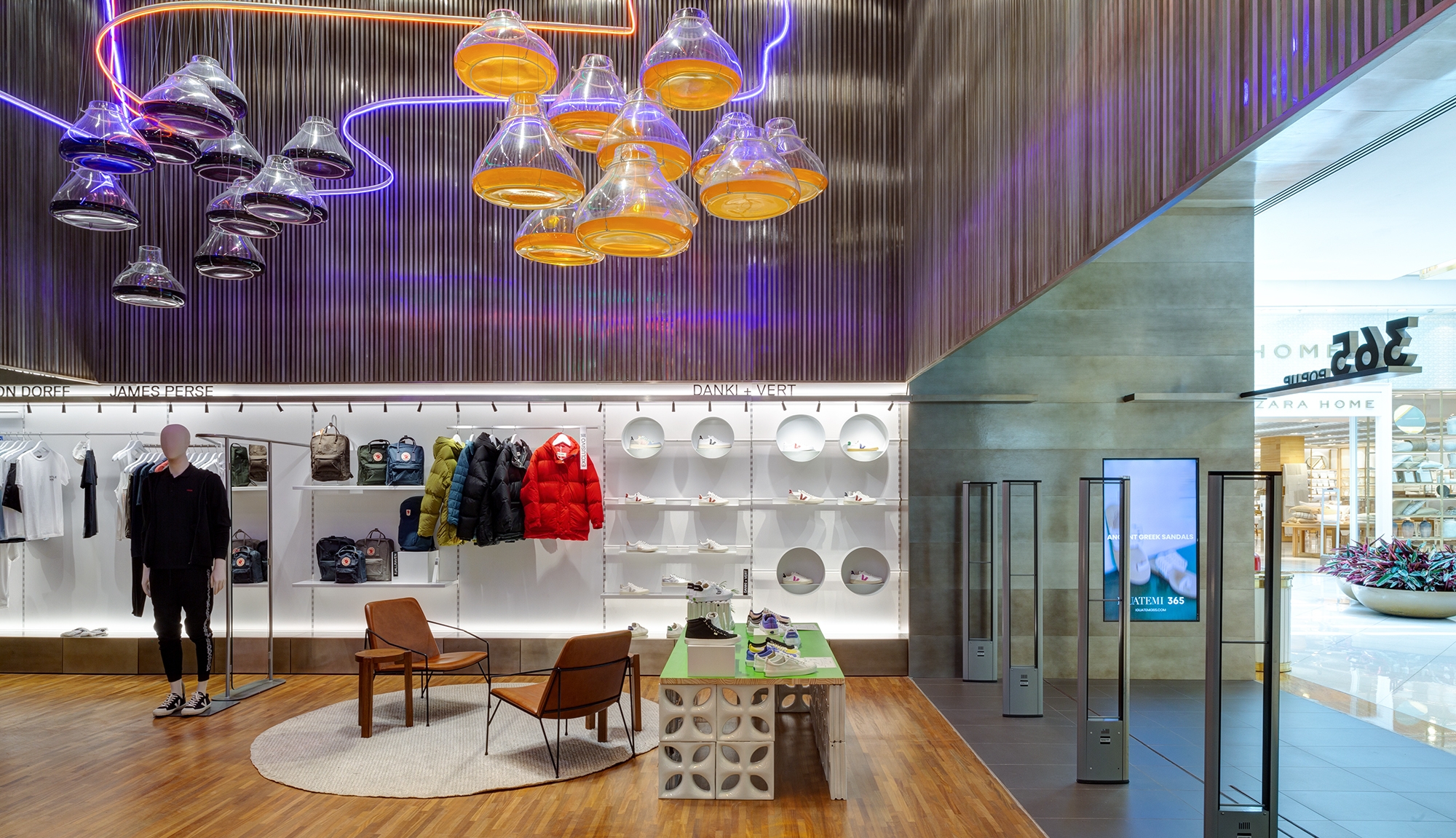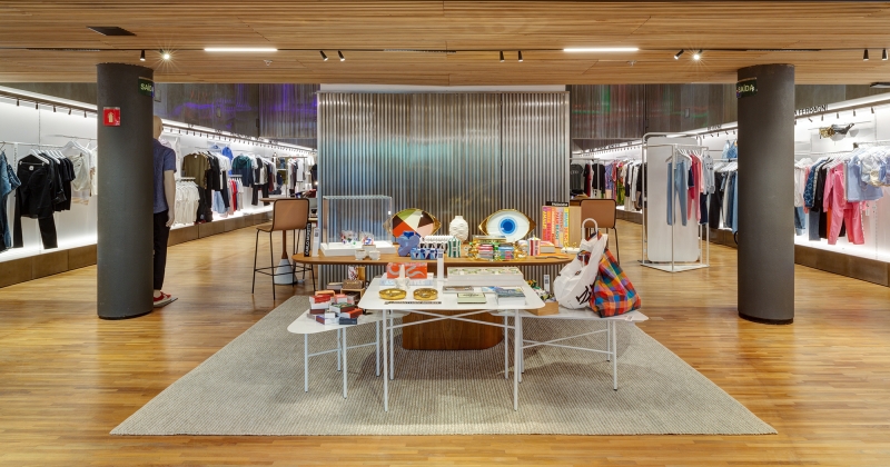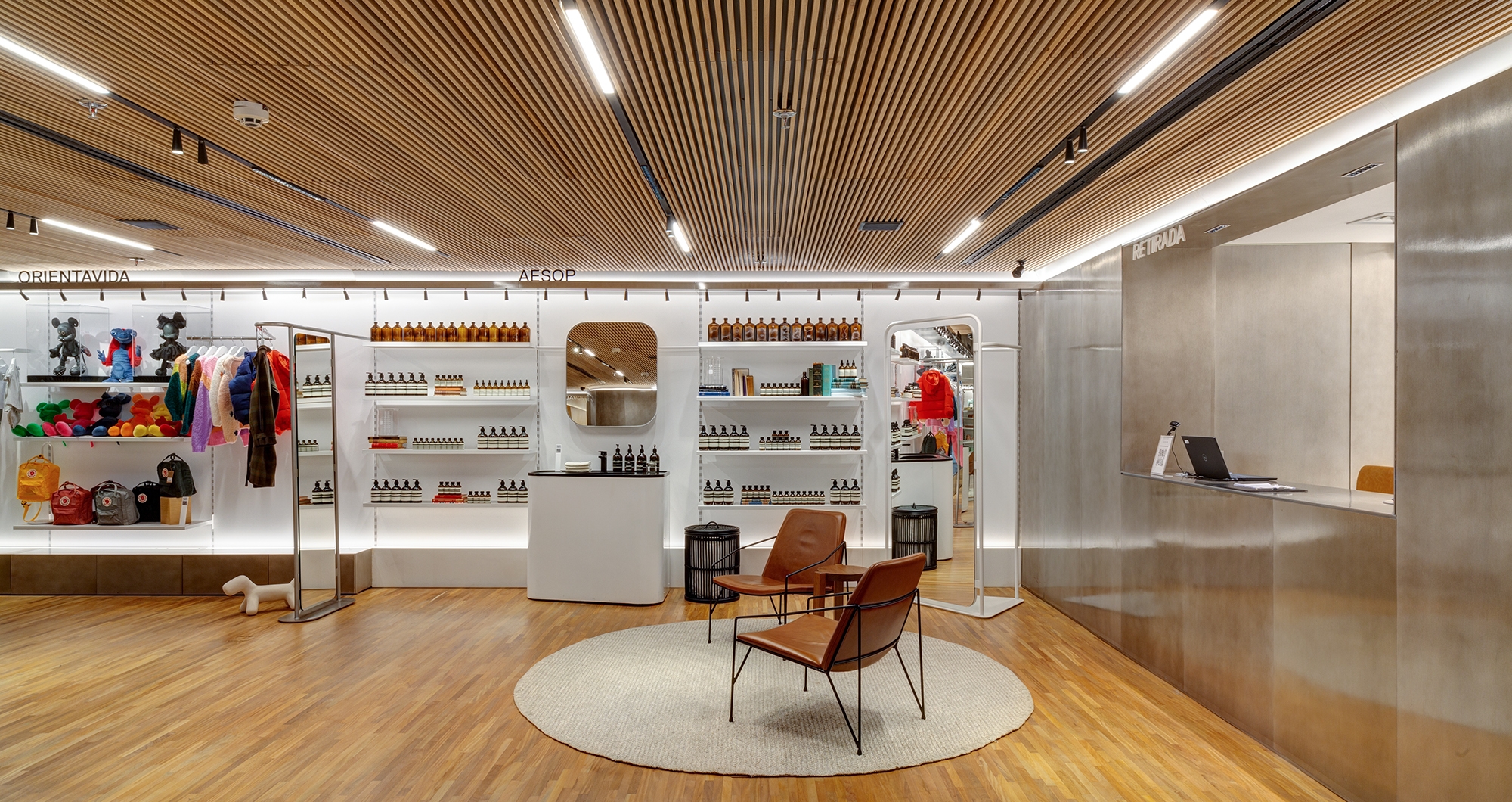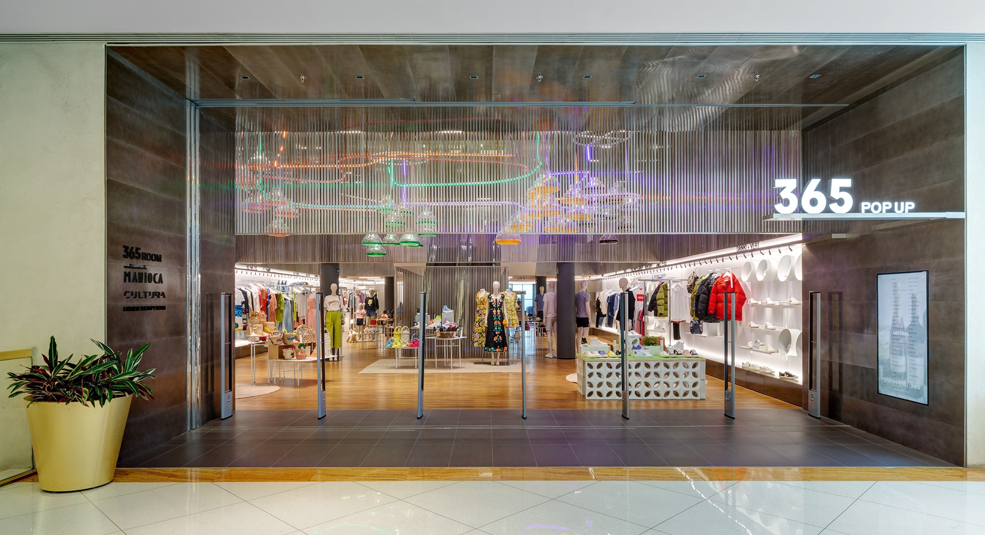 At the entrance of 365 Pop Up, the light comes together with works of art by different visual artists. All over the store, minimalist light fixtures communicate in harmony with the contrasting surfaces of the environments, such as natural wood and aluminum, proposed by the architecture firm.