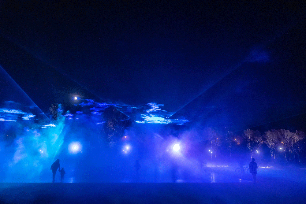 Laser content is varied in tempo, rhythm, and color, and in addition to the effect of waves, it also complements the space with a light pattern of projections on the trees growing behind the fountain opposite the lasers.