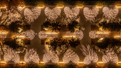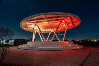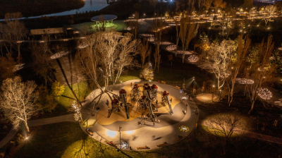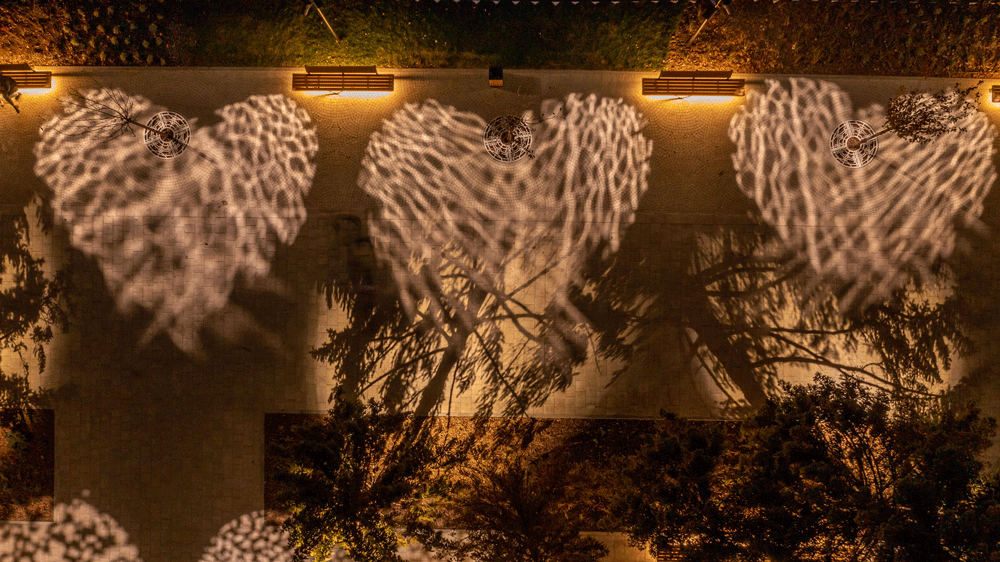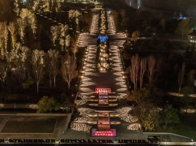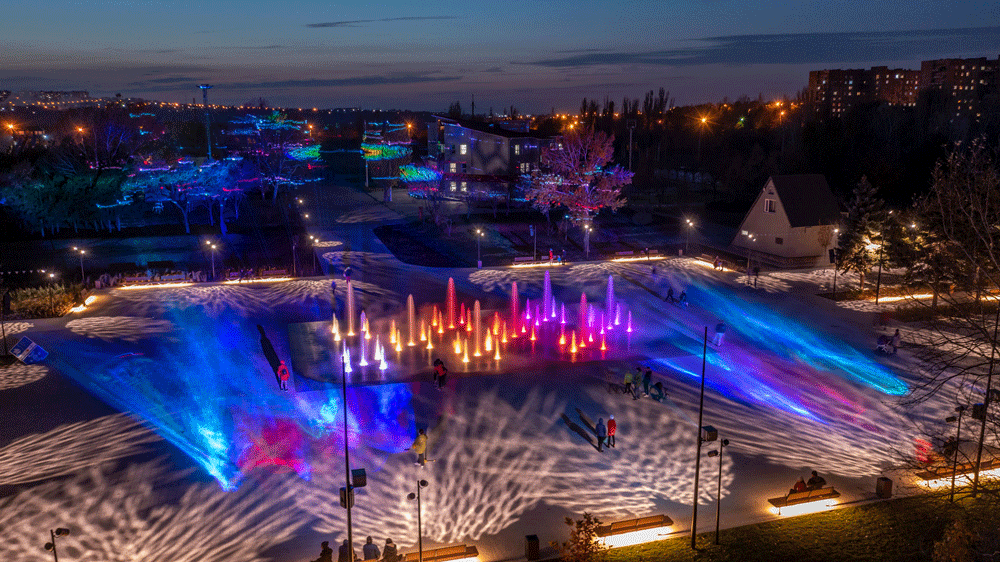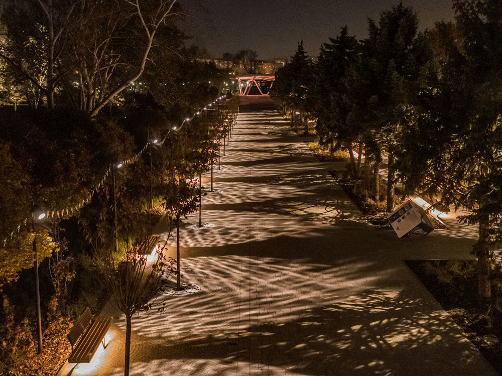 We wanted to show that Mariupol is a city by the sea and by the river. In our glassblowing workshop, we developed special lamps with custom caustic lenses that simulate the effect of water and transform the park's main pedestrian alley into a river bed that rushes to the sea.