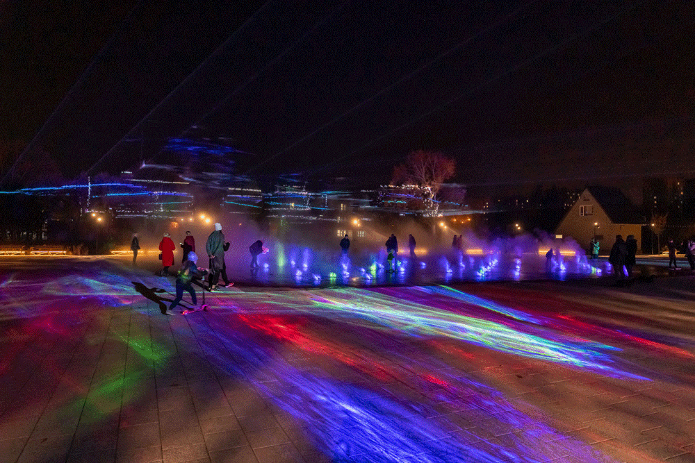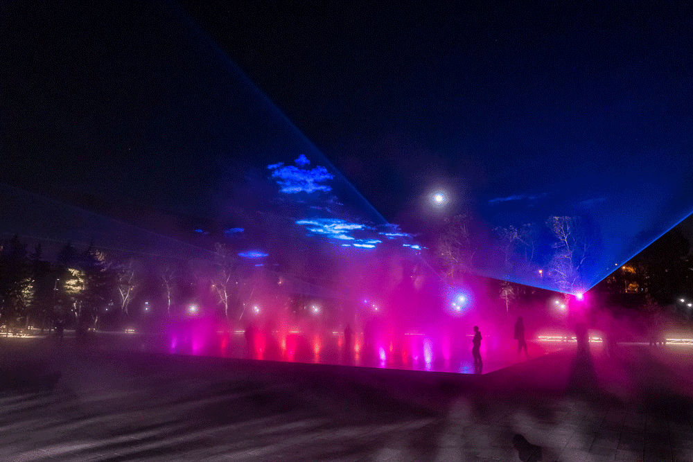 We created a special device on the platform near the central fountain that passes a moving coherent laser beam through a prism molten from glass, which is also in motion. The prism is also made in our glass-blowing workshop and has a non-uniform thickness with beads that irregularly refract light and create color changes. Thanks to this, a dynamically changing color spectrum appear on the footpath, reminiscent of the waves of a multicolored sea.