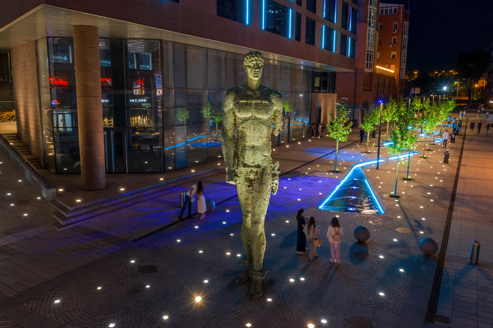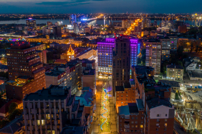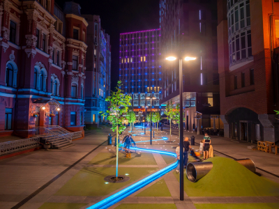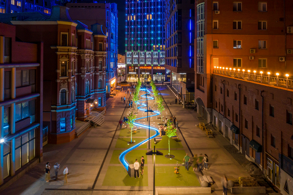 The task was to create the illusion that water is running along the stream due to the dynamics of light. Individual light nodes and dynamic lighting programs create the effect of a flowing stream, even when the water is drained from the channel for the winter. The lighting design of the boulevard is designed so as not to create excessive light pollution, while remaining functional and aesthetic, leaving the main light accent on the stream.