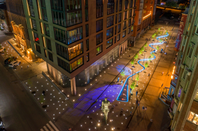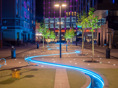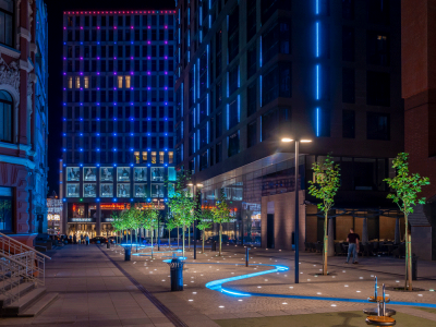 Illumination of the adjacent pedestrian boulevard includes functional light from supporting lamps, illumination of trees with spotlights built into the ground, and illumination of a stream laid across the boulevard.