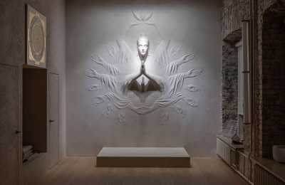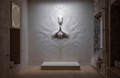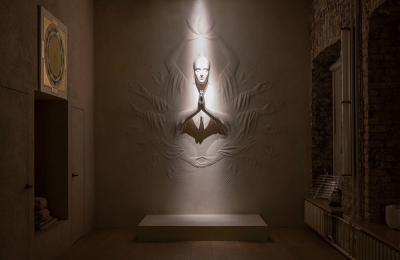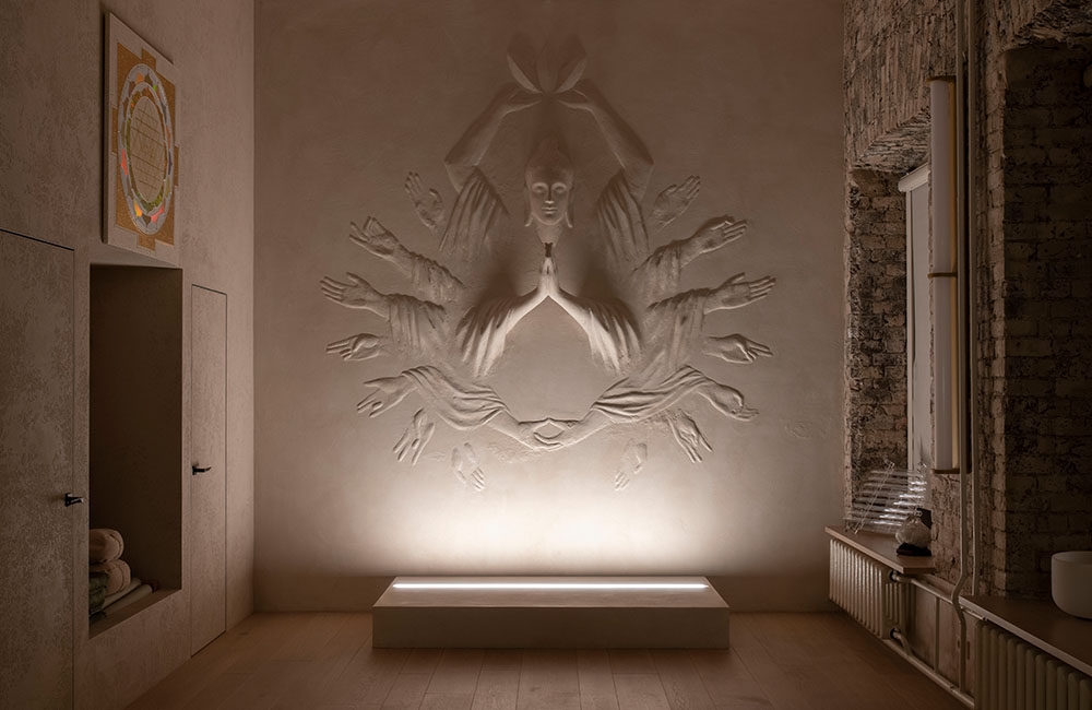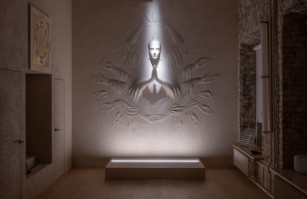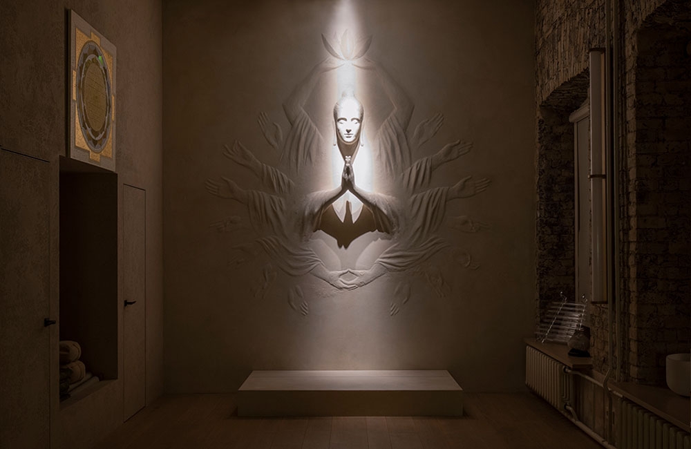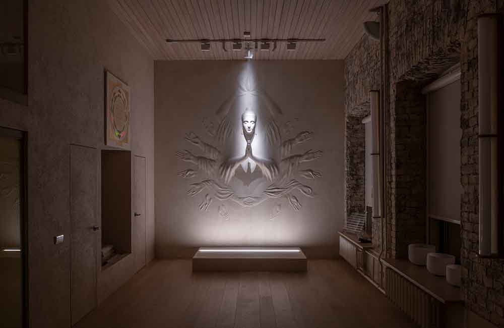 The deity's facial expression can change due to the finely executed light scenography. Various lighting scenarios allow guests to focus their attention on a particular state of mind depending on the practice taking place in the room. Soft diffused light sets the practice of active meditations and awareness work in action, while high-contrast modes allow one to focus on the inner work with the subconscious and deep meditations.