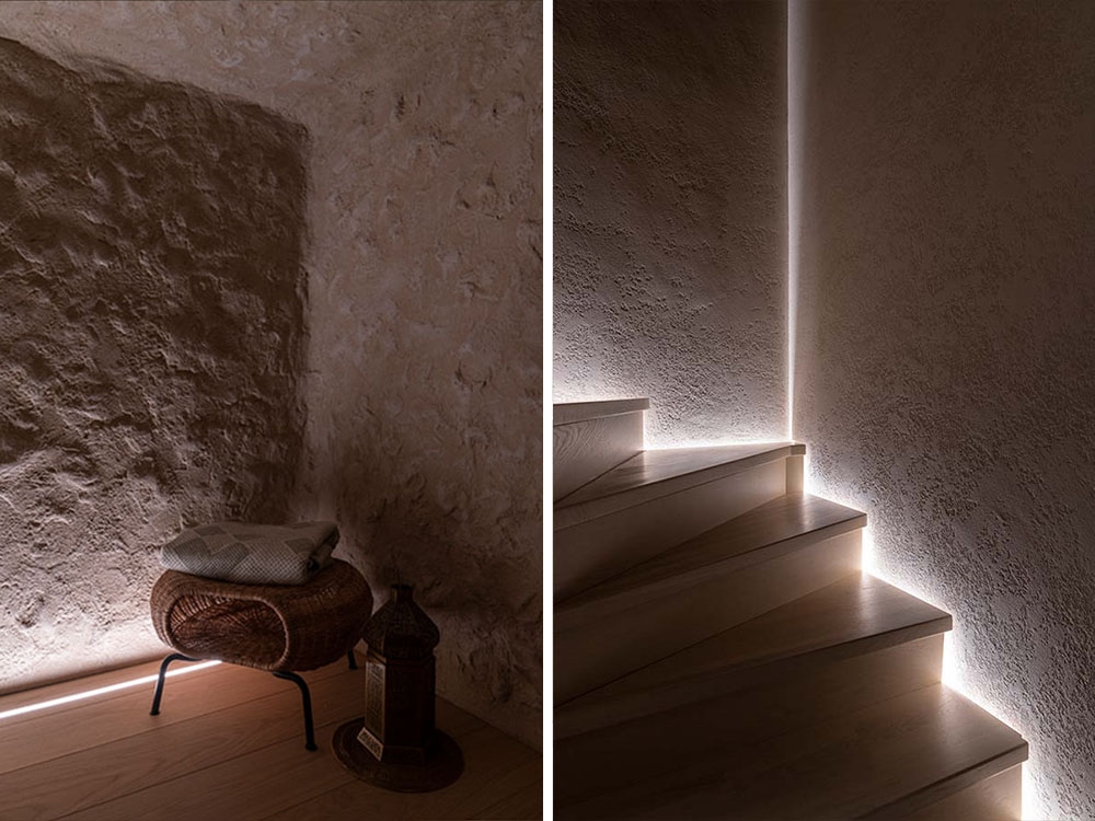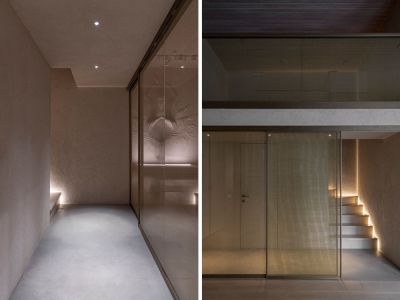 Accent lights and LED-line mark the way to the second floor, where the massage and aurasoma rooms are located. Both rooms on the second floor are in semi-darkness, that is soothing and heightening sensory perception.