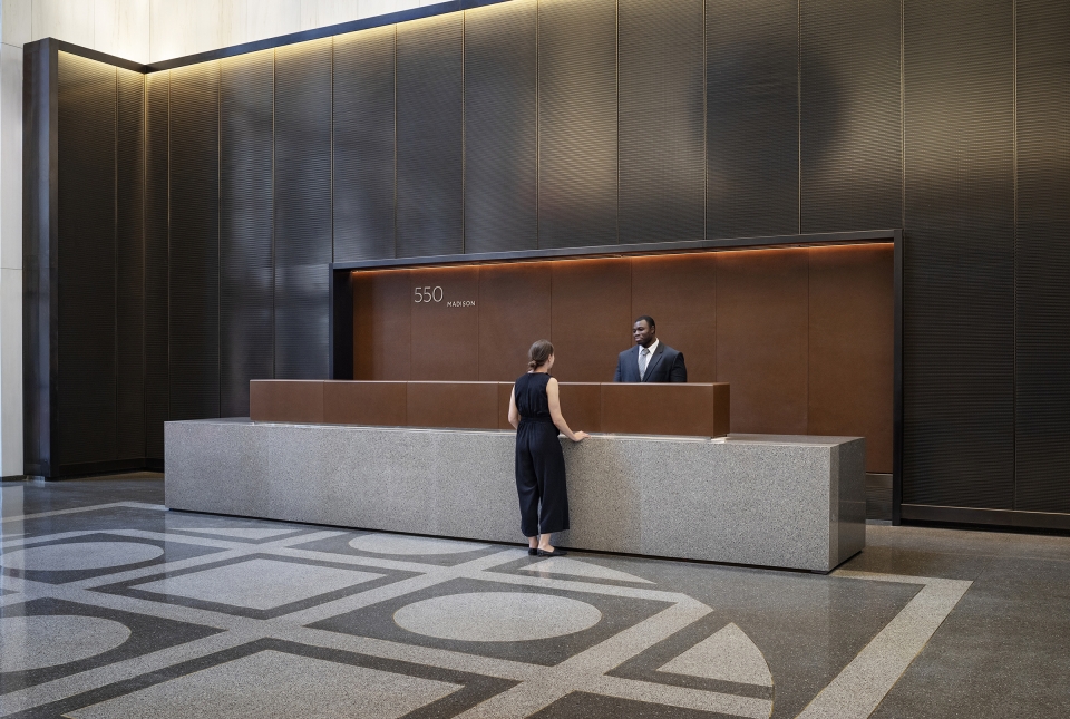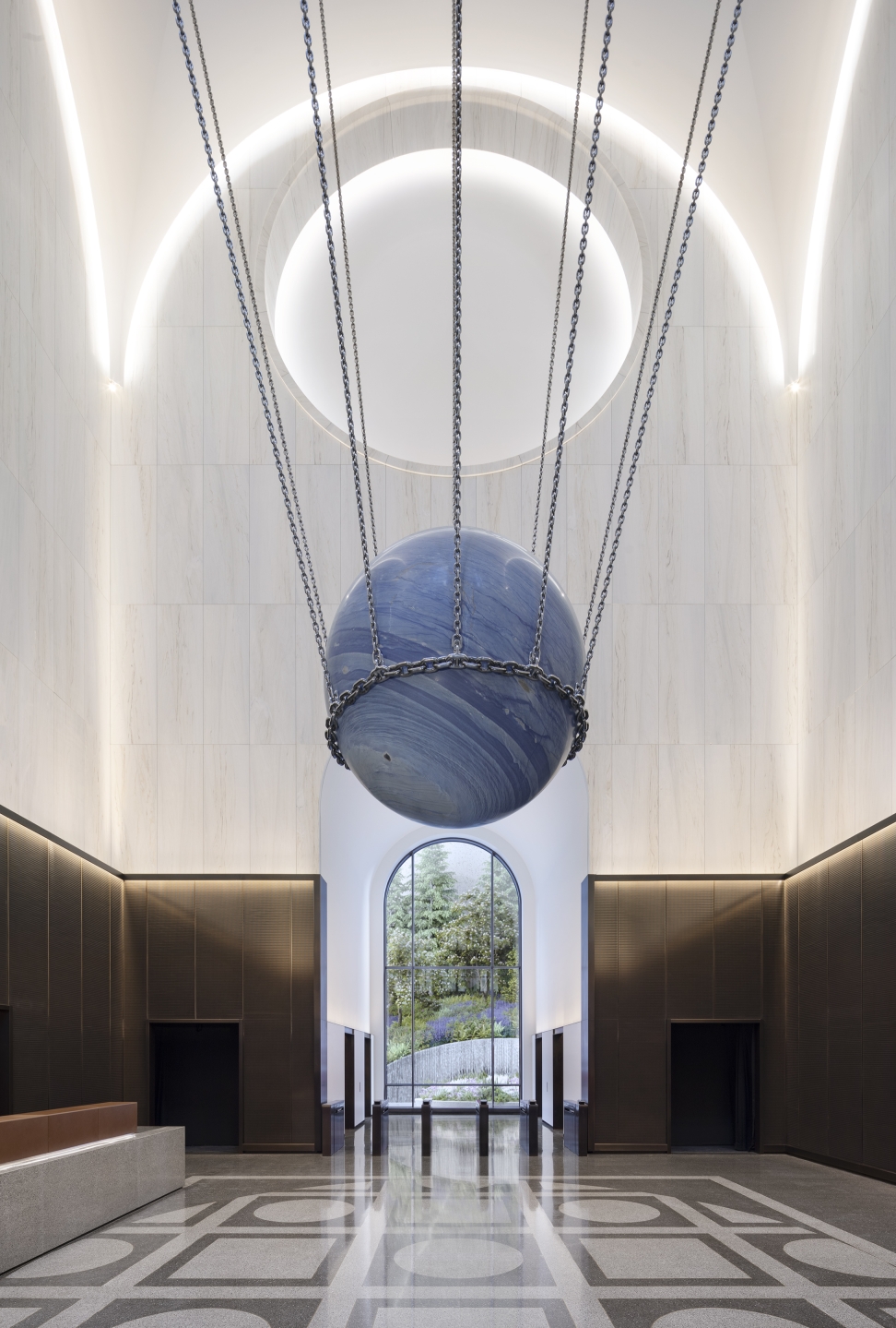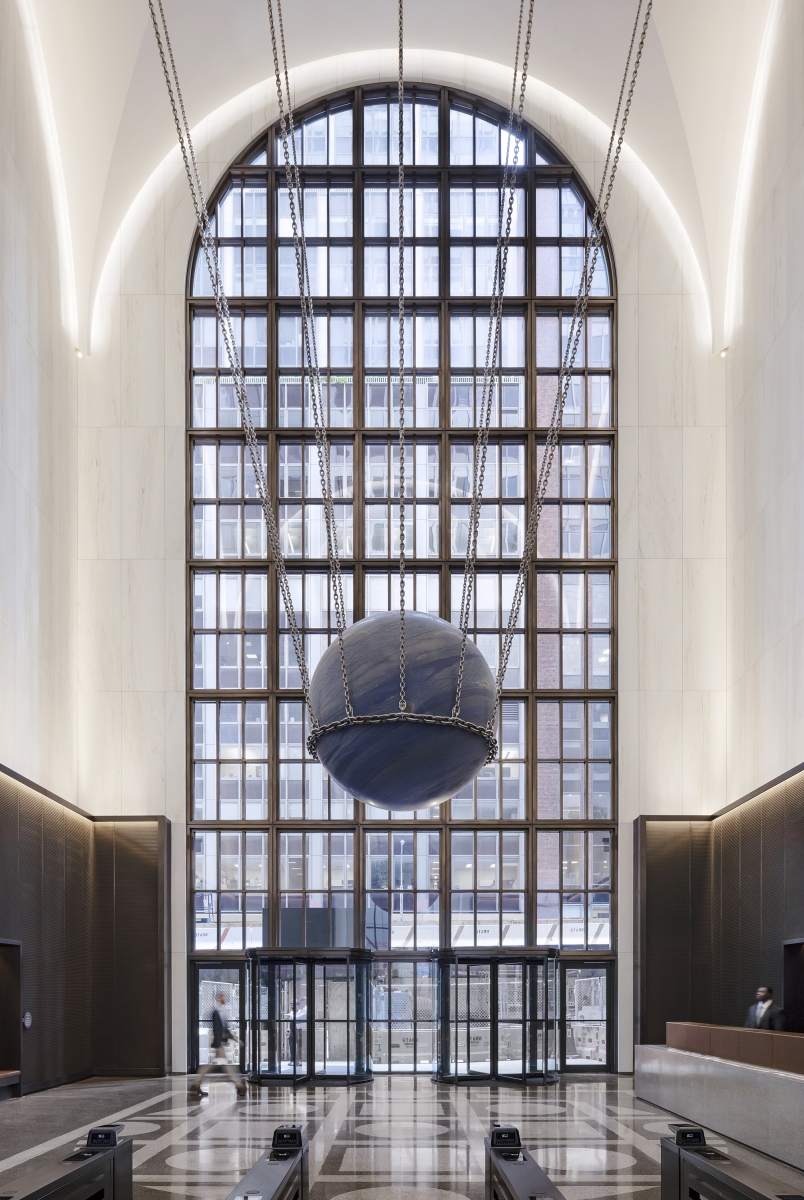 Entry DescriptionSeeking to complement the volume of this iconic tower transformation, the lighting design for this soaring ground floor lobby emphasizes the ethereal, pensive quality of the space while honoring the simple, classic forms and materials. Mindful of concealing all specified light sources, surfaces and edges appear to radiate light, with no distractions to compromise the visitors’ experience. In deference to the original design, the original oculus was kept and reilluminated with tunable white sources to account for natural light entering throughout the day. A suspended 24-ton blue-marble sphere art installation in the lobby center is lit, giving the illusion of a piece of sky brought down to ground level. Lighting of this piece not only perfectly highlights the art, but also the terrazo floor, which is made from the crushed pink granite that originally adorned the walls.