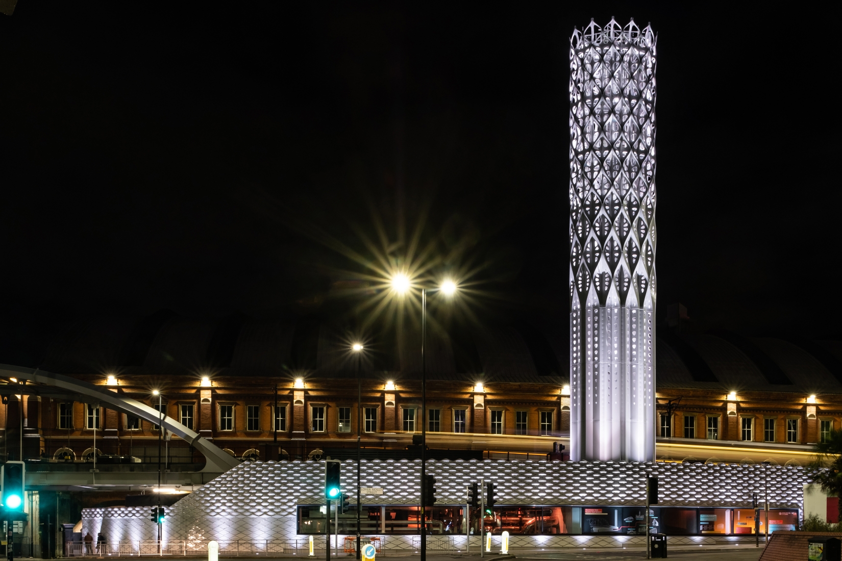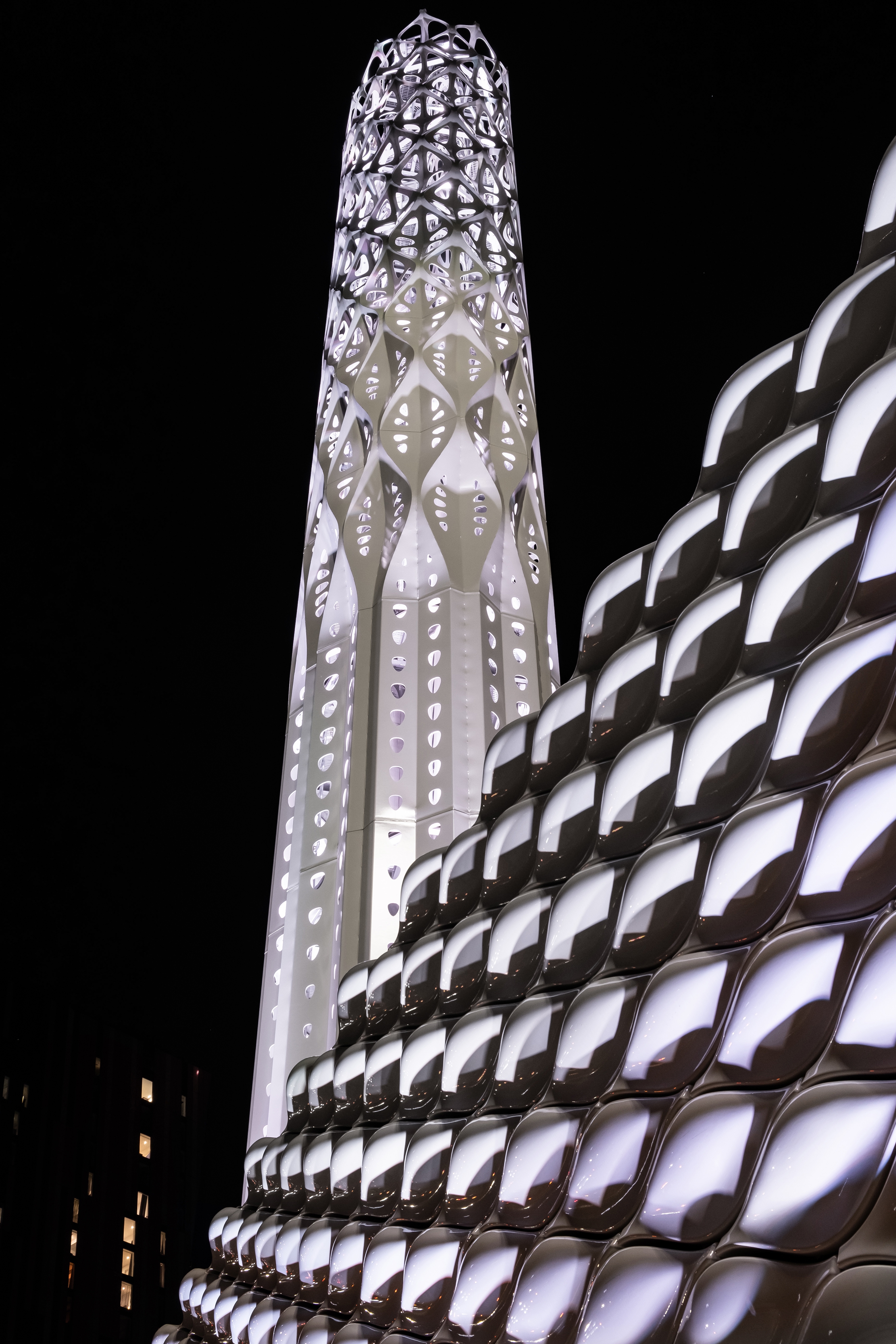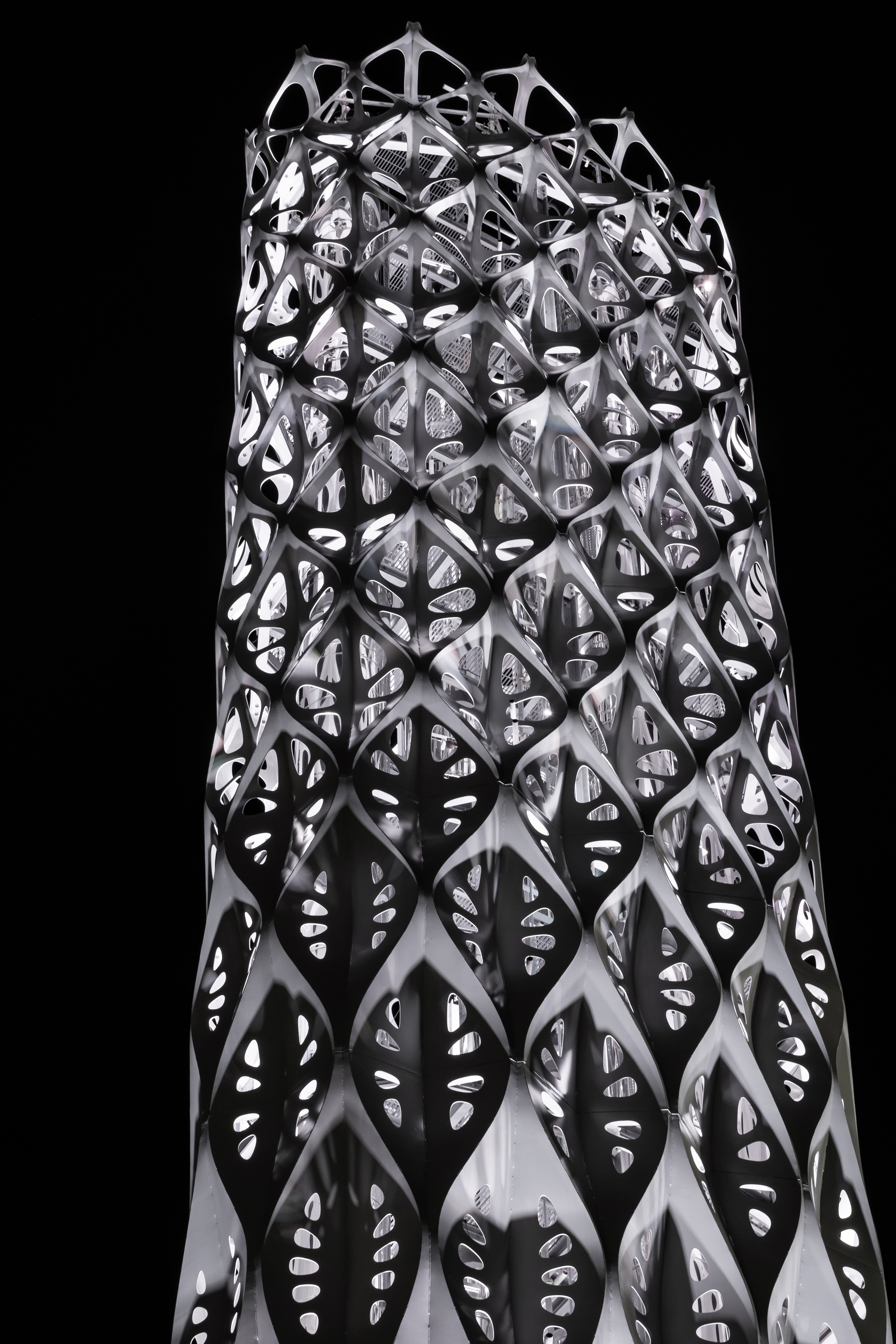 At the tower’s base, façade lights are positioned to accentuate the undulation of exterior surface; the interior surface of the tower is washed with a series of spotlights aimed on the bias, maximising vertical distribution by using the diagonal between undulations while highlighting the shell’s perforation. The reflective surface of the central flues amplifies the effect of dappled light while sustaining the lightweight, pristine impression of the tower from day into the night.