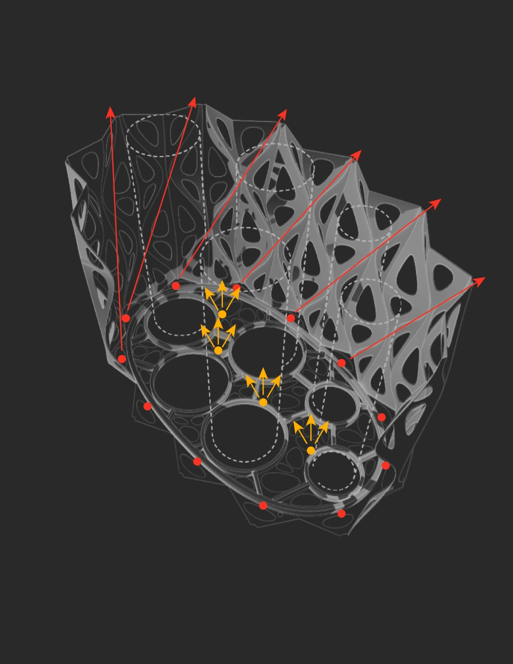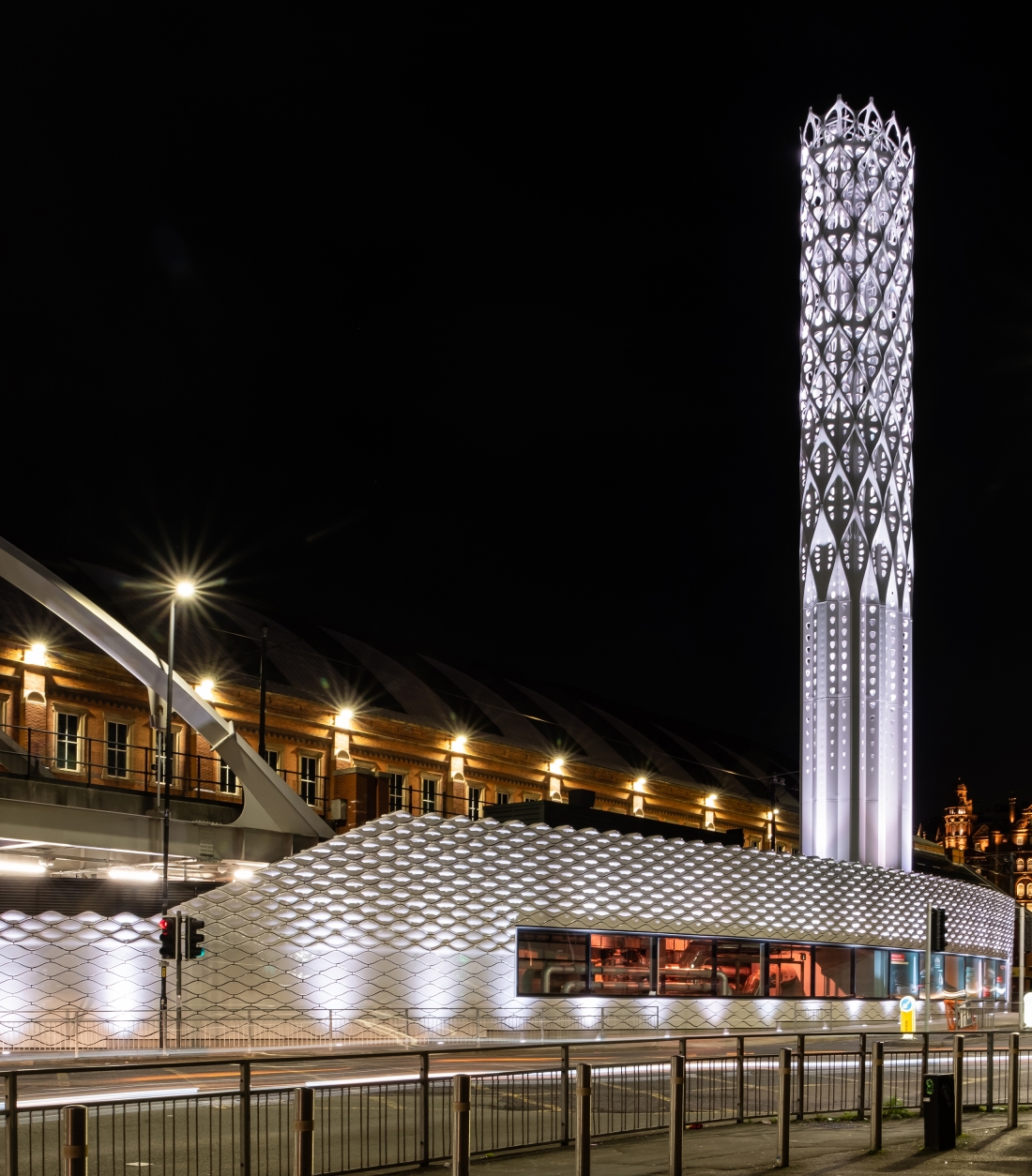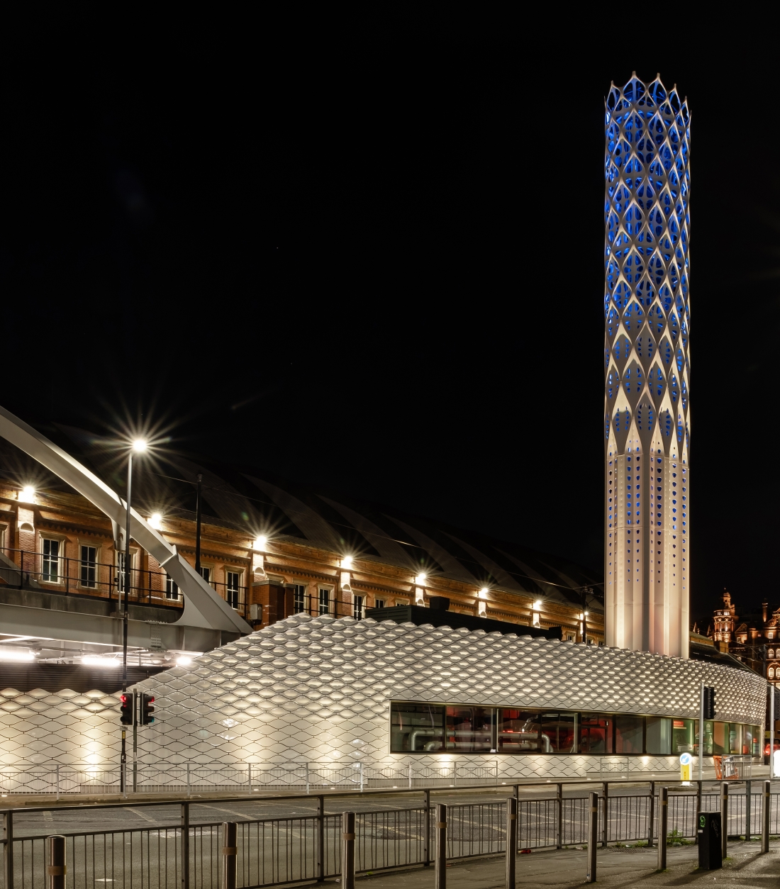 At the tower’s base, façade lights are positioned to accentuate the undulation of exterior surface; the interior surface of the tower is washed with a series of spotlights aimed on the bias, maximising vertical distribution by using the diagonal between undulations while highlighting the shell’s perforation. The reflective surface of the central flues amplifies the effect of dappled light while sustaining the lightweight, pristine impression of the tower from day into the night.