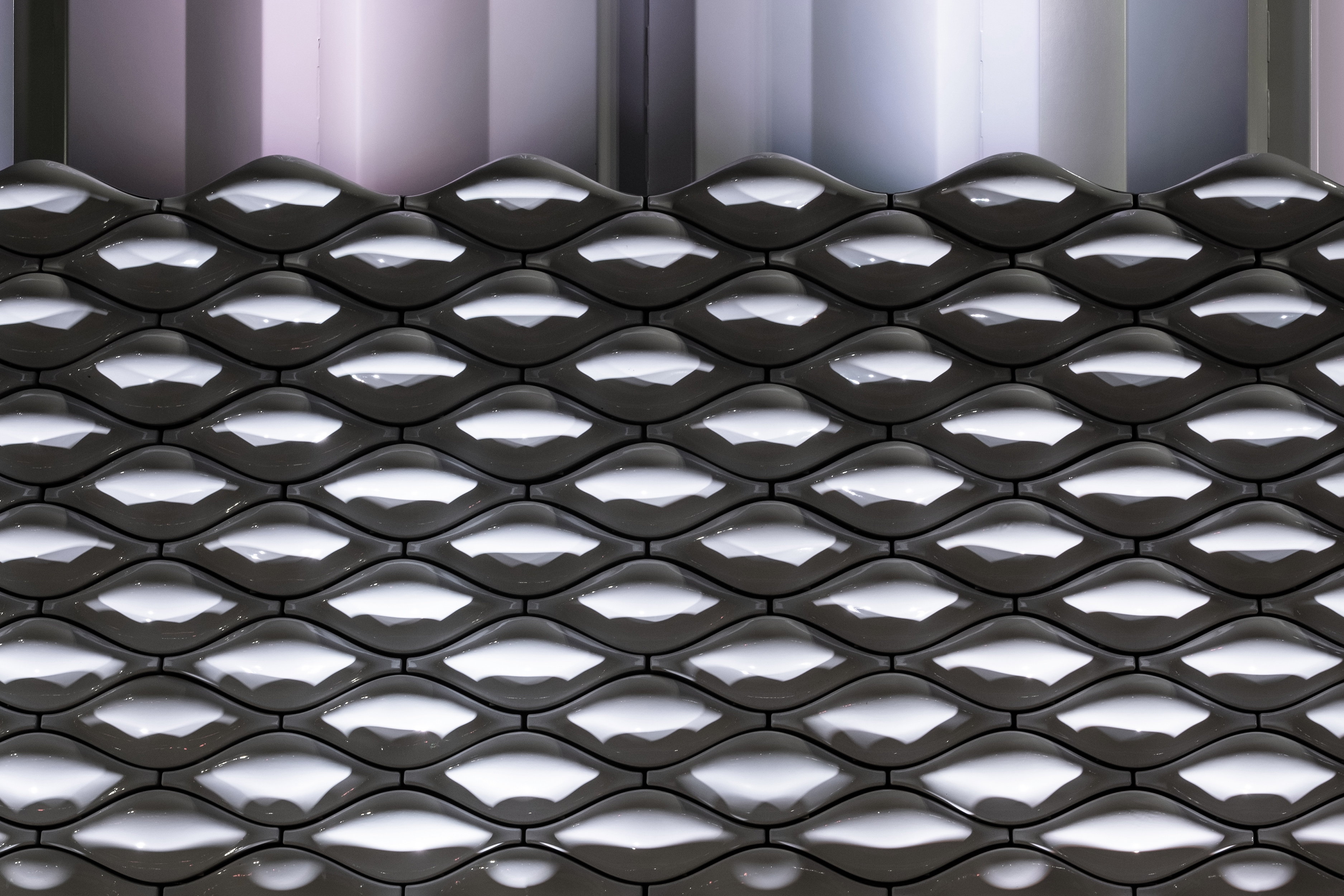 At street level, the Wall of Energy, clad in bespoke white-ceramic tiles. To camouflage a dispersion, the structure deploys Tonkin Liu’s and ARUP’s 12 shell-lace structure, a single-surface structure that stands 6mm thick and 40-metre tall.