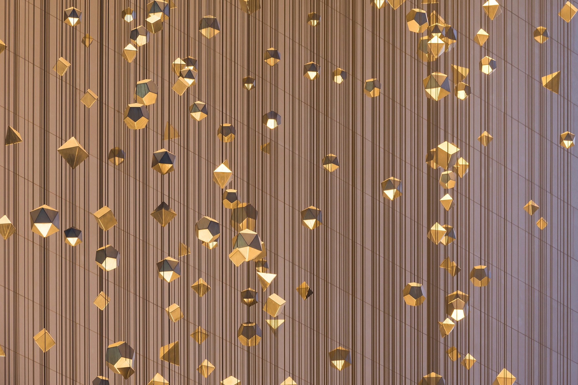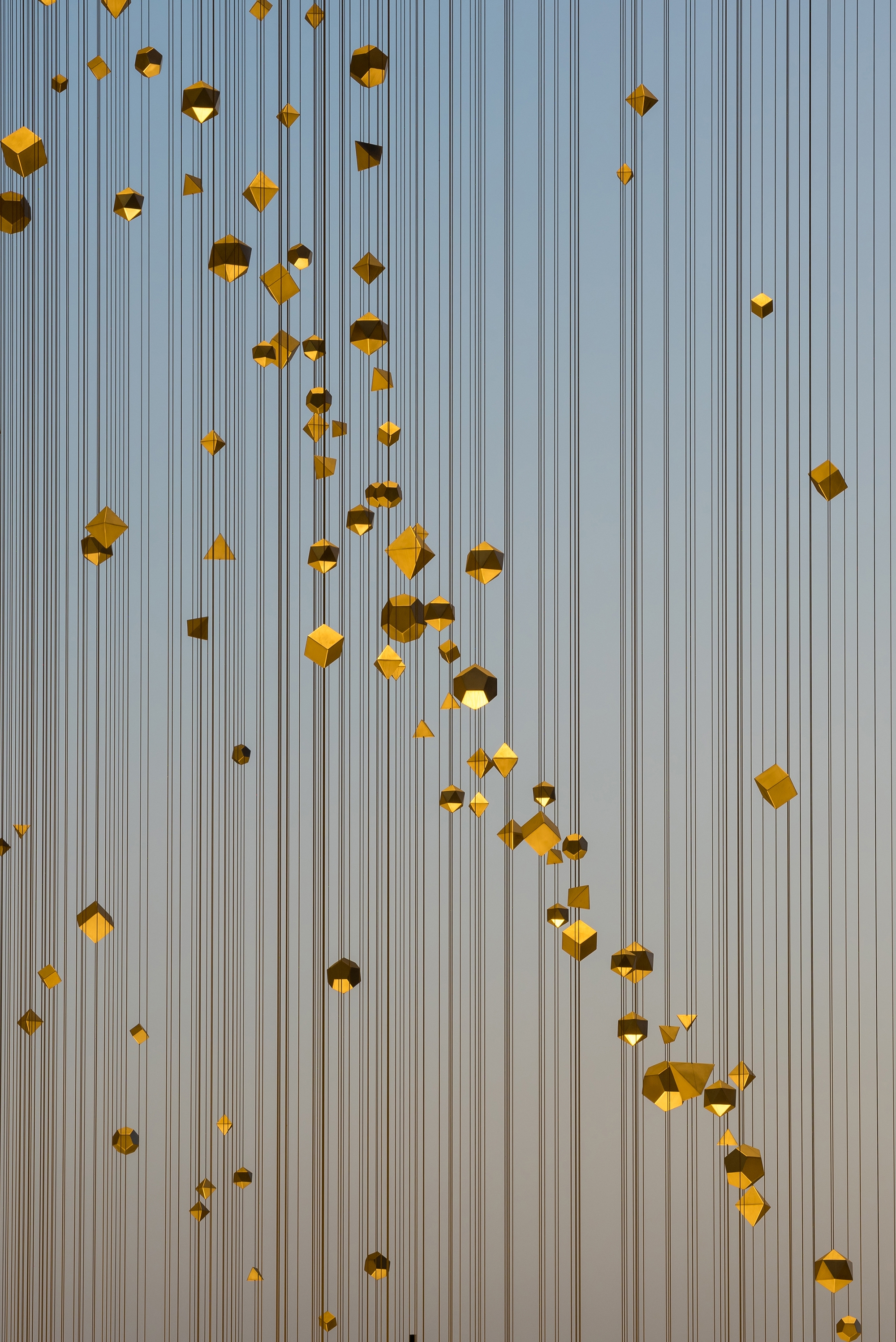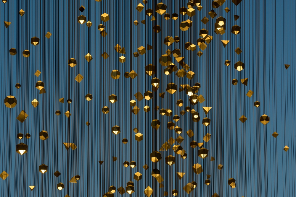 The Constellation consists of over one thousand three hundred geometric shapes suspended from more than one thousand tensioned cables. These elements are known as ‘platonic solids’, renowned for their mathematical beauty and symmetry. Each fixture is fitted with a 3.5w warm white LED and integral DMX control, enabling the exact tailoring of the lighting scheme to respond to the differing textures and forms that make up the artwork.
