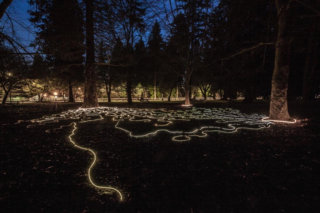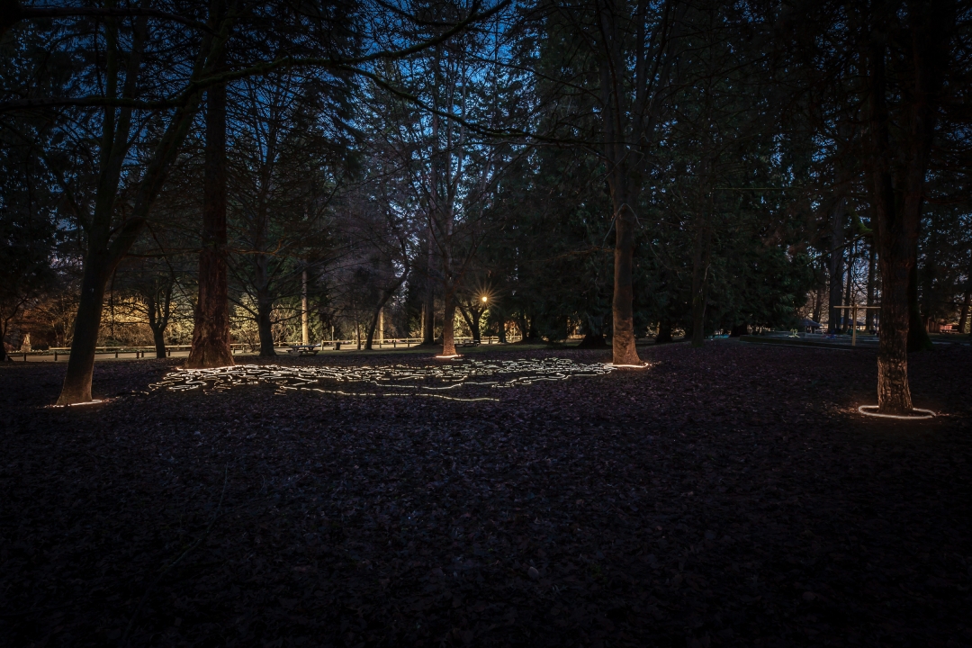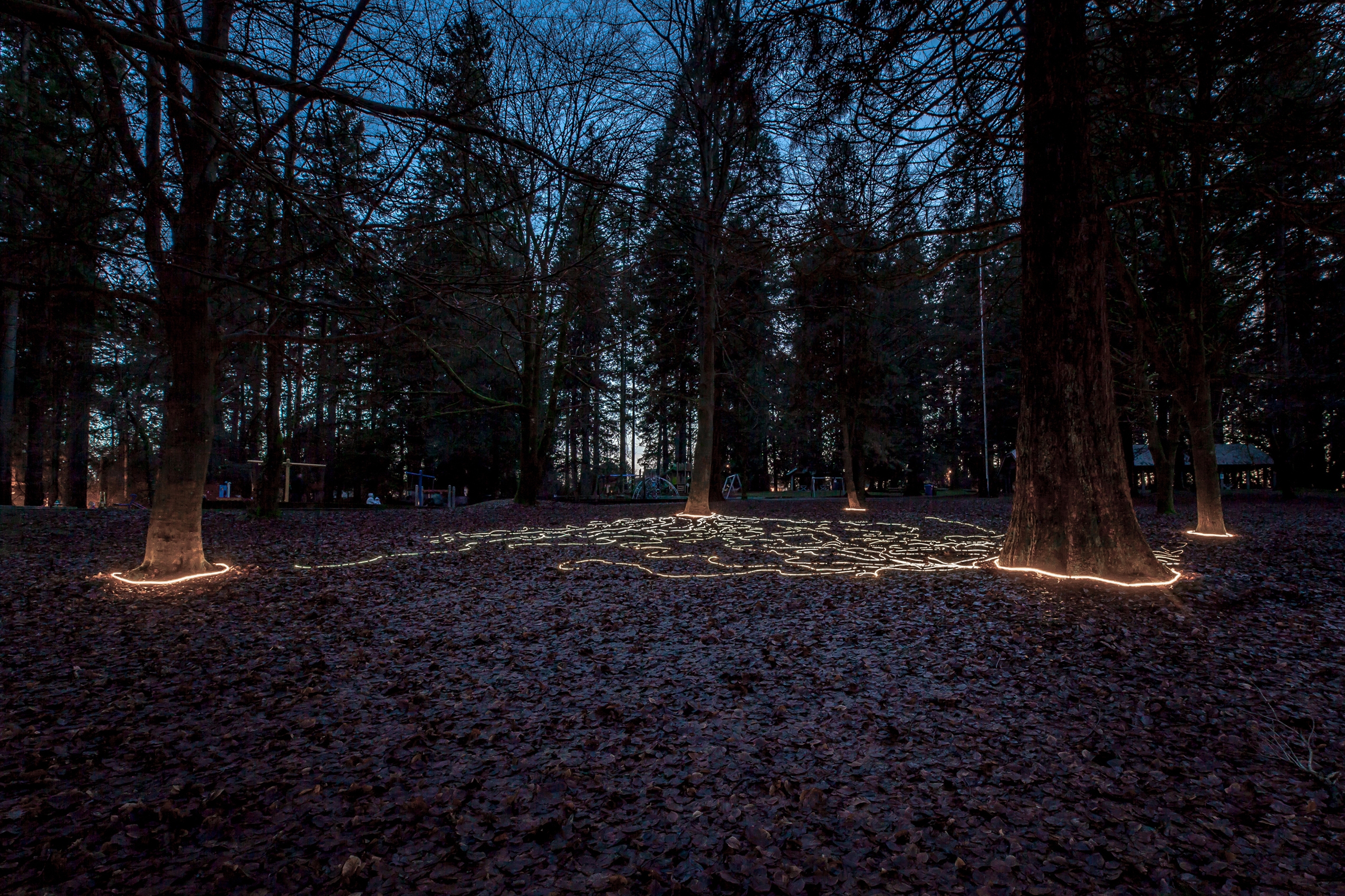 Inspired by forest mycorrhizae, Familial is an art installation that uses light to make visible the connections that go unseen. This site-specific artwork incorporates protected trees in New Westminster’s Queen’s Park, including a giant redwood (Sequoiadendron giganteum) and several European beech trees (Fagus sylvatica) that commonly form mutualistic relationships with mycorrhizal fungi. Through this underground fungal-root network, a community of thriving individuals is created.