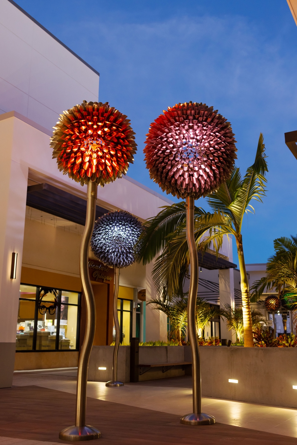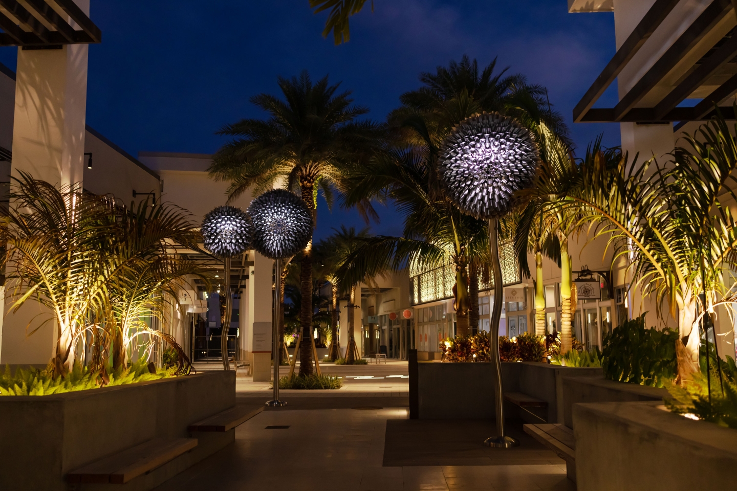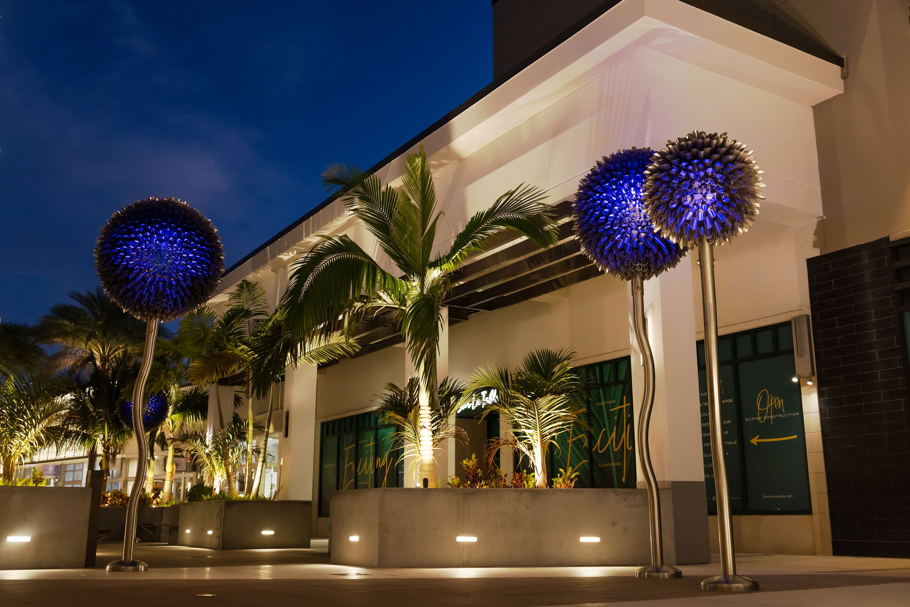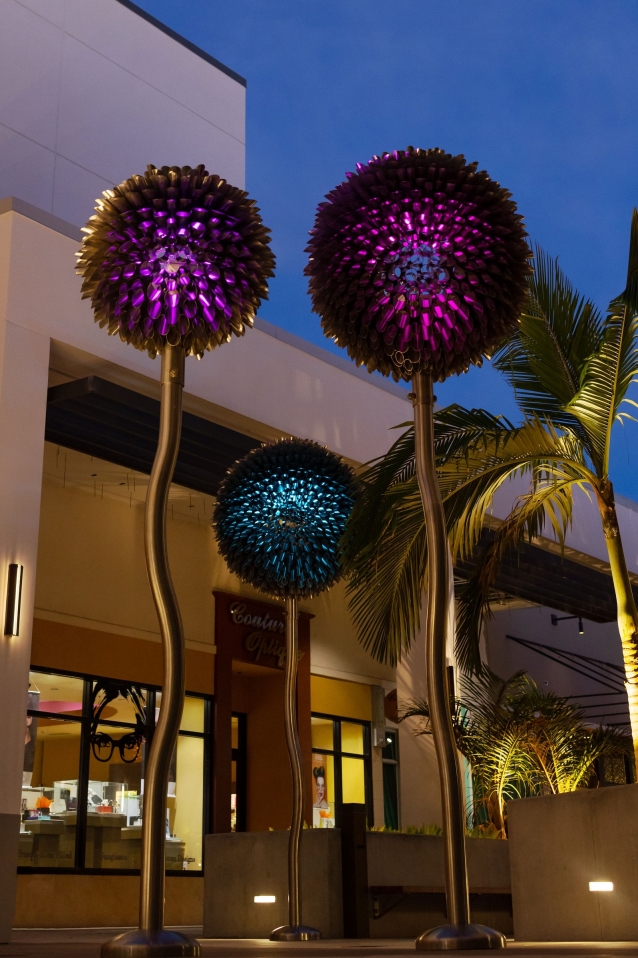 Entry Description‘Blooms’ at Palm Beach is made up of 6 internally lit dandelion-like sculptures over 15’ tall. These metallic flowers are formed with 100% marine grade stainless steel and integrated luminaires meant to withstand hurricane conditions. The blossoms of the immense flora are mostly transparent, creating whimsy and contrast to the immense weight of the art form and amount of steel used in their construction. The Artist and Lighting Design team collaborated on how the lighting would emanate from the center of the bloom out to its hundreds of cylindrical florets and scatter along the pedestrian causeway. To accommodate the see-through nature of the artwork, a major effort to conceal the fixture from view was undertaken. Renderings and 3D studies were produced to develop the perfect mounting position, cable pathing, and custom reflector design to maximize the impact of the lighting within the artwork while avoiding glare or visual interruptions at the centrepiece of the sculpture. Motion sensors were included, creating a layer of interactivity between the sculptures and the pedestrians passing by. When motion is detected, a lighting effect is produced as if the bloom is caught in a breeze
