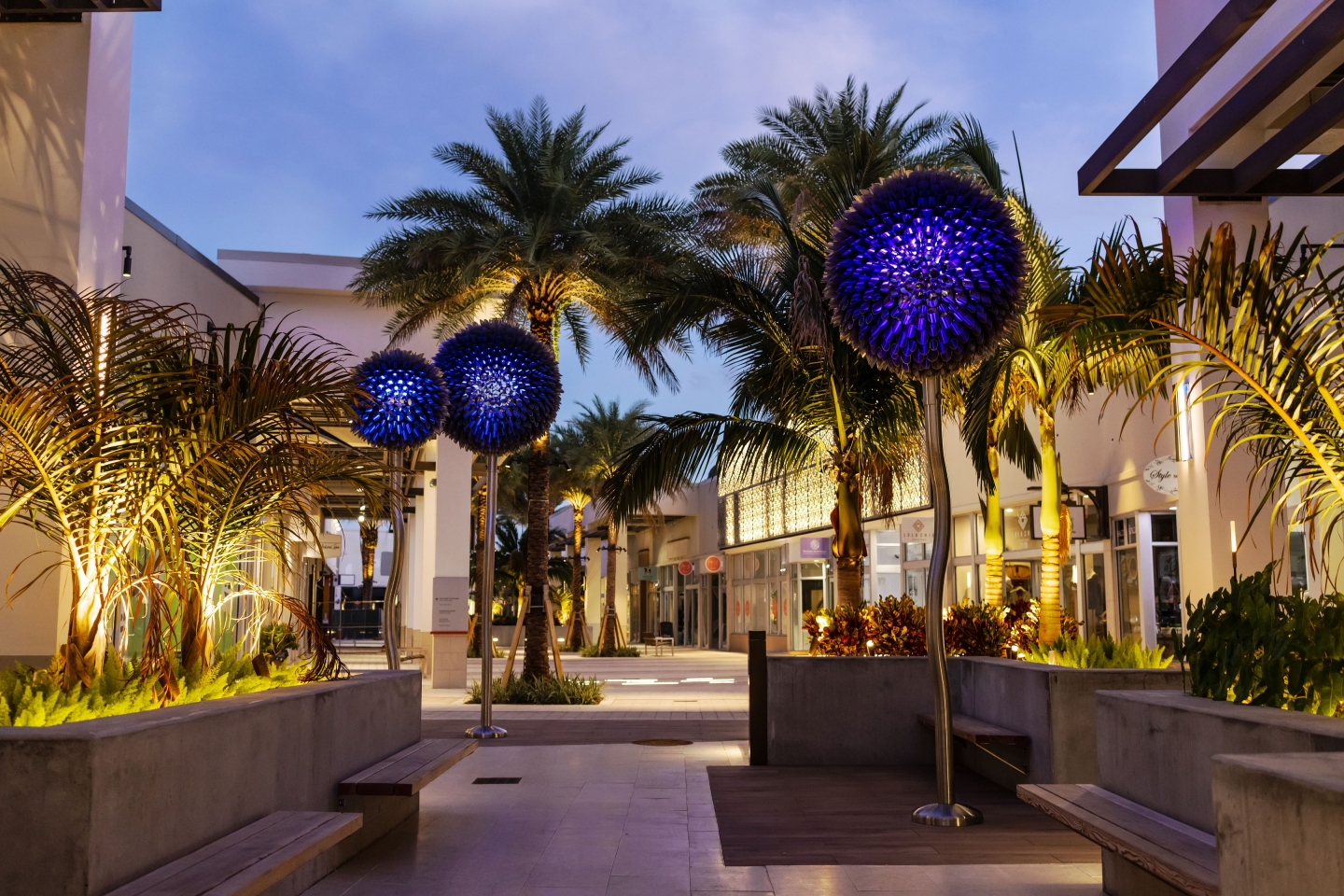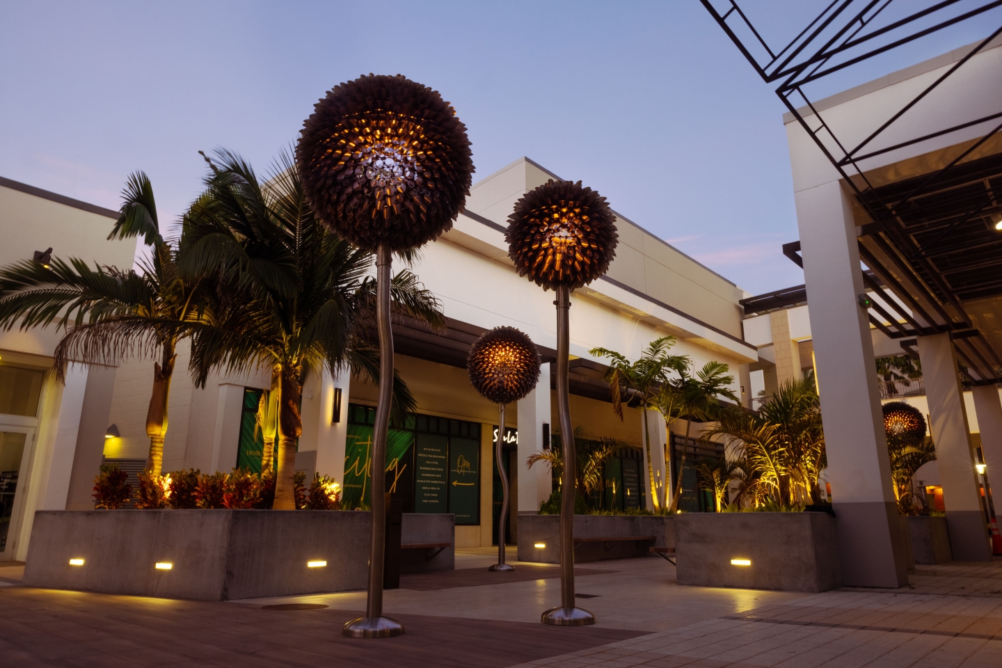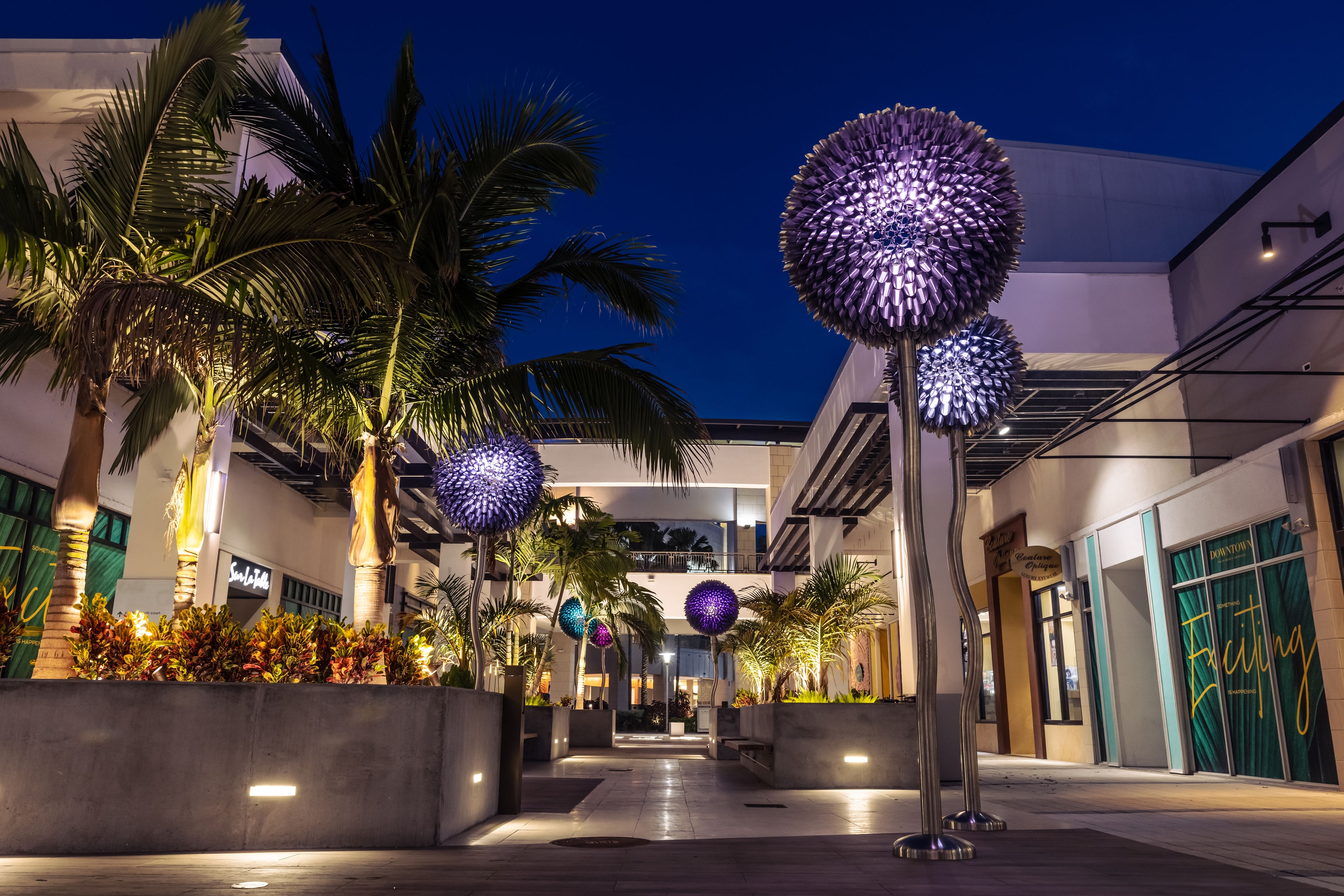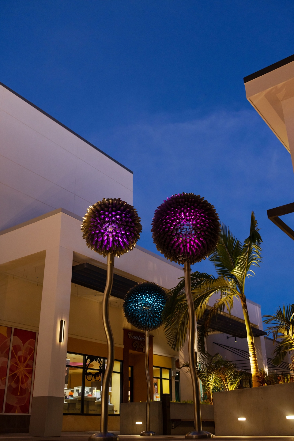 Entry Description‘Blooms’ at Palm Beach is made up of 6 internally lit dandelion-like sculptures over 15’ tall. These metallic flowers are formed with 100% marine grade stainless steel and integrated luminaires meant to withstand hurricane conditions. The blossoms of the immense flora are mostly transparent, creating whimsy and contrast to the immense weight of the art form and amount of steel used in their construction. The Artist and Lighting Design team collaborated on how the lighting would emanate from the center of the bloom out to its hundreds of cylindrical florets and scatter along the pedestrian causeway. To accommodate the see-through nature of the artwork, a major effort to conceal the fixture from view was undertaken. Renderings and 3D studies were produced to develop the perfect mounting position, cable pathing, and custom reflector design to maximize the impact of the lighting within the artwork while avoiding glare or visual interruptions at the centrepiece of the sculpture. Motion sensors were included, creating a layer of interactivity between the sculptures and the pedestrians passing by. When motion is detected, a lighting effect is produced as if the bloom is caught in a breeze