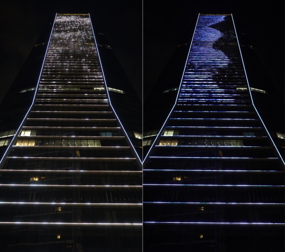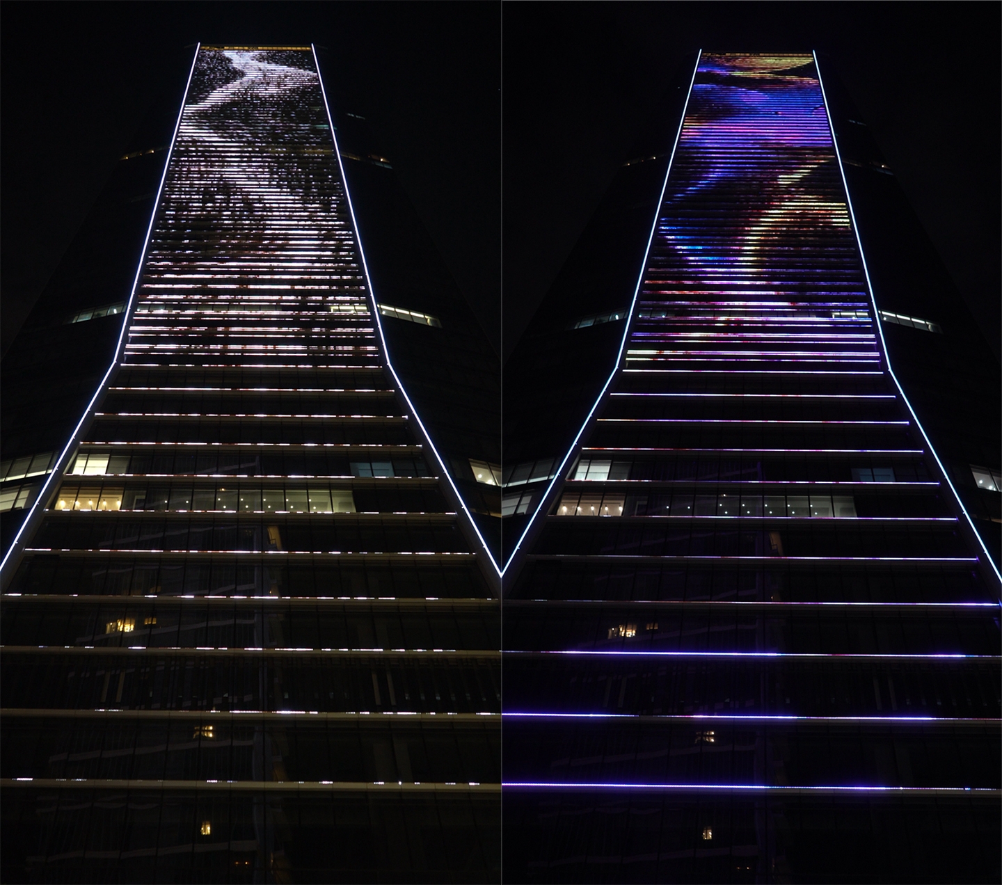 We set up a weather station on top of the 350-meter-tall building, collecting the real-time data of wind, air pressure, air quality, tide, temperature and humidity. With the technology of the data visualization, data was reorganized and media architectural art was created accordingly.