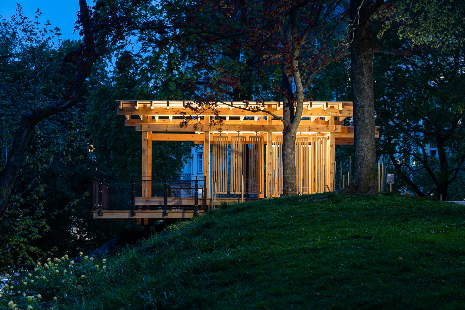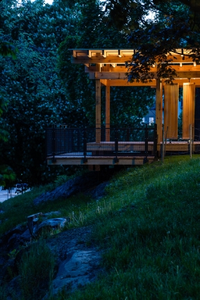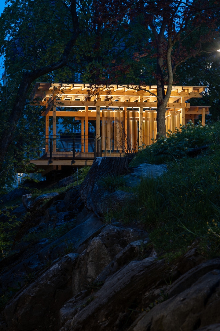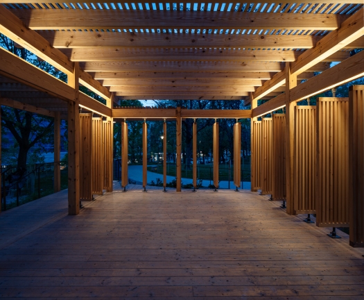 Thanks to a simple but sophisticated concept, and a well-integrated lighting design, the architecture is highlighted in a pleasant way and helps emphasizing the warm tone and feel of the wooden material of the pavilion. Integrated upwards aiming linear luminaires that are hidden behind the wooden beams contribute with a calm and soft lighting to the ceiling. This combined with downwards aiming linear luminaires that also are hidden highlight the pavilion’s warm and calm mood, creating a safe haven in accordance with the initial citizen proposal.