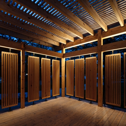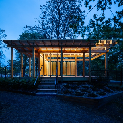 The Yoga Pavilion has a simple and robust frame with carpentry and material selection that contribute to achieving a high quality and low climate impact. The construction is mainly made out of wood from Swedish core pine. Tyréns' lighting designers have together with Nyréns designed and developed the concept for the lighting design for the pavilion known as the Yoga Pavilion.