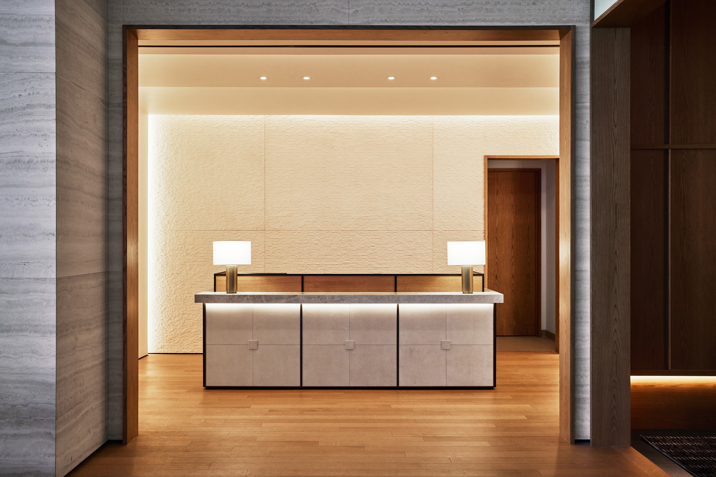Complementing the elegance of the undulating facade by Skidmore, Owings, & Merrill, the exterior lighting used discreetly placed fixtures for soft, understated light concentrated at the entry, drawing the eye inside. Inside, the lighting designer crafted varied layers of lighting into the spaces and objects throughout, working with the interior designer Gachot Studios on bespoke decorative lighting.