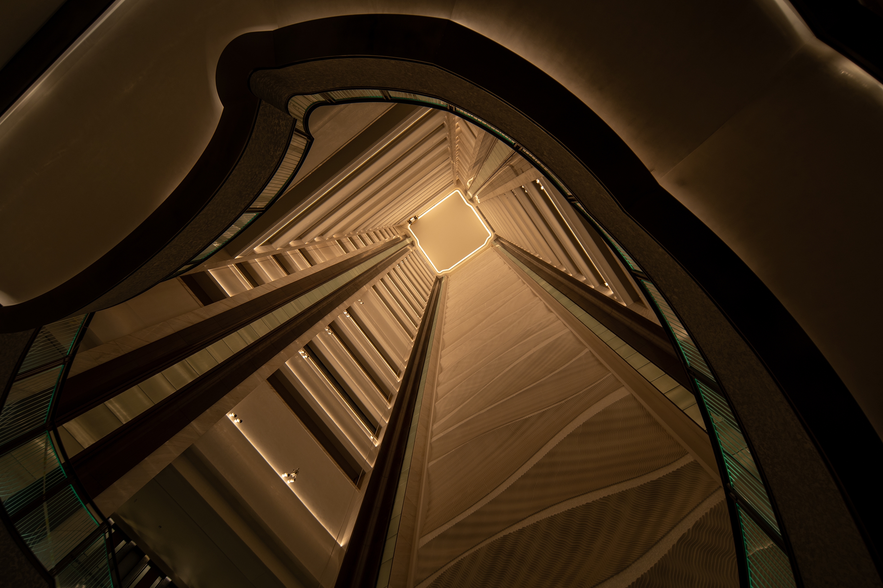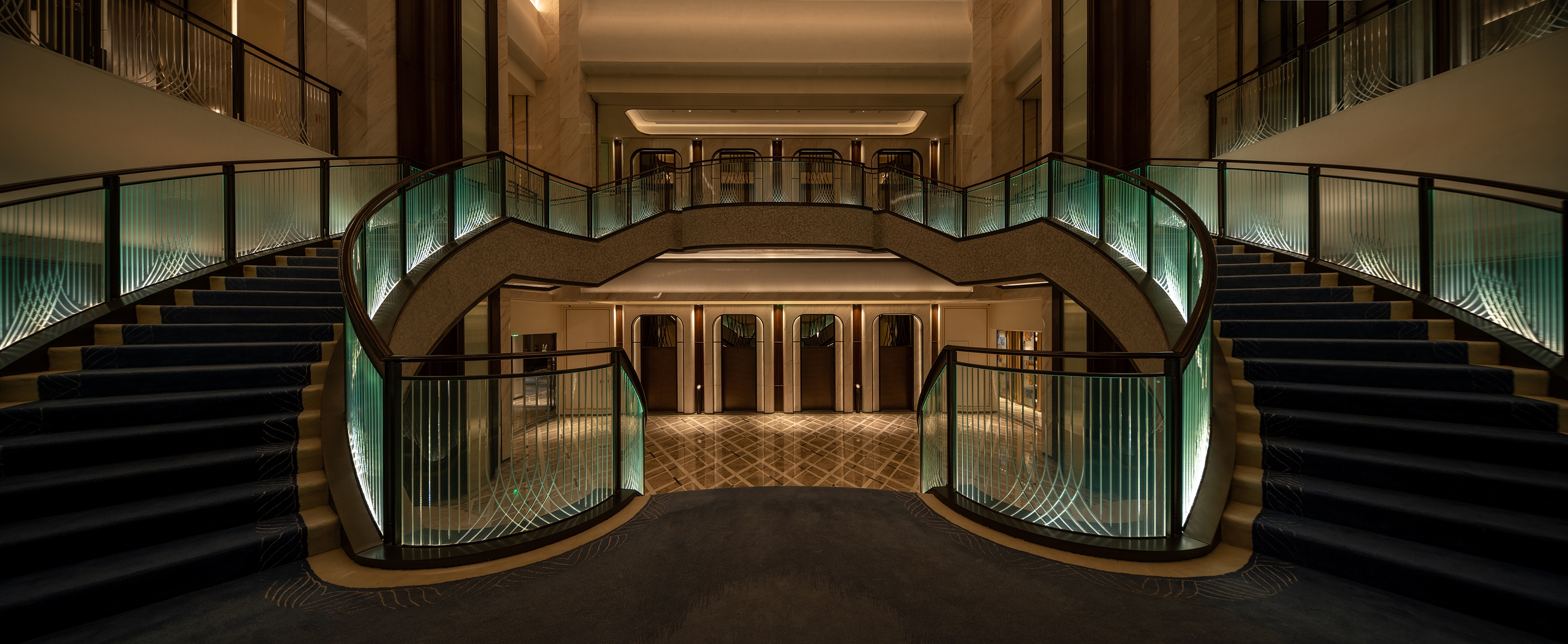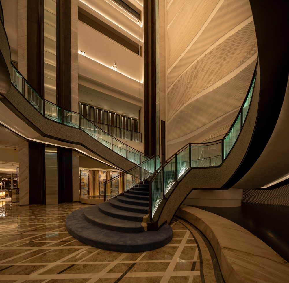 The revolving staircase in the atrium is a tribute to New York's Gilded Age masterpiece and an iconic element of the St. Regis Hotel. Behind it, is the 74 meter high atrium art wall, with wide Angle flood lights, and the soft lights show the mottled traces left by the waves on the beach after the tide receded.