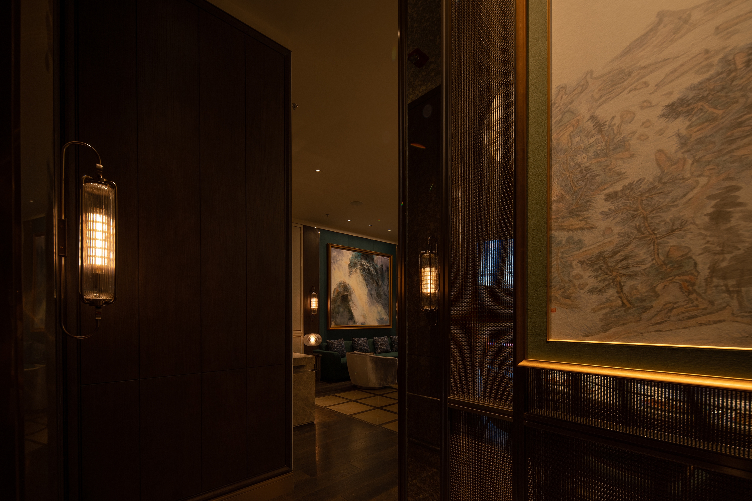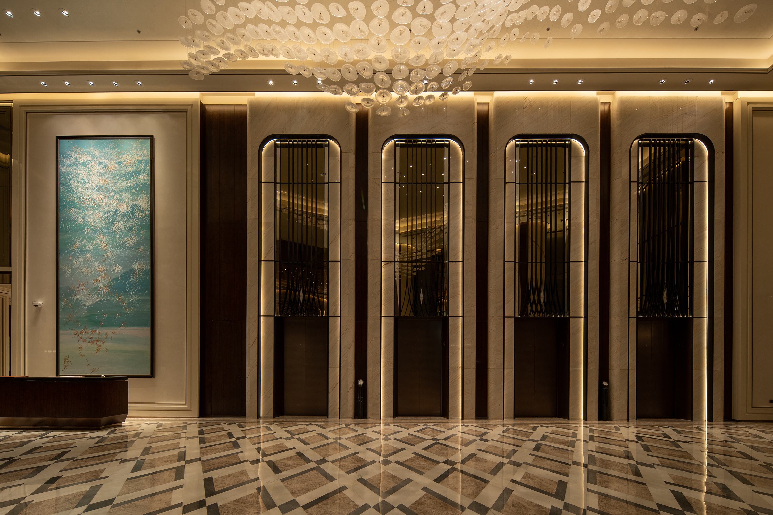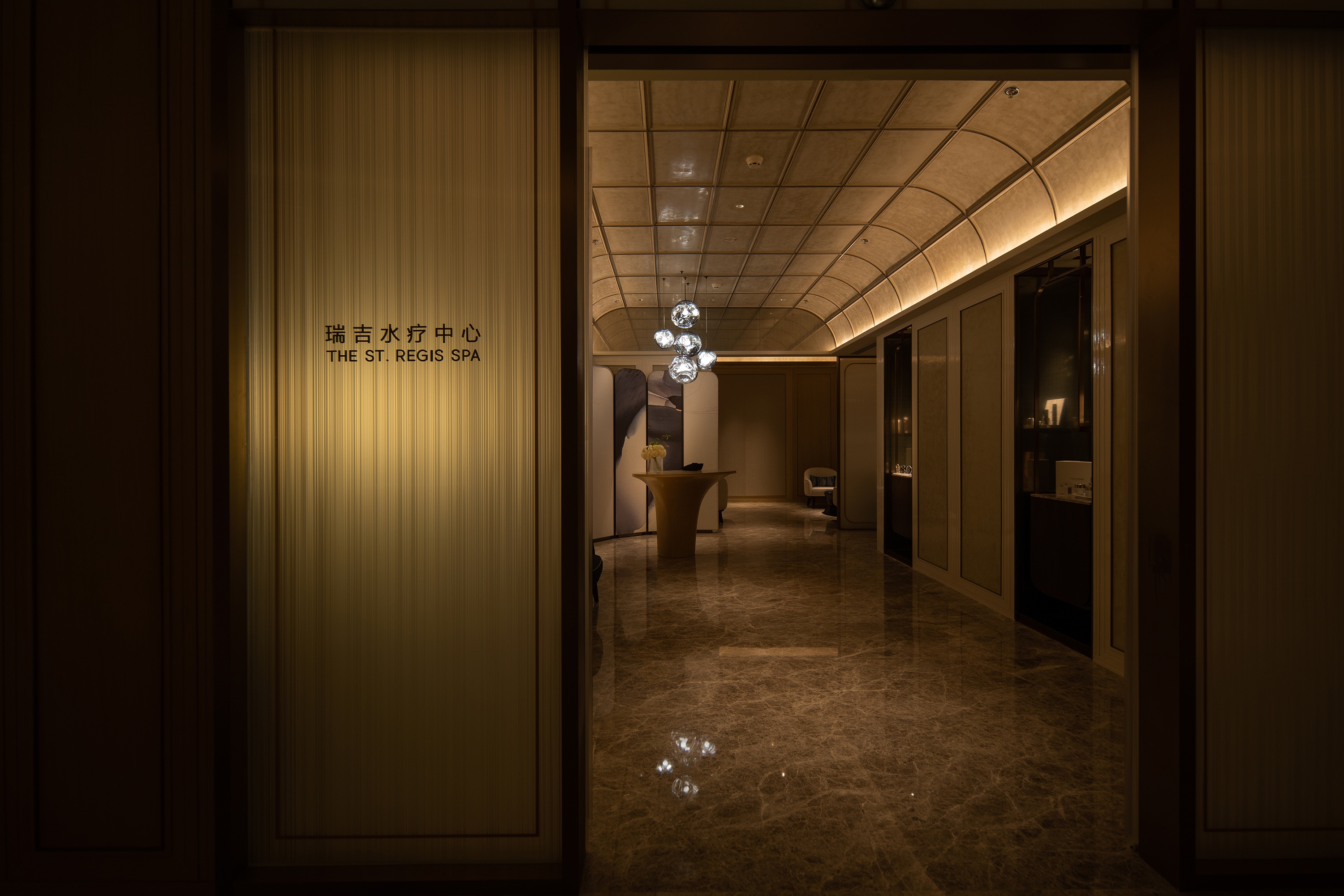 Uniform warm ambient light for the arrival lobby brings profound aesthetic feeling, passengers can realize the Regis hotel is different when they get in this area.