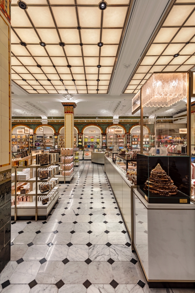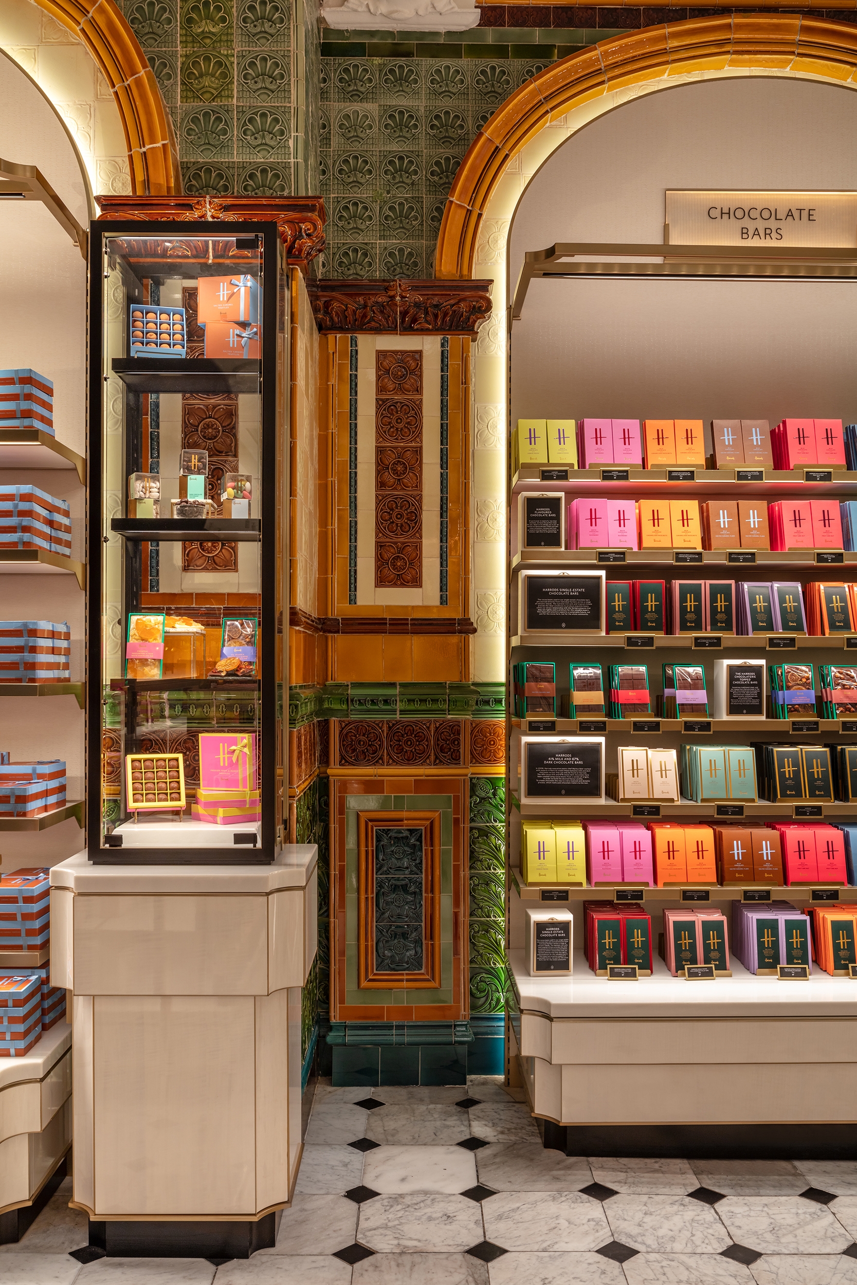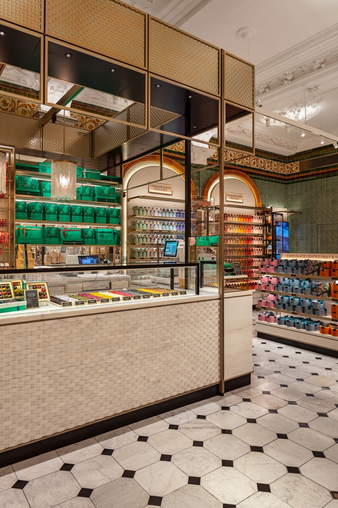 Entry DescriptionThe fourth and final Edwardian food hall project had many unique challenges inspiring bespoke integrated solutions, to ensure high levels of product focussed illumination in balance with sympathetic architectural lighting to showcase the halls unique character and architecture. Lighting details are all uniquely tailored to products or features, ensuring the lighting is complementary to exposed chocolate, as well as varied packaging, historic plaster mouldings, architectural finishes, decorative tiling and guests complexions. High colour rendering 2700K was key for an inviting hospitality feel to architecture and when expressing the rich tones of the varied chocolates on sale or in production. Shelving was designed to a minimum brief of 2000lm on product, and perimeter shelving had to achieve this without additional illumination from the historic ceiling, while ensuring products could be stacked to the front of shelves and protected from heat generated by lighting.