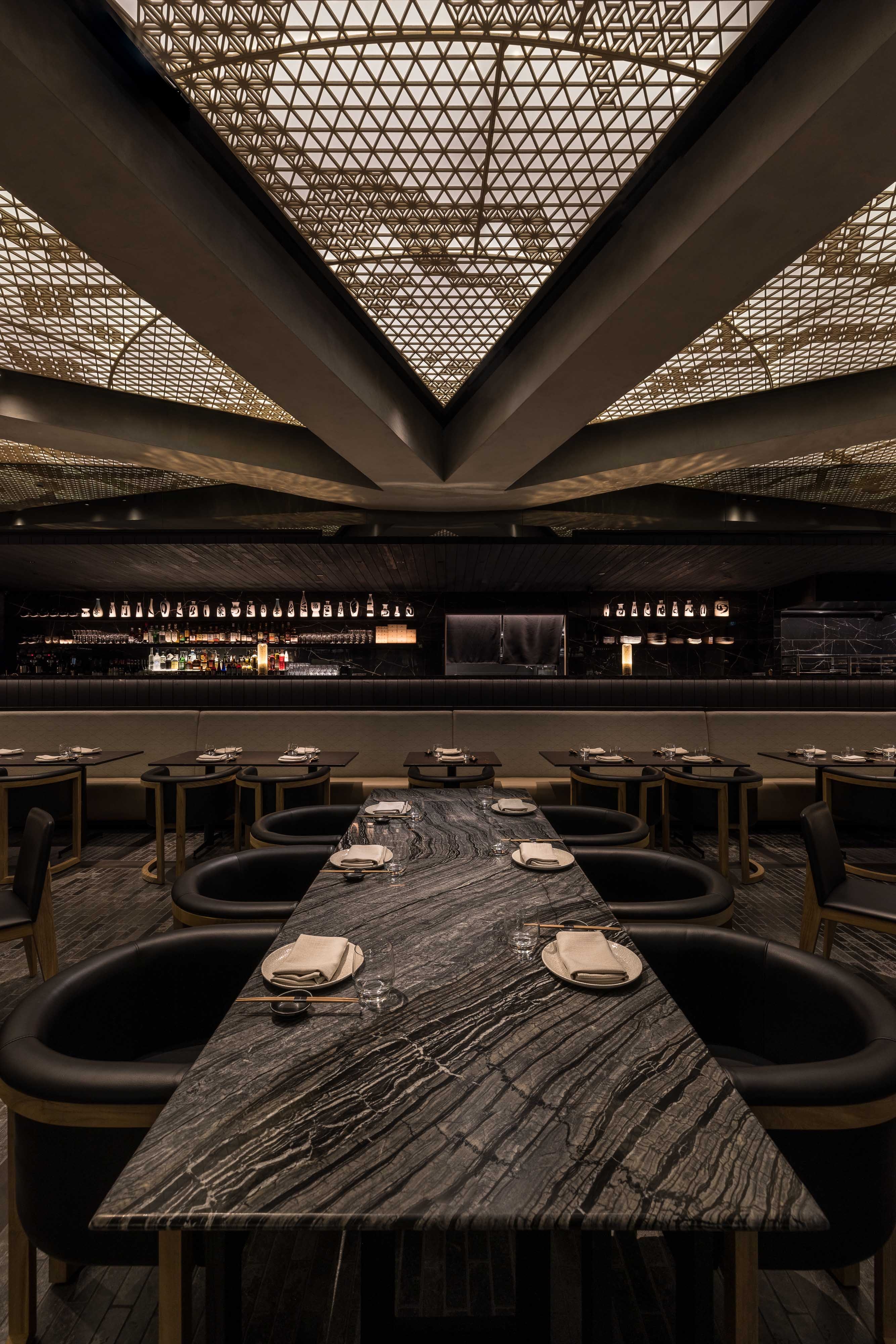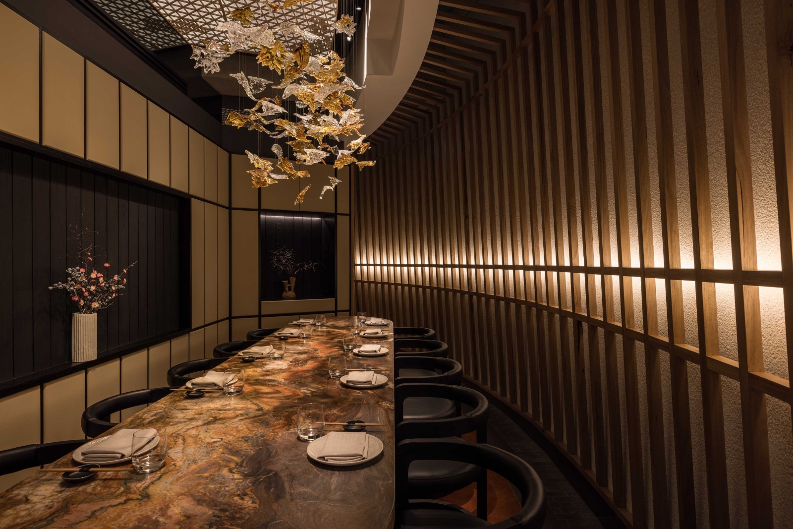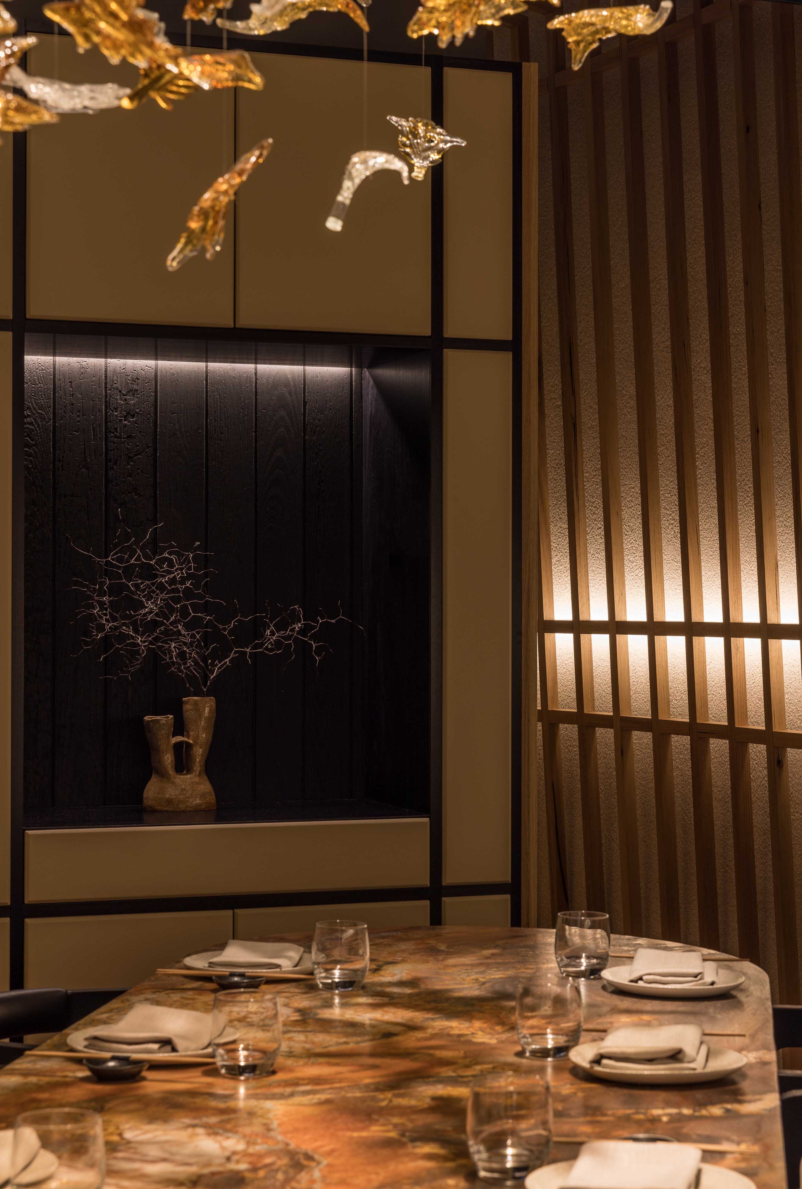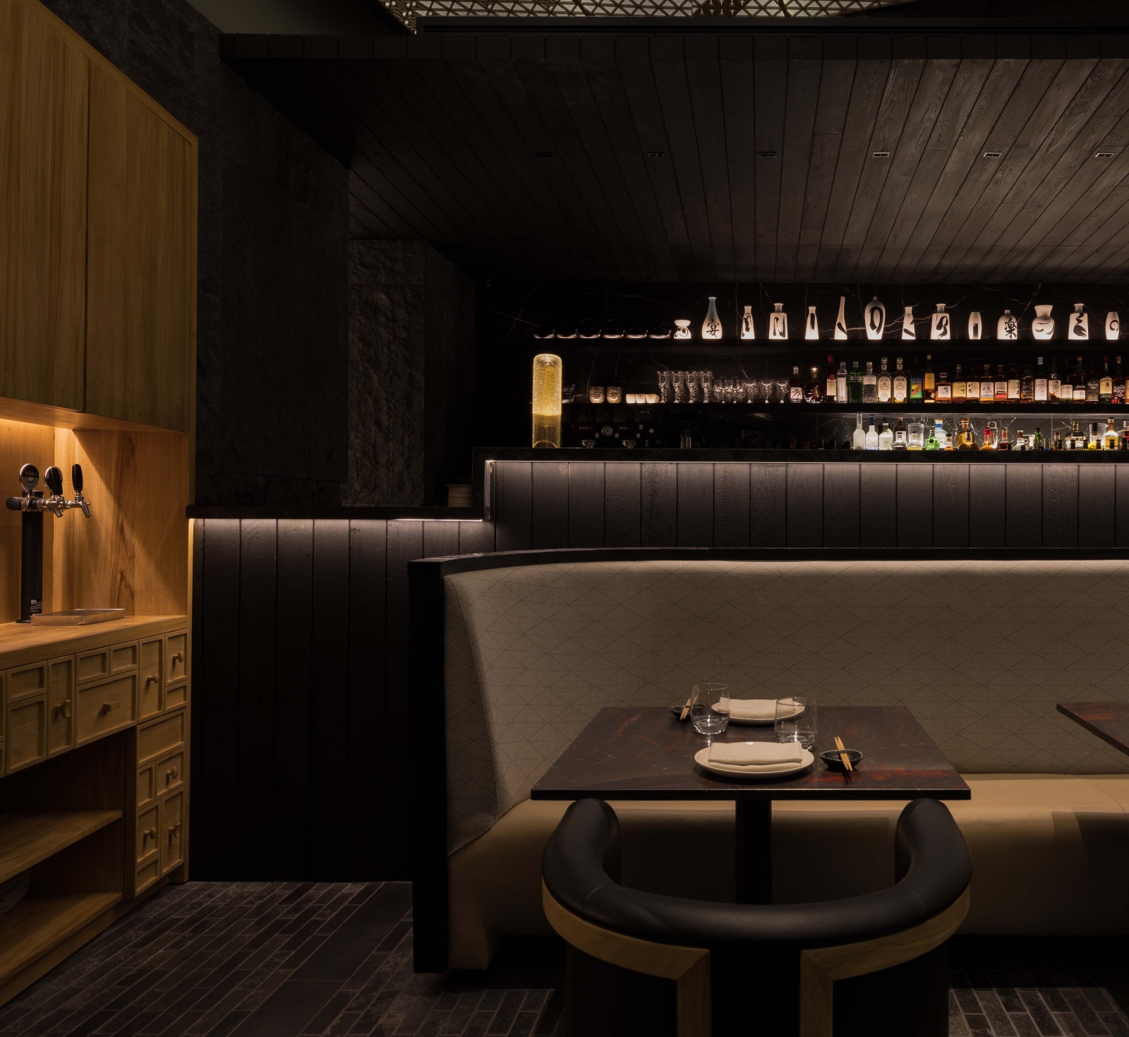 Delicacy in the menu doesn’t preclude drama in the venue.The open kitchen mimics a Noh theatre stage. It’s partly out of necessity – the interior designer had to work around the heritage-listed Harry Seidler base design. The raised kitchen is topped by a burnt timber canopy, housing near invisible glare-free downlights providing focused light to the chef’s workbench below. 4x custom crackle-glass lanterns sit at the front of the kitchen bench, reminiscent of vintage stage foot-lighting – adding weight to the kitchen theatrics.