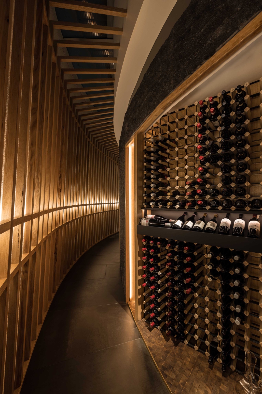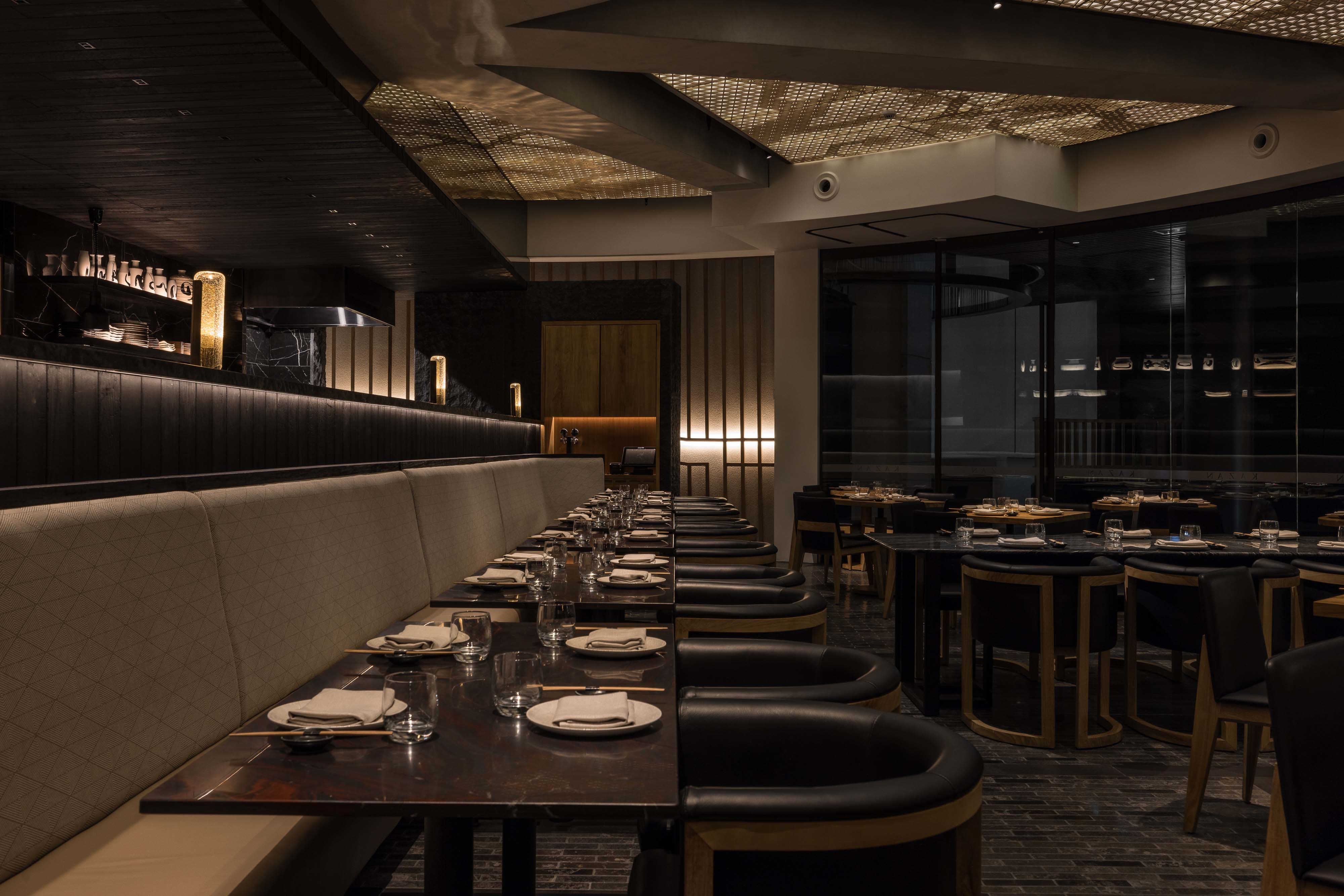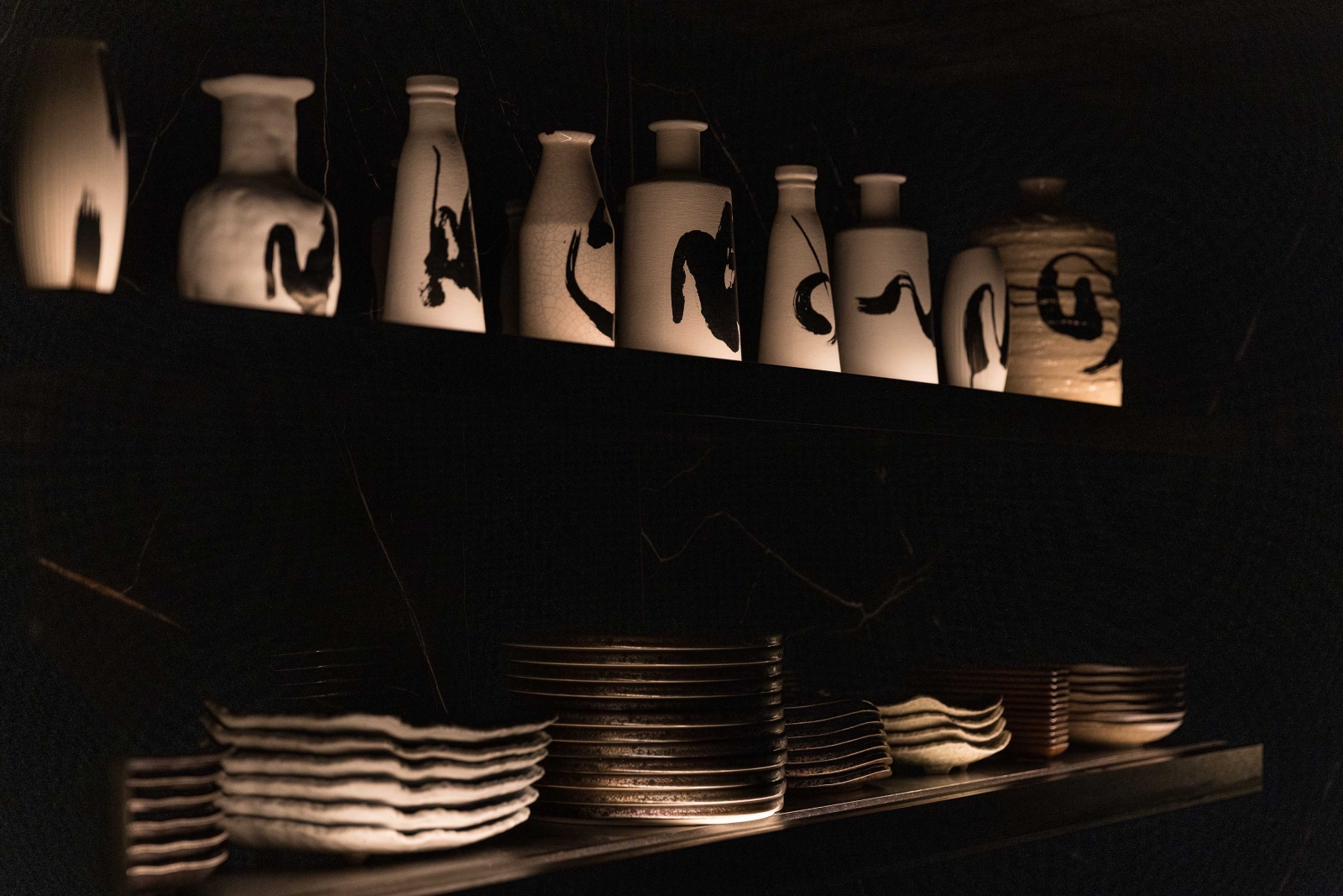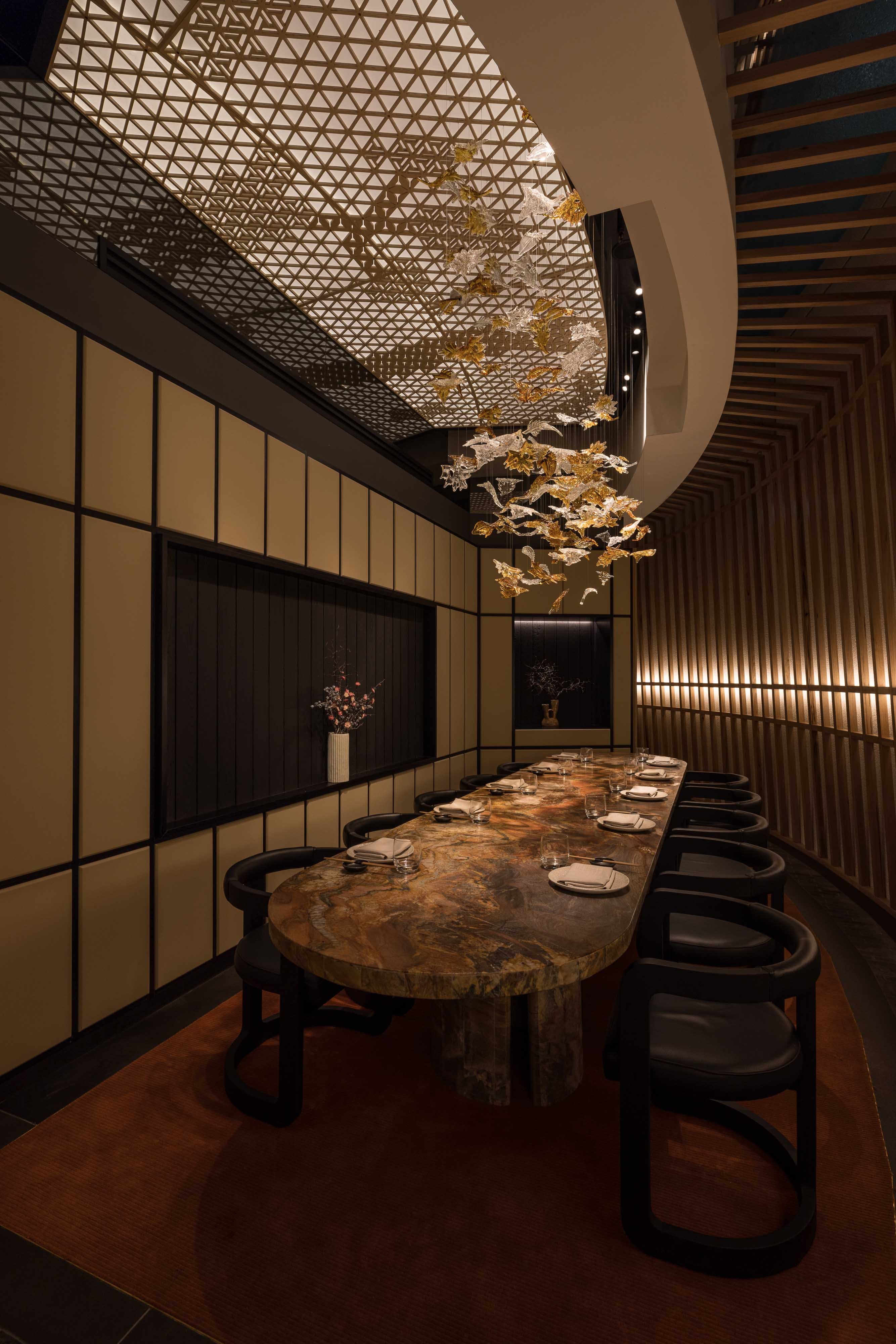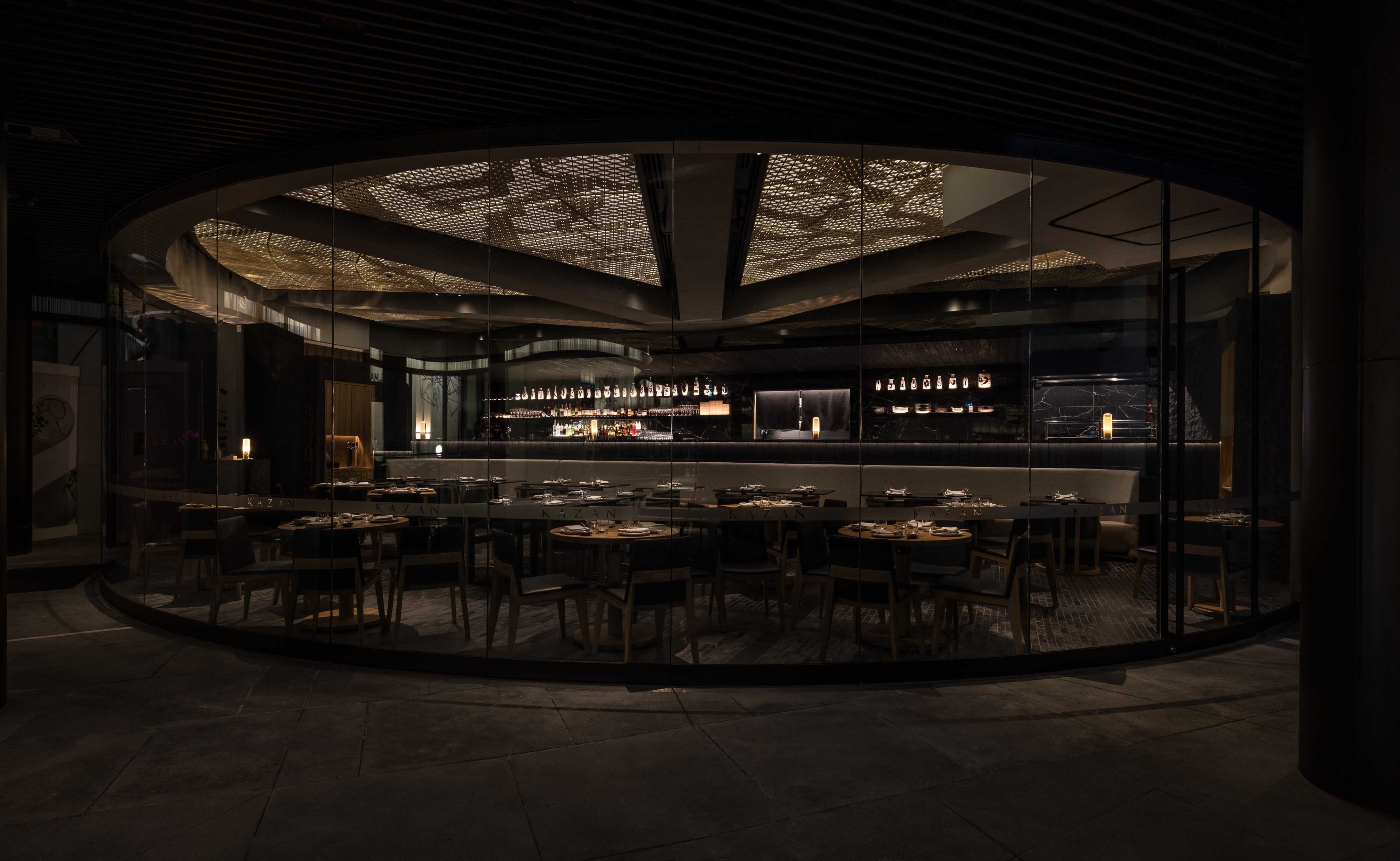 Delicacy in the menu doesn’t preclude drama in the venue.The open kitchen mimics a Noh theatre stage. It’s partly out of necessity – the interior designer had to work around the heritage-listed Harry Seidler base design. The raised kitchen is topped by a burnt timber canopy, housing near invisible glare-free downlights providing focused light to the chef’s workbench below. 4x custom crackle-glass lanterns sit at the front of the kitchen bench, reminiscent of vintage stage foot-lighting – adding weight to the kitchen theatrics.