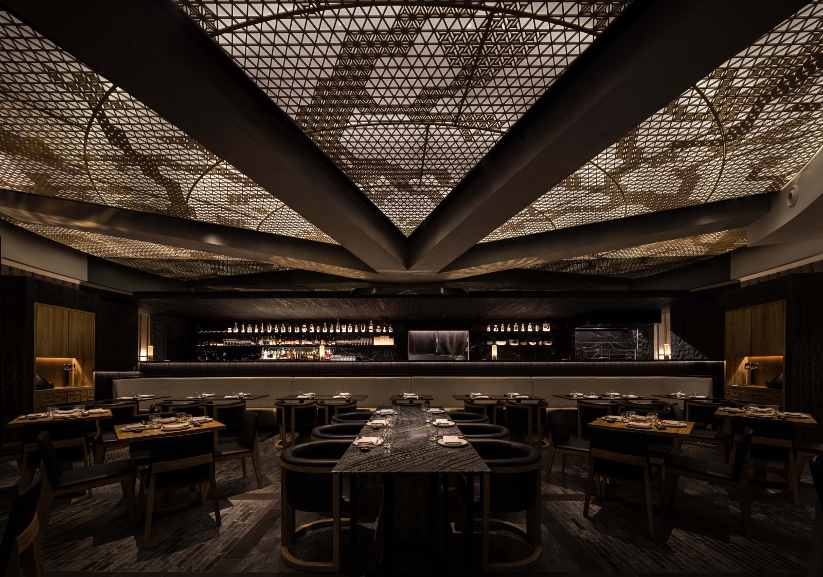 Extending above the main dining hall sits a geometric kumiko-inspired soffit,nestled between the expressed Seidler ‘star’ structure.A custom designed LED panel-light system provides a homogenous glow behind the CNC cut panelling & a jig-saw arrangement of acrylic diffusion sheeting (to avoid visible joints), creating a theatrical but ambient layer of light.This layer provides a powerful statement on the base architecture, with a depth & luminosity that varies throughout the day