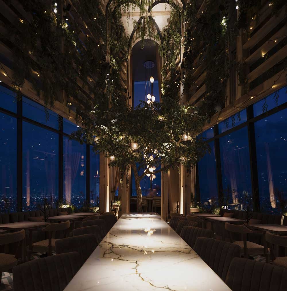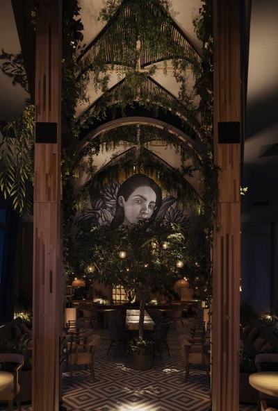 In the triple height tip of the building a cathedral inspired wooden central nave filled by a climbing plant connects a custom-made chandelier and a mural creating a visual tension only visible at night. Through soft indirect light the upper green layer subtly appears as a backdrop. Small projectors with a precise 3º beam mounted on the structure, create an individual light spot on each table resembling a candlelight, while a soft accent illuminates the eyes on the mural.