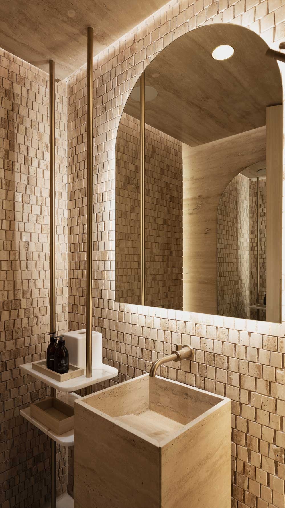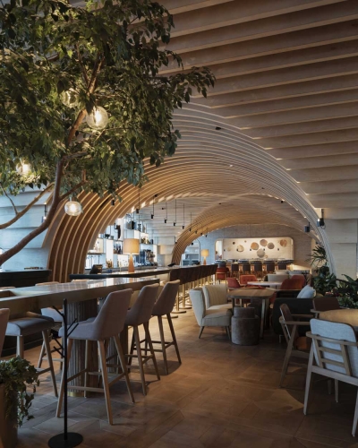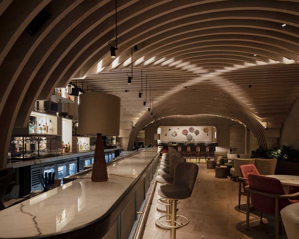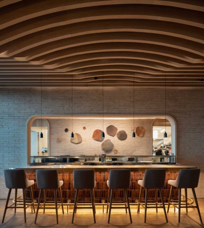 The sushi bar characterized by a handcrafted wooden stereotomy resembling a cross-vaulted ceiling was the next challenge. To emphasize the edges of the arches a light fixture was adapted to reveal the shape and enhance the architecture. Throughout the project decorative light fixtures deliver warm light joining all spaces together.