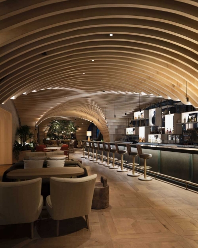 The lobby is an elliptical 3D lattice backlit through grazing light achieved with hidden small fixtures. The luminous ceiling made of natural fibers provides a soft general lighting.