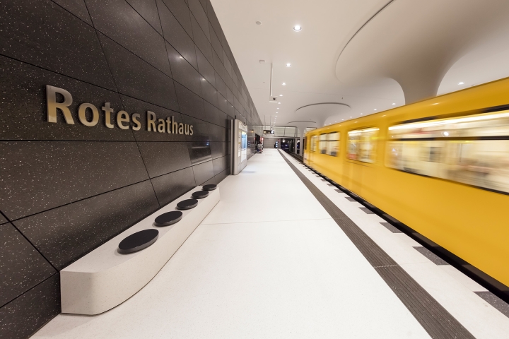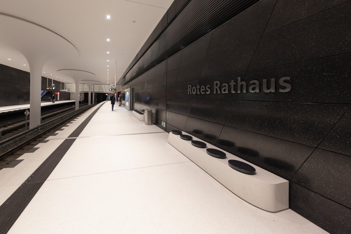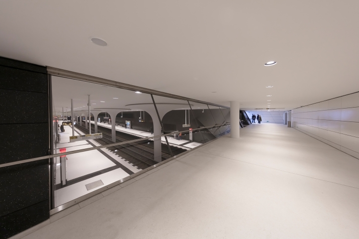 The station was designed in simple black and white colors, while polished terrazzo tiles provide an elegant appearance. The staircases are kept in dark colors to create a certain drama resulting in a radiant reception flooded with light when entering the 140-meter-long station hall.