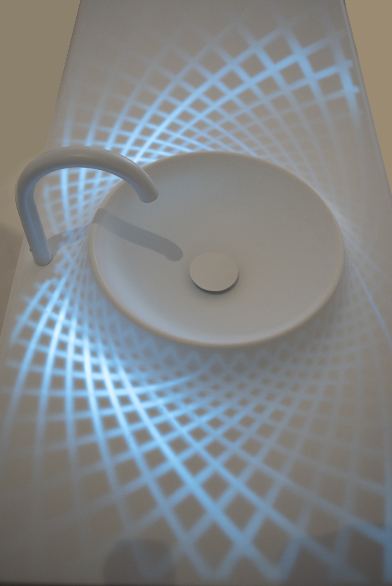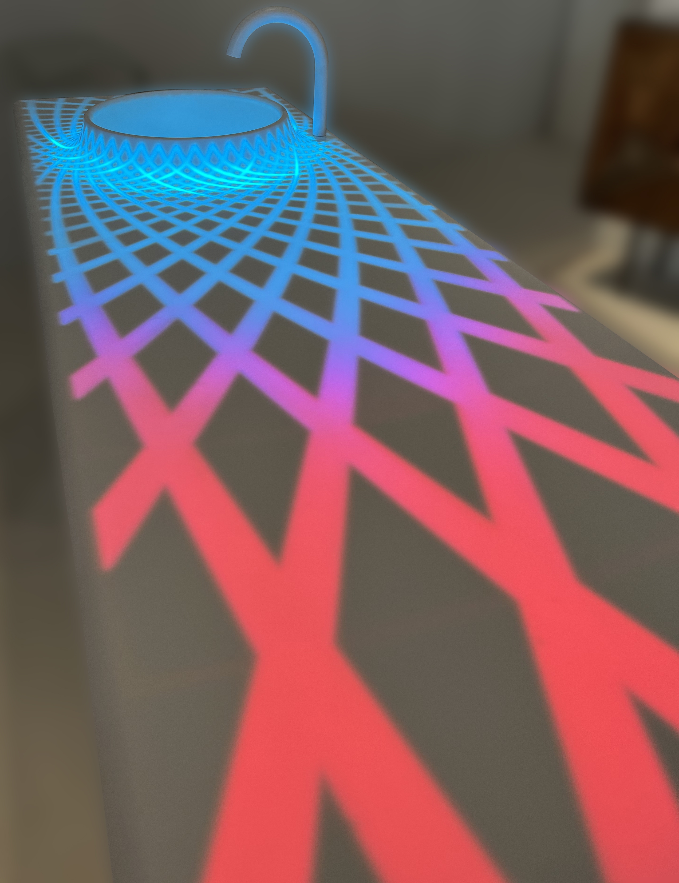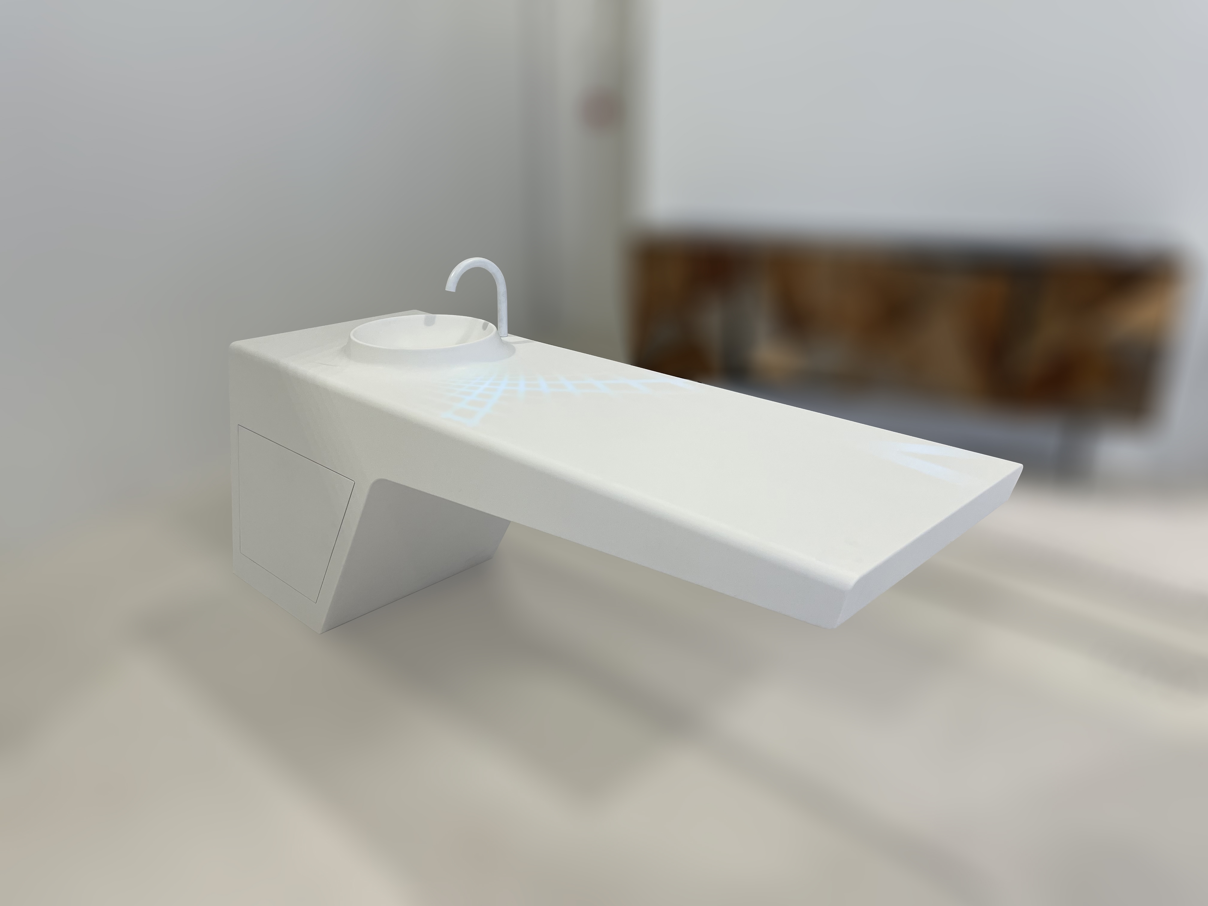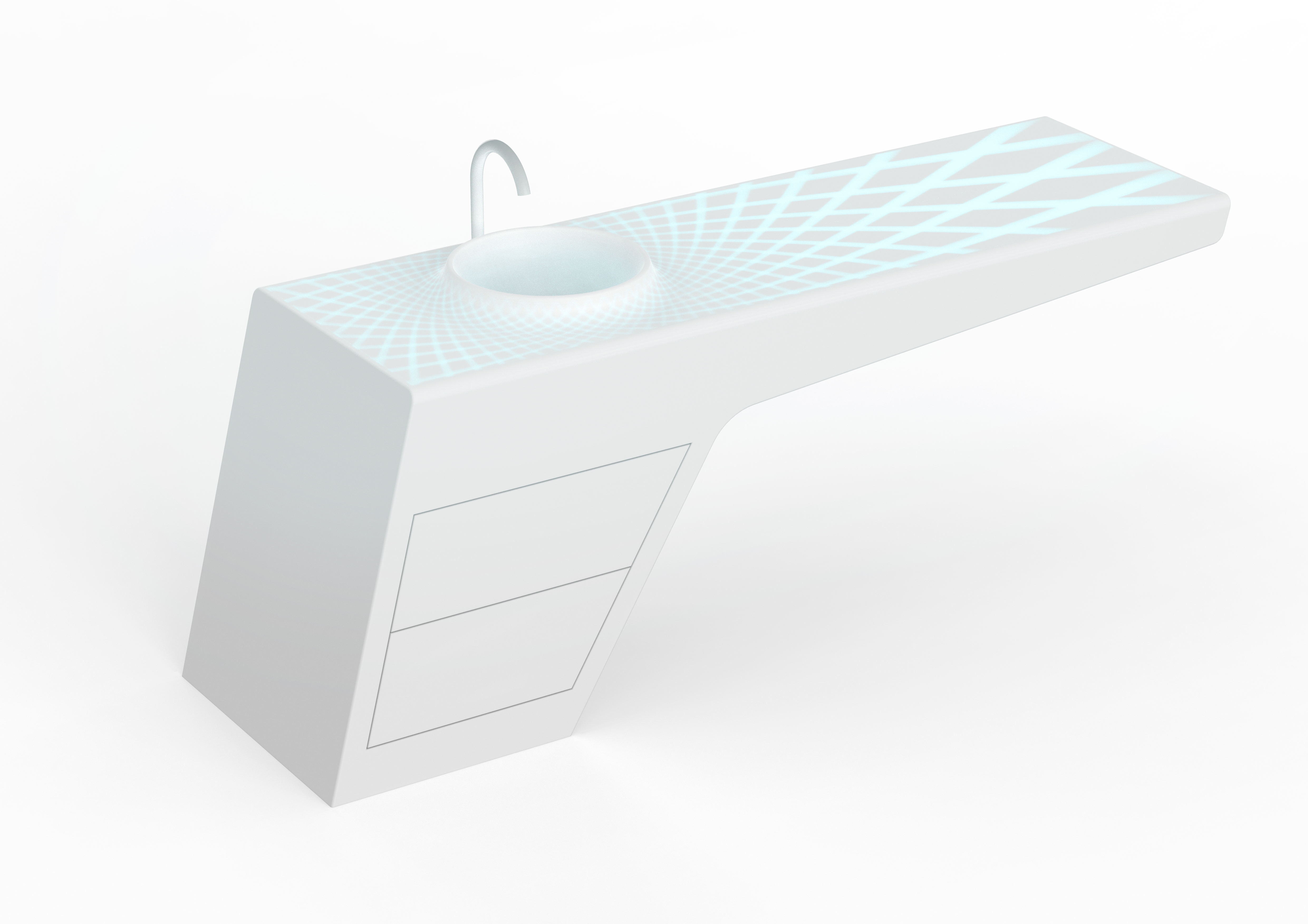 Entry DescriptionPlanit th(s)ink (meaning: thinking about sustainability, water and nature + sink) is the first smart sink with integrated water-saving signaling system, aiming to sensitize users to have a more sustainable relationship with the consumption of water. Manufactured from Corian, diamond pattern grooves integrating RGB-LED light strips are machined on the underside of the sink module. The RGB-LED light shines through the thinner Corian material left by the machined grooves, highlighting the diamond shaped pattern on the top-side of the sink module. A soft welcome light-pattern impulse inspired by a human heartbeat starts from wherever the sink is touched and runs over the whole surface of the sink like a wave. After the first impulse, the lights are programmed to emit static blue colored light when water starts running through the tap, providing a secondary light source and mood lighting. When water is flowing through the tap, the light changes color over time, from blue to red, according to the water usage. Thus, the user is visually notified when water flows for too much time, providing a cue to limit the consumption of water.