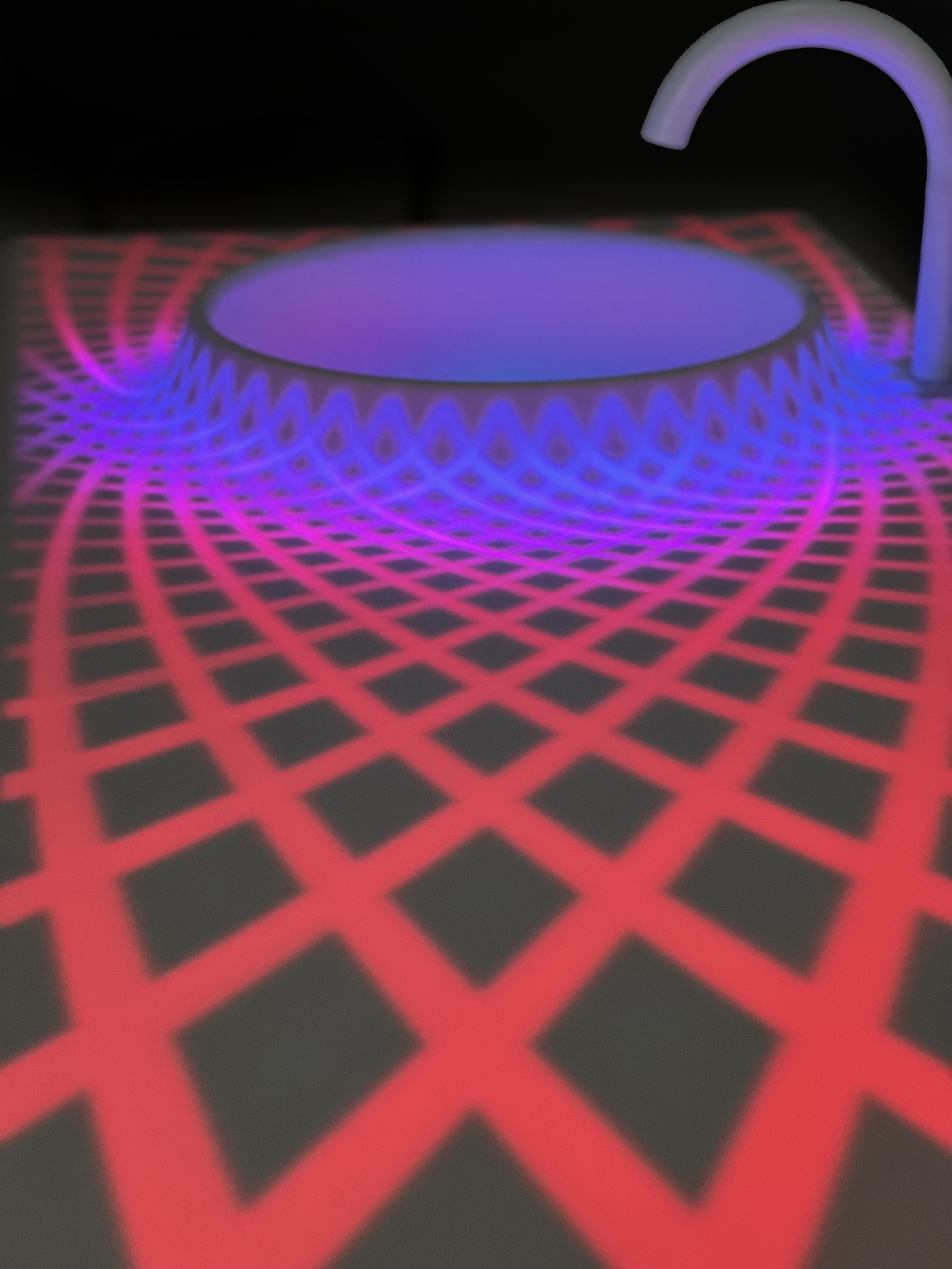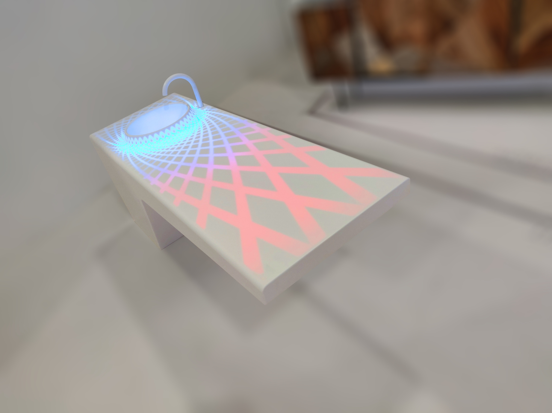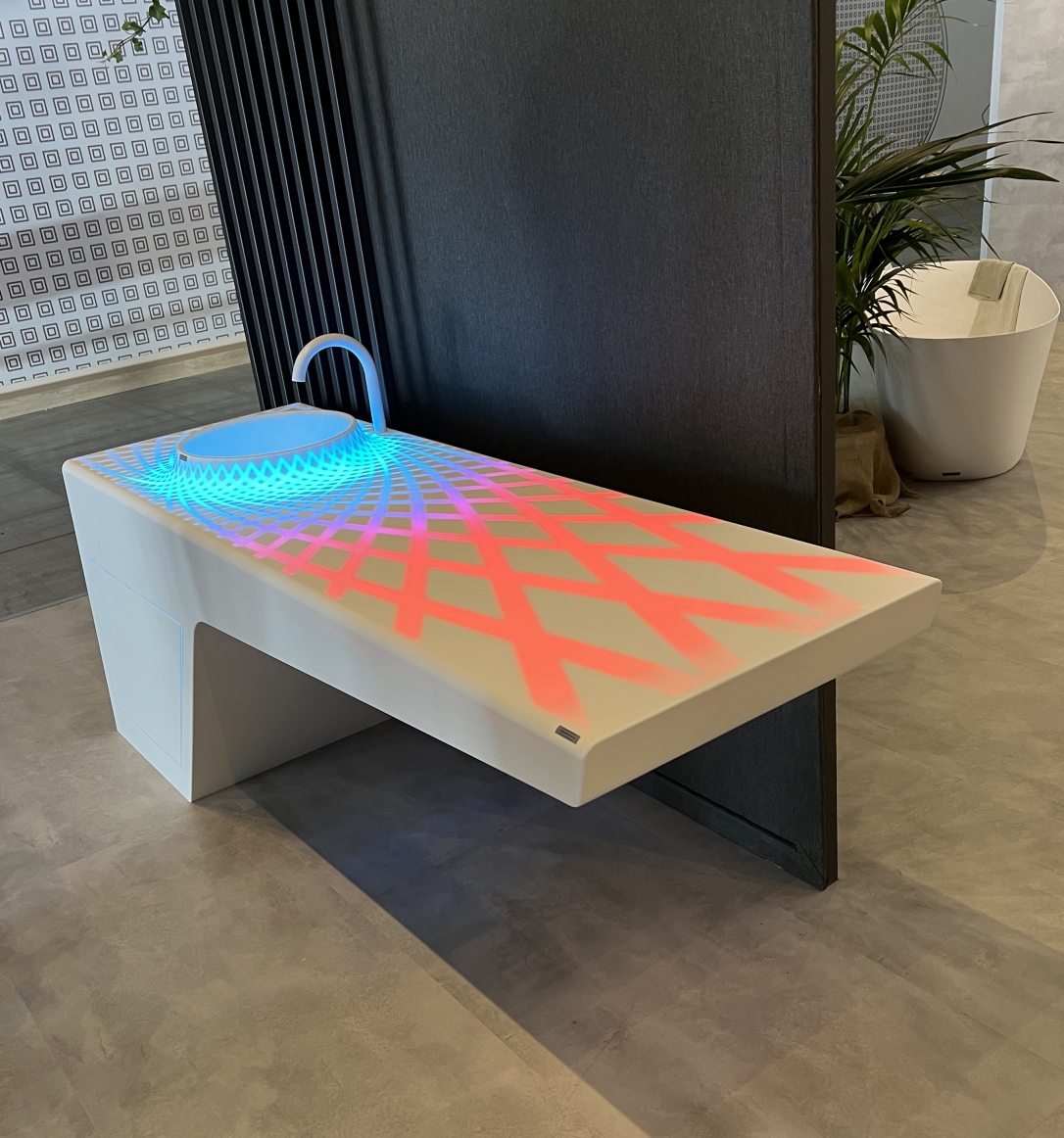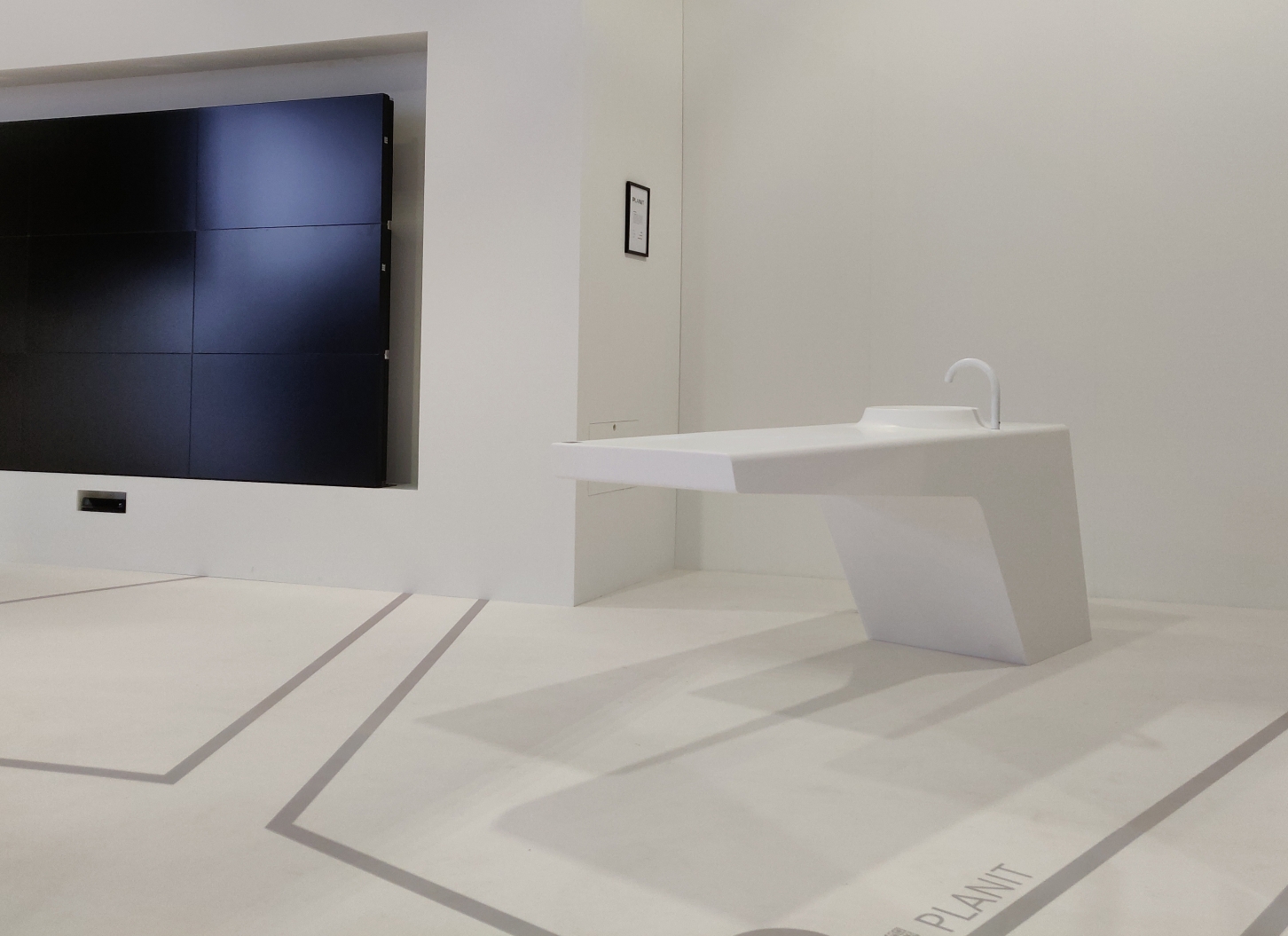 Entry DescriptionPlanit th(s)ink (meaning: thinking about sustainability, water and nature + sink) is the first smart sink with integrated water-saving signaling system, aiming to sensitize users to have a more sustainable relationship with the consumption of water. Manufactured from Corian, diamond pattern grooves integrating RGB-LED light strips are machined on the underside of the sink module. The RGB-LED light shines through the thinner Corian material left by the machined grooves, highlighting the diamond shaped pattern on the top-side of the sink module. A soft welcome light-pattern impulse inspired by a human heartbeat starts from wherever the sink is touched and runs over the whole surface of the sink like a wave. After the first impulse, the lights are programmed to emit static blue colored light when water starts running through the tap, providing a secondary light source and mood lighting. When water is flowing through the tap, the light changes color over time, from blue to red, according to the water usage. Thus, the user is visually notified when water flows for too much time, providing a cue to limit the consumption of water.