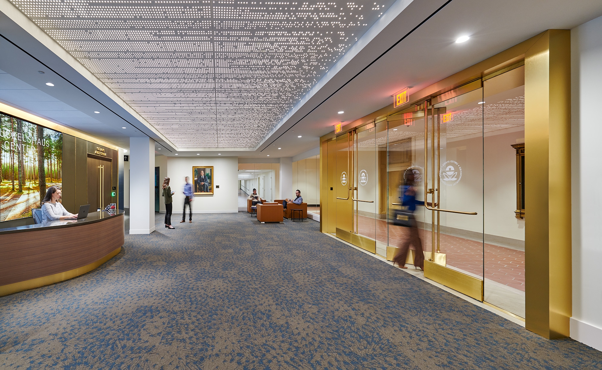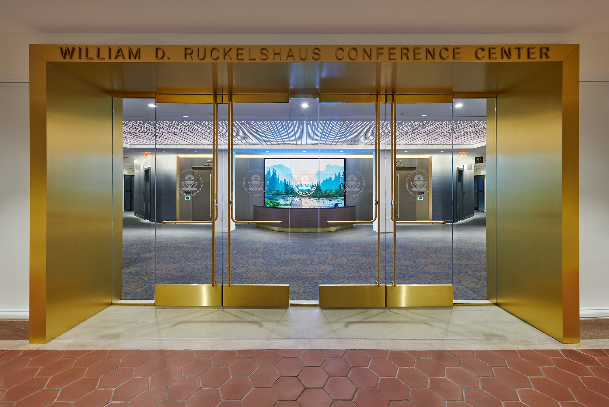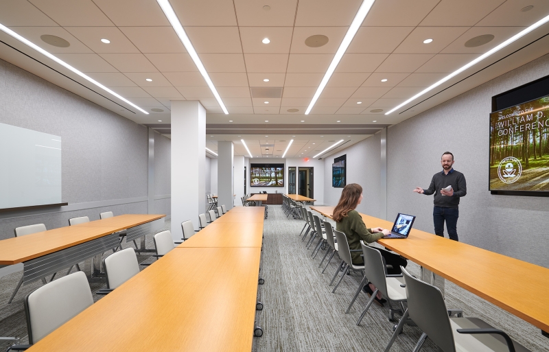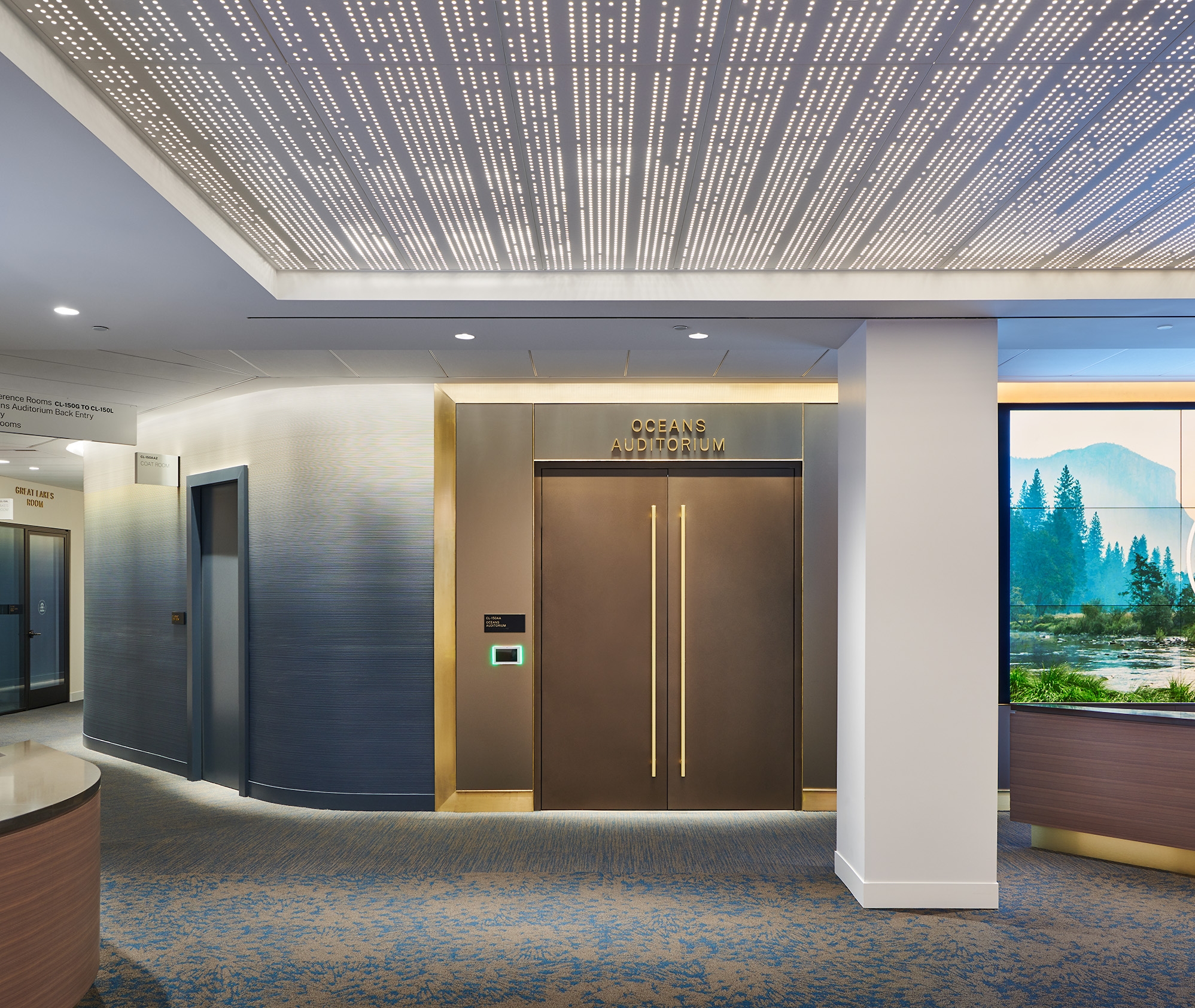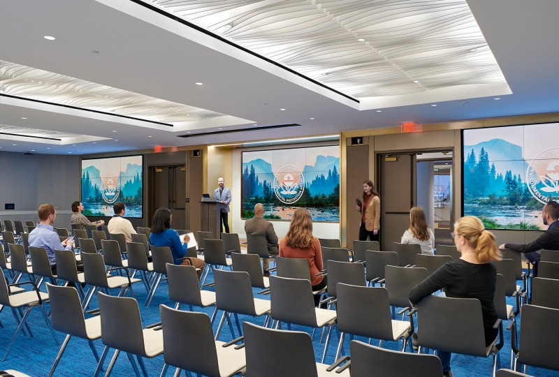 Entry DescriptionThe 18,000 SF government conference center project, installed in a DC office building basement space, (formerly used as a cafeteria) consists of a large multipurpose auditorium and several smaller meeting rooms plus reception, circulation, breakout areas, and support spaces. Digitally addressable LED sources used throughout the project with 90+CRI provides the users maximal flexibility of control for expansion and modification of use over time. Vertical surfaces that include identifying graphics are washed with the use of recessed downlights throughout circulation and lounge areas. Perforated ceilings glow with the use of concealed asymmetric indirect illumination of whitewashed shallow cavity surfaces netting an elegant modern expression of ornamentation throughout.