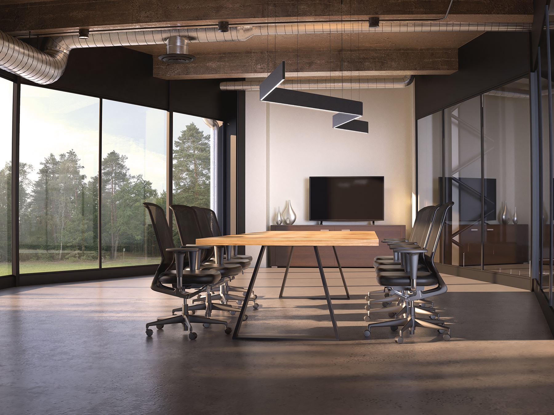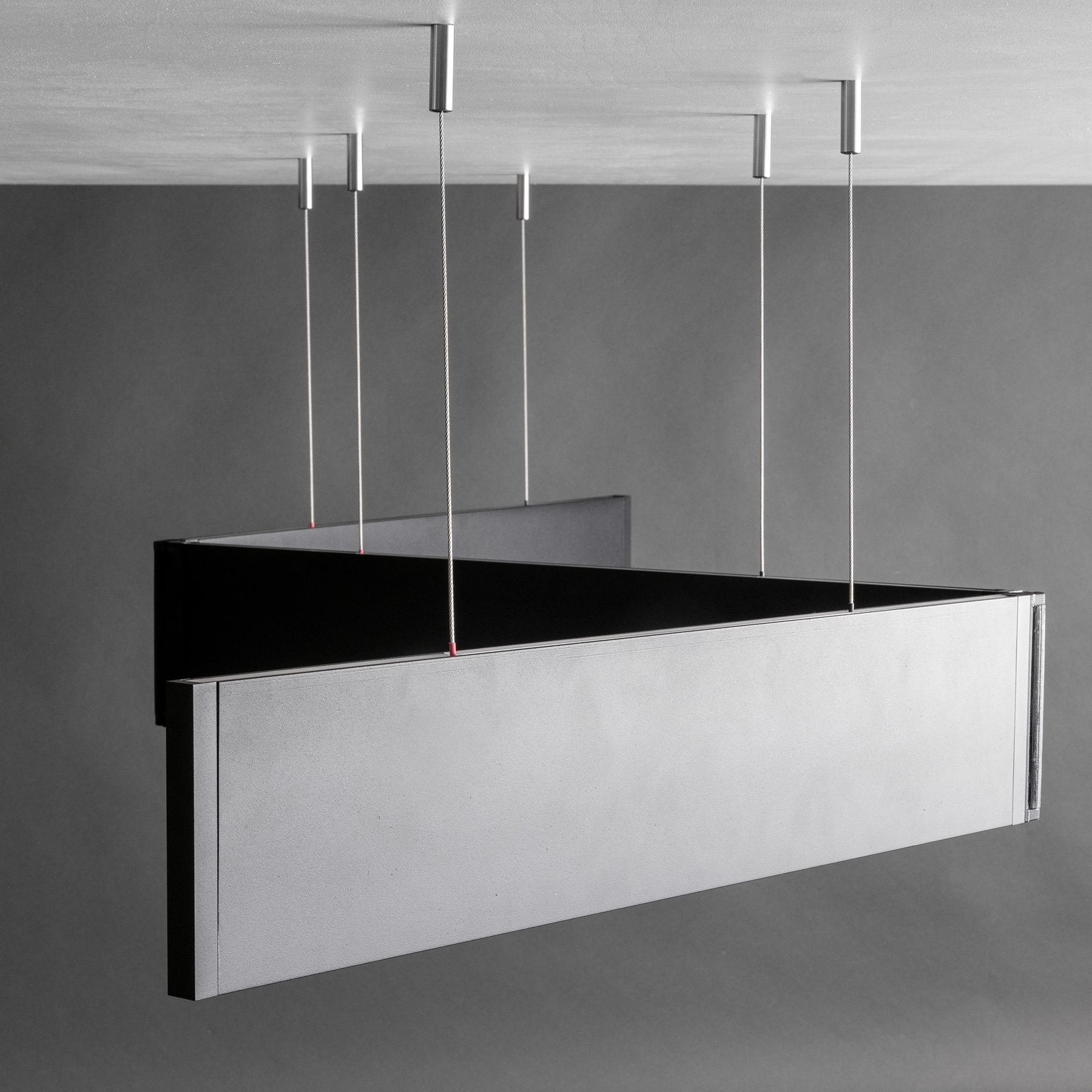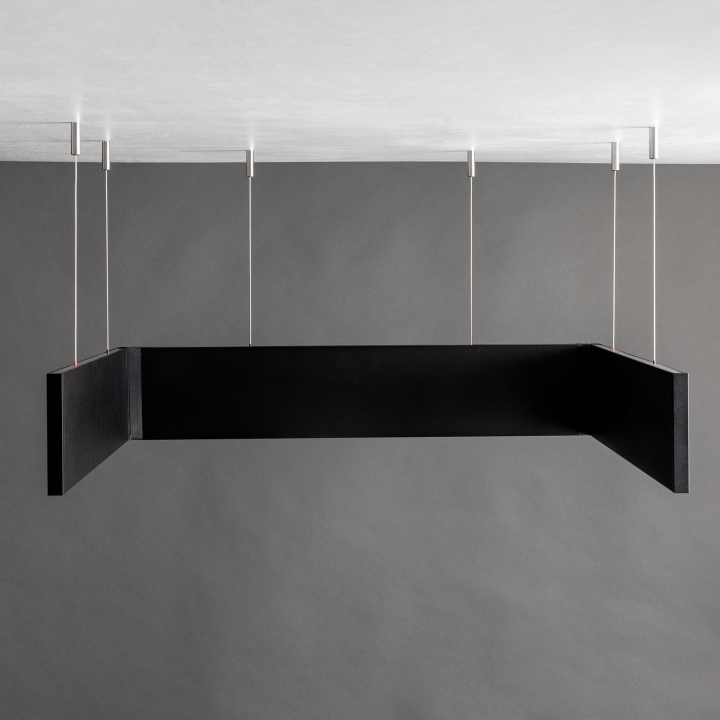 The indirect emission on top of the luminaire offers a linear spread, while the direct emission on the bottom is diffused and offers 1850 lumens. The body is comprised of extruded aluminum with no visible canopy, with the power in the suspension cable.