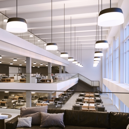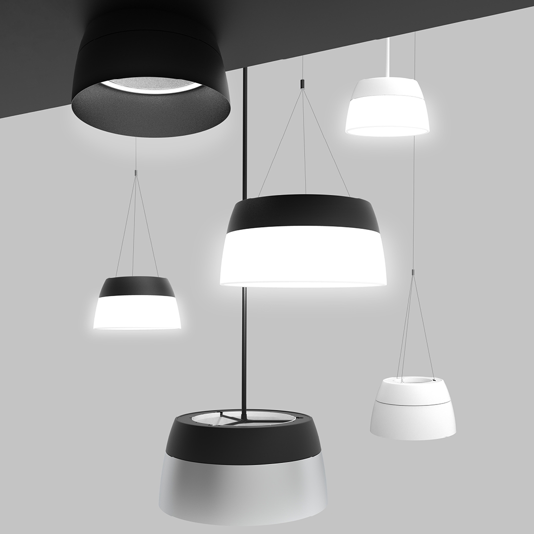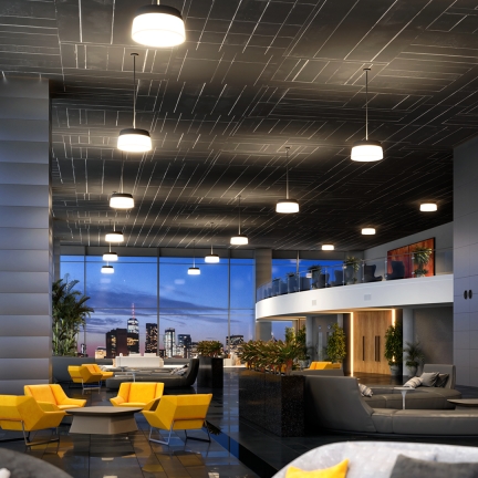 Hollowcore was introduced in early 2020 as a re-think of the traditional high bay pendant. It was designed to optimize and deliver light evenly and where needed with a unique circular LED light engine and an open center concept. Designers may select a lens or aluminum reflector.