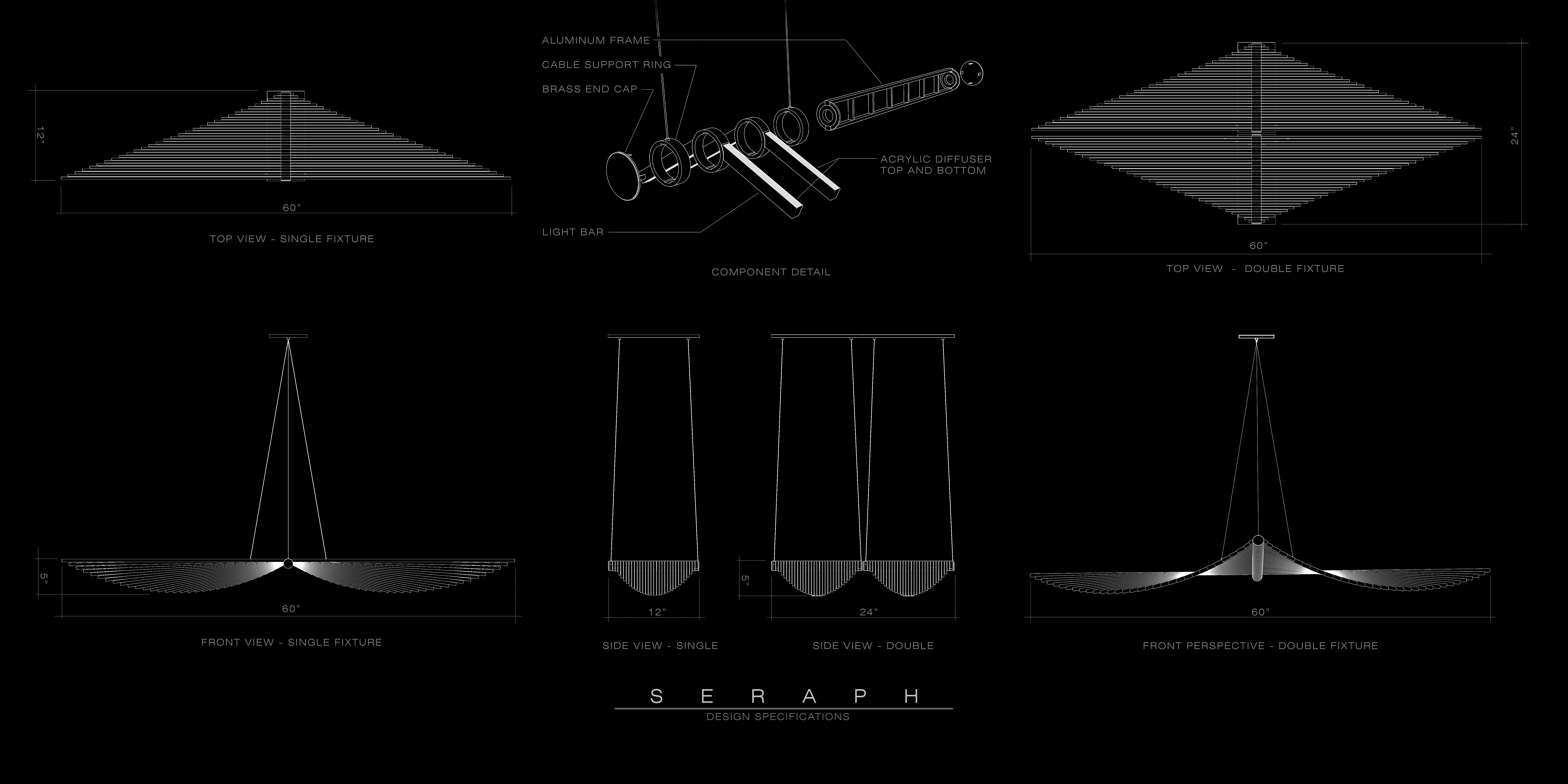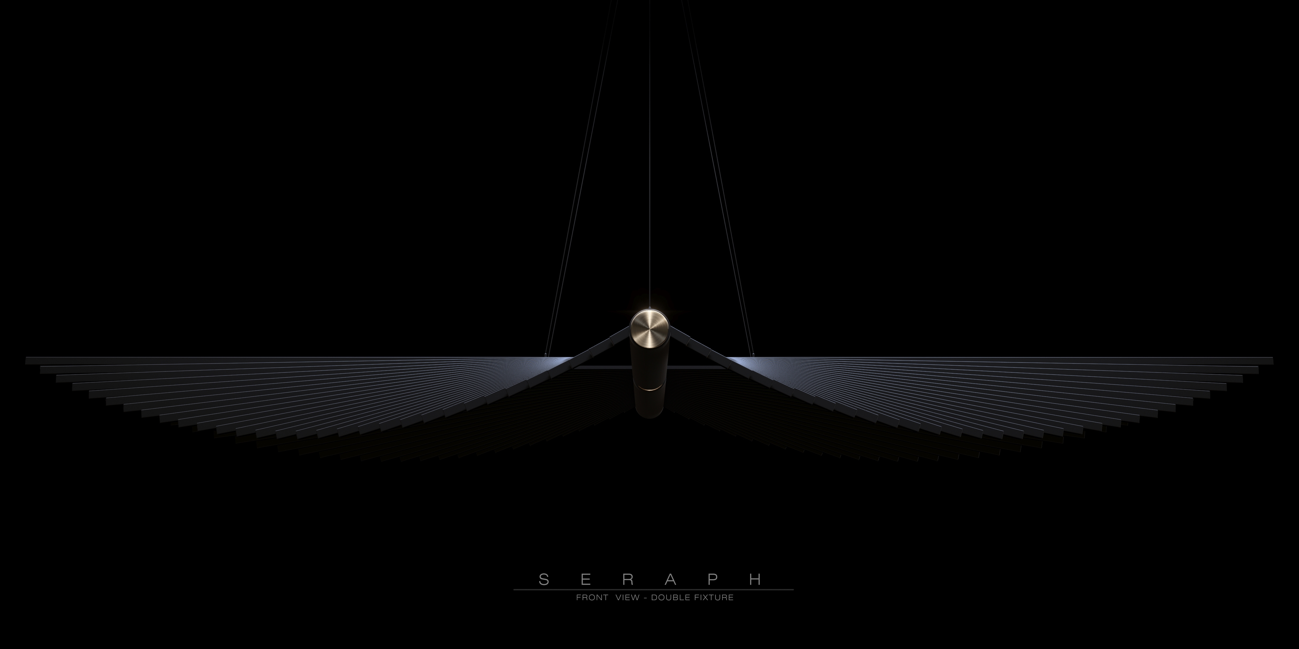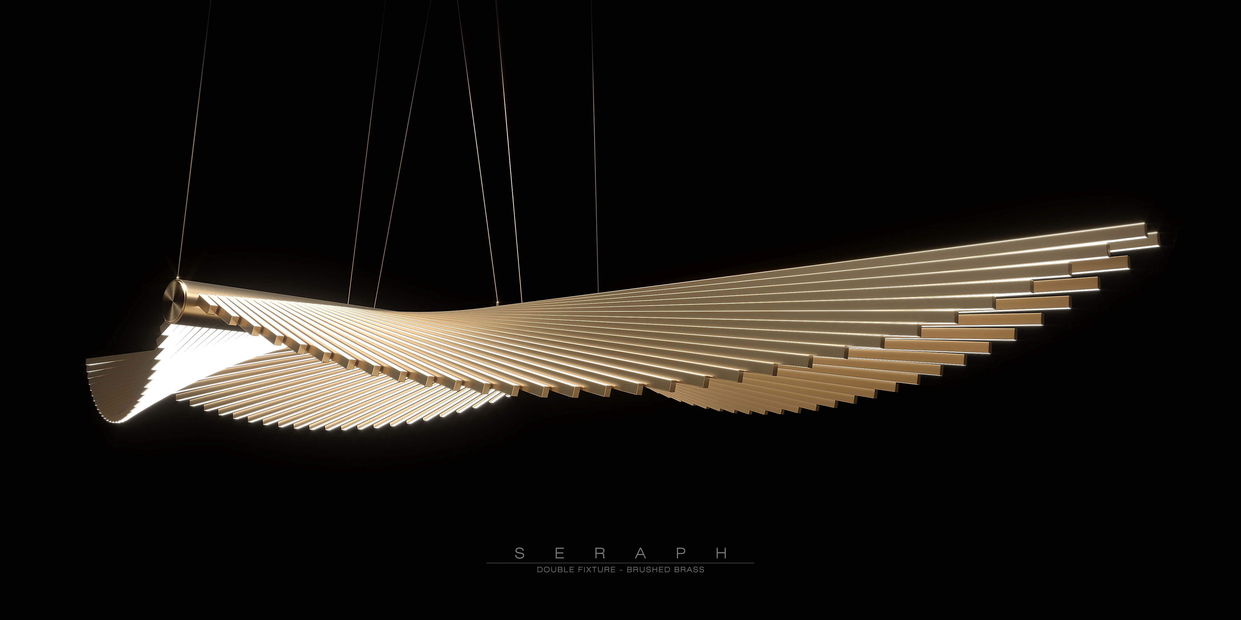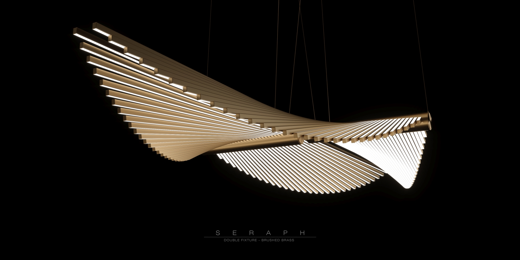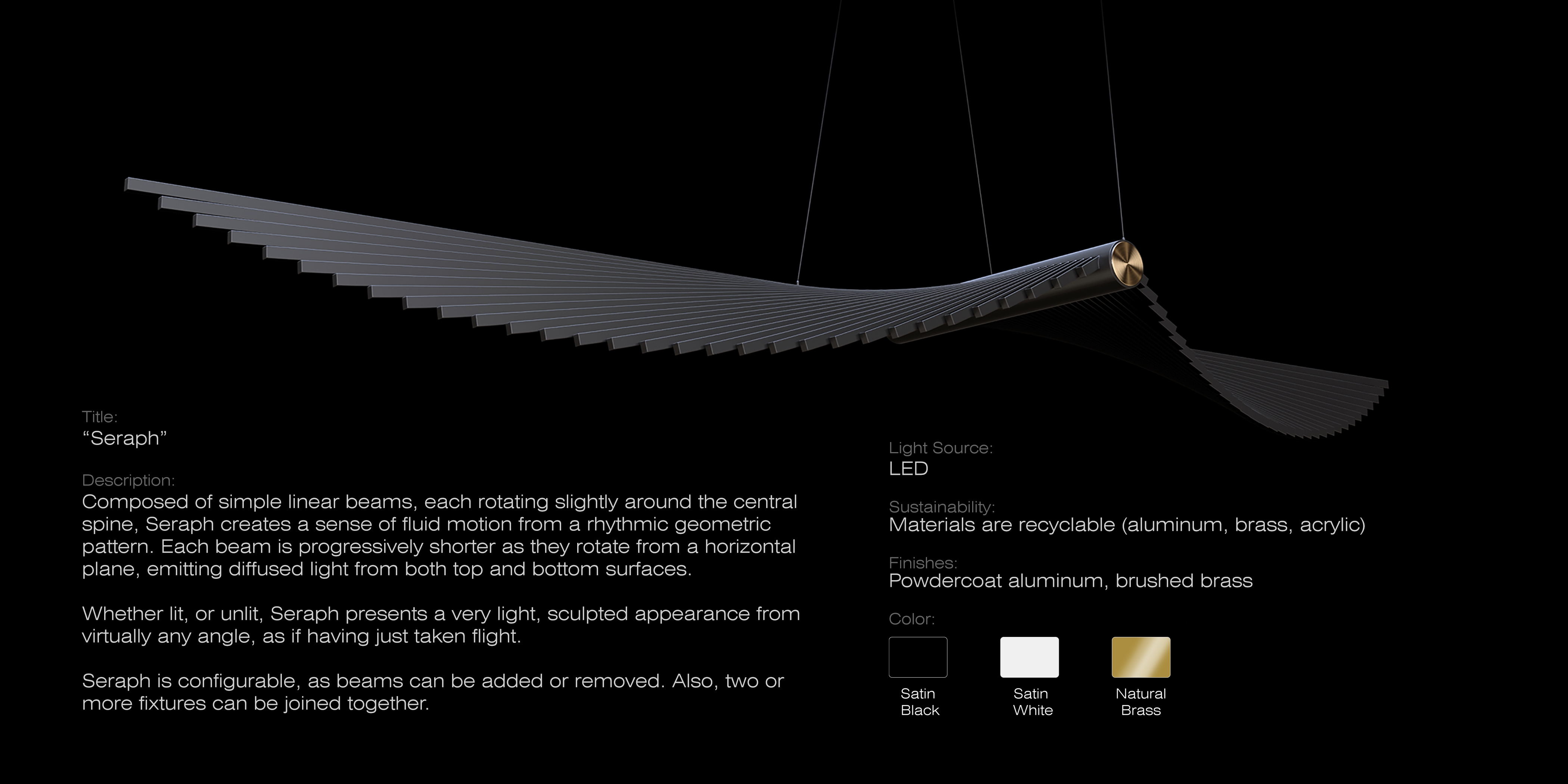 Composed of simple linear beams, each rotating slightly around the central spine, Seraph creates a sense of fluid motion from a rhythmic geometric pattern. Each beam is progressively shorter as they rotate from a horizontal plane, emitting diffused light from both top and bottom surfaces.