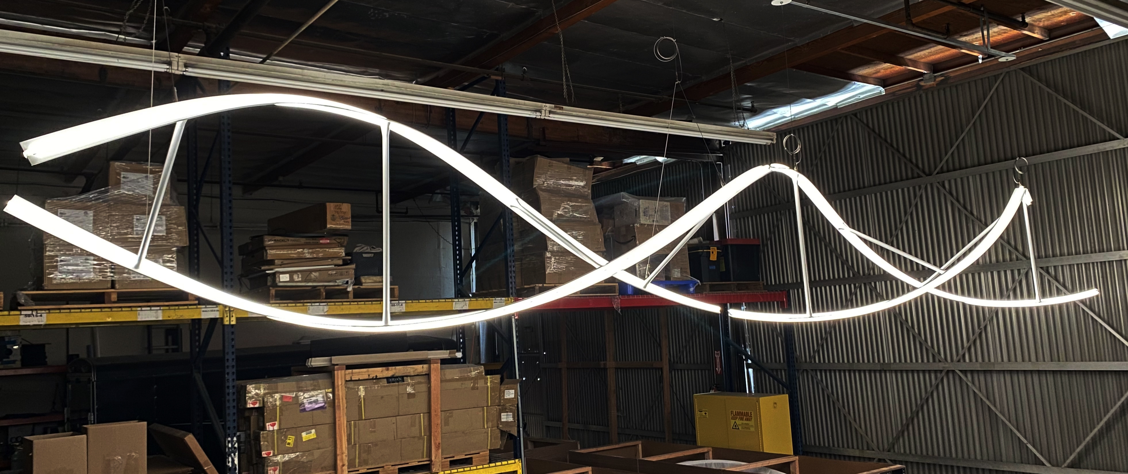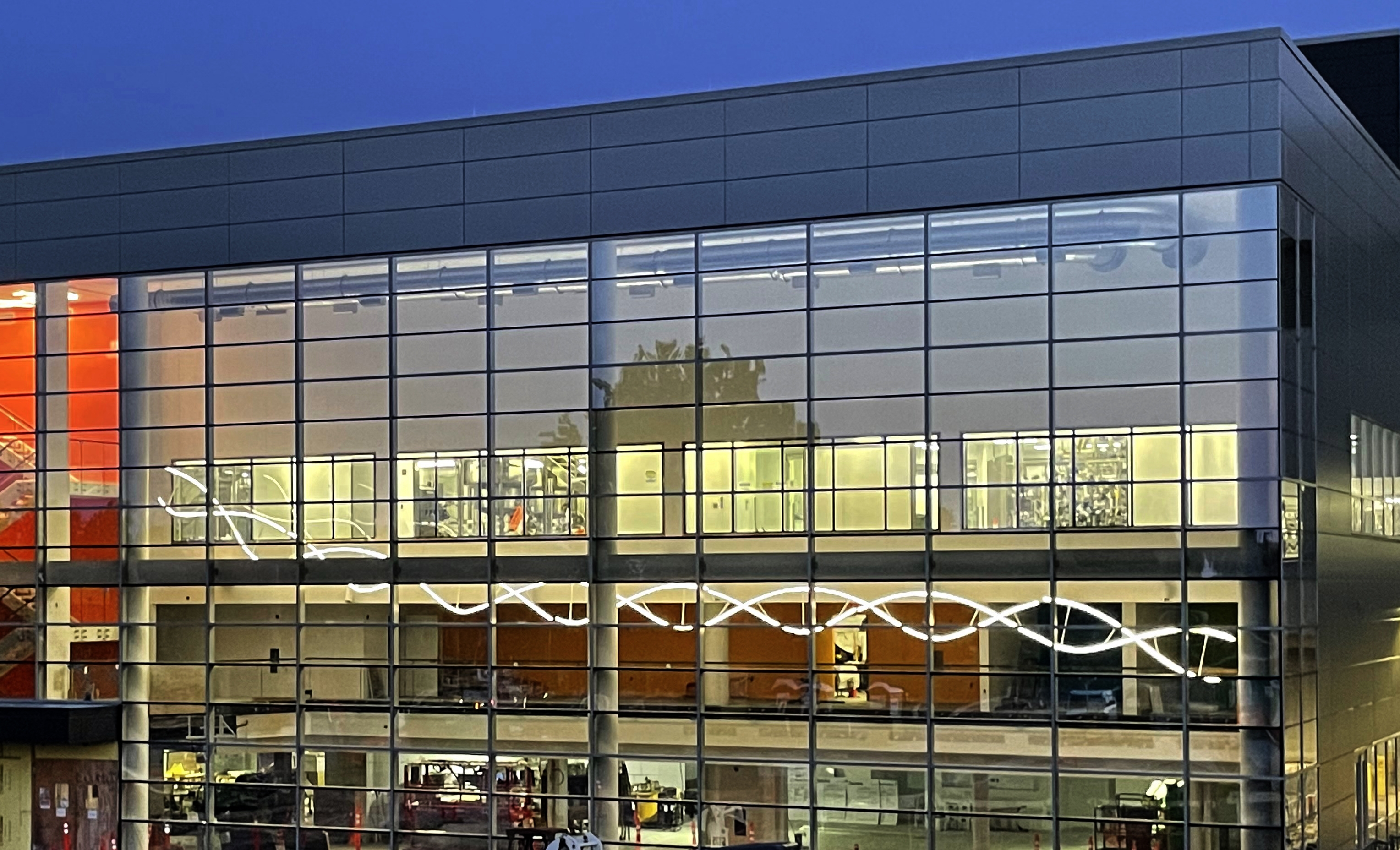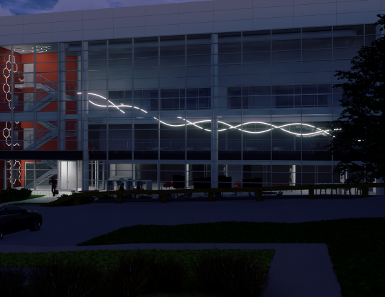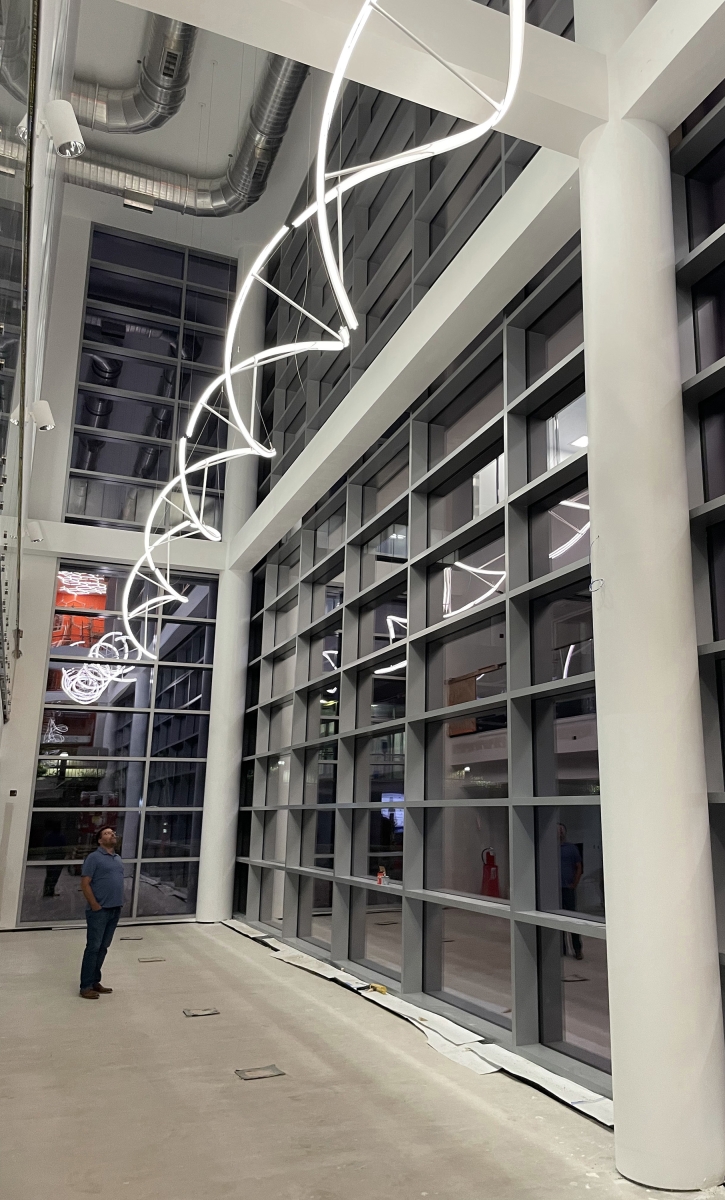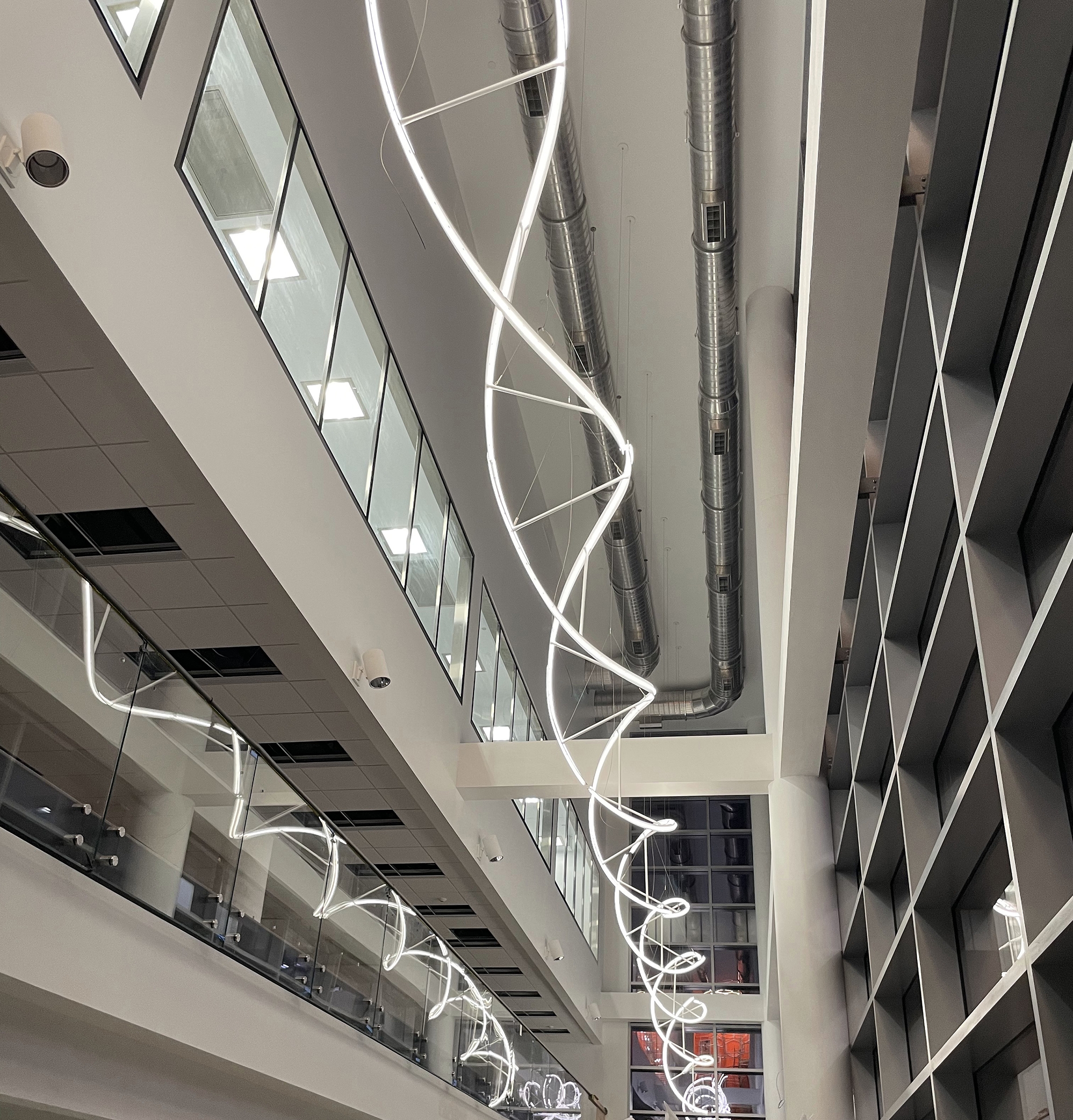 Entry DescriptionPharmaceutical leader GlaxoSmithKline desired a focal point for their manufacturing facility atrium. The goal… mimic a DNA strand on a monumental, 90ft-long scale. Formed from (7) unique 3ft x 12ft-long segments, the Double Helix construct emerges visually as a single undulating entity. Each side rail consists of 2 rolled, sandwiched profiles for rigidity. 1” tubing emulates the cross-hatching of a DNA strand and cleverly provide suspension positions, hidden wire locations & structural support. Power-over-cable minimizes visibility of the suspension apparatus, eliminating unsightly cords. Connection is a breeze via plug-and-play connectors. Silicone profiles are mounted along the top & bottom of each spiraled leg, visually melding the two opposing LED strips into a single, 360-degree illuminated strand and delivering seamless illumination from any viewed angle. Could this be the largest illuminated DNA strand in the world? We’re not sure, but the Double Helix is certainly worthy of GSK’s grand inspirational vision. Floating ethereally through the space, this ambitious design transforms their façade into a welcoming beacon of healing and light.