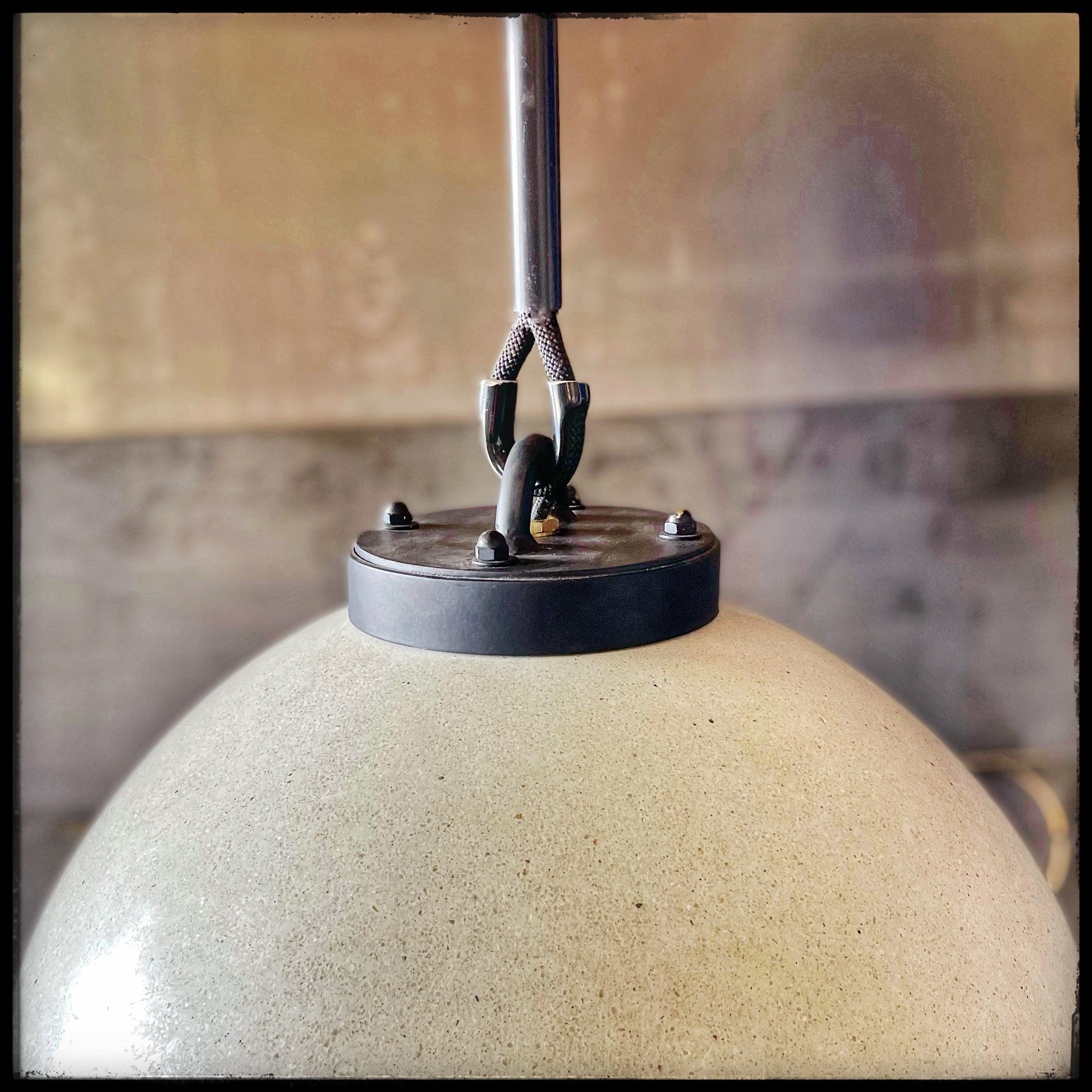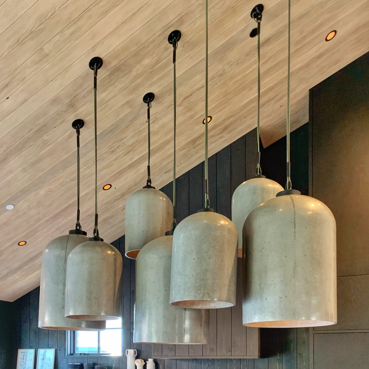 Our concrete fixtures range in size from 24" in diameter and 36" tall down to 12" in diameter and 18" tall. Custom molds and our own custom mix of concrete are used to produce these shapes that are approximate one inch in thickness. The concrete is polished to bring out sand and other organic elements used in our concrete mix. We offer white, natural grey, charcoal and other organic color options to compliment any space they may live in. Also created in house is the custom hardware available in multiple finish options.