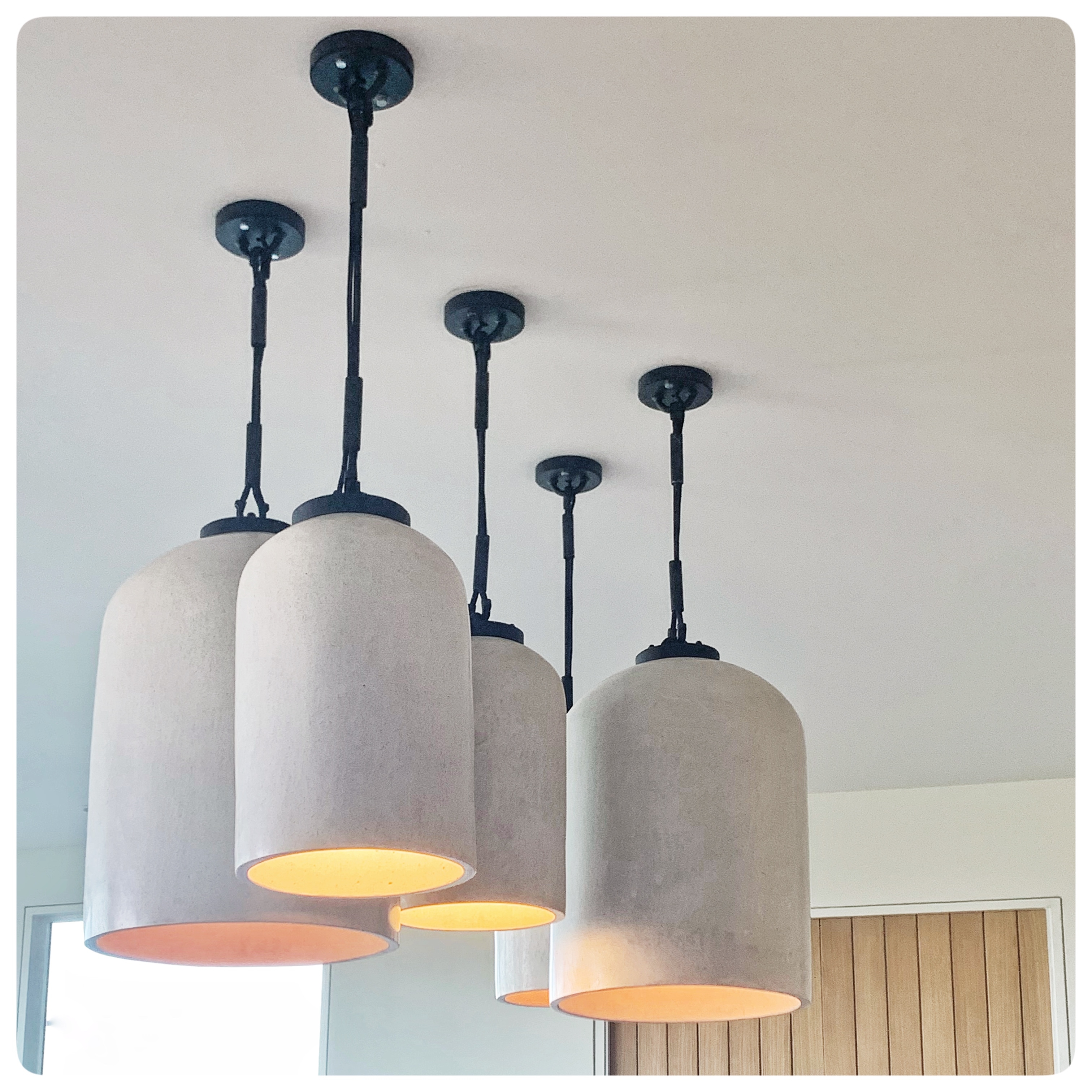 Entry DescriptionWe were invited to design large scale concrete pendants over a kitchen island to create a cozy feeling of a dropped ceiling when gathering around. Prior to fabricating our molds we came to the site with full scale foam core mock ups to play with size and scale in the actual space.
